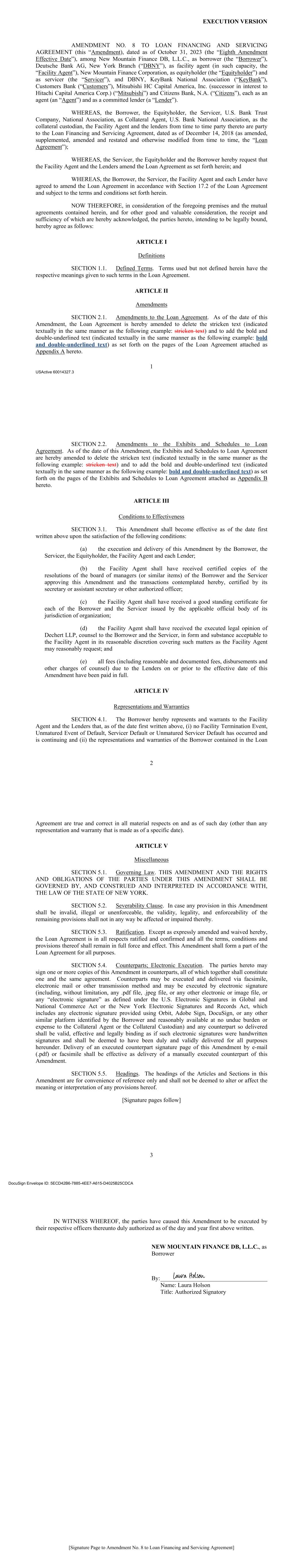 EXECUTION VERSION 1 USActive 60014327.3 AMENDMENT NO. 8 TO LOAN FINANCING AND SERVICING AGREEMENT (this “Amendment), dated as of October 31, 2023 (the “Eighth Amendment Effective Date”), among New Mountain Finance DB, L.L.C., as borrower (the “Borrower”), Deutsche Bank AG, New York Branch (“DBNY”), as facility agent (in such capacity, the “Facility Agent”), New Mountain Finance Corporation, as equityholder (the “Equityholder”) and as servicer (the “Servicer”), and DBNY, KeyBank National Association (“KeyBank”), Customers Bank (“Customers”), Mitsubishi HC Capital America, Inc. (successor in interest to Hitachi Capital America Corp.) (“Mitsubishi”) and Citizens Bank, N.A. (“Citizens”), each as an agent (an “Agent”) and as a committed lender (a “Lender”). WHEREAS, the Borrower, the Equityholder, the Servicer, U.S. Bank Trust Company, National Association, as Collateral Agent, U.S. Bank National Association, as the collateral custodian, the Facility Agent and the lenders from time to time party thereto are party to the Loan Financing and Servicing Agreement, dated as of December 14, 2018 (as amended, supplemented, amended and restated and otherwise modified from time to time, the “Loan Agreement”); WHEREAS, the Servicer, the Equityholder and the Borrower hereby request that the Facility Agent and the Lenders amend the Loan Agreement as set forth herein; and WHEREAS, the Borrower, the Servicer, the Facility Agent and each Lender have agreed to amend the Loan Agreement in accordance with Section 17.2 of the Loan Agreement and subject to the terms and conditions set forth herein. NOW THEREFORE, in consideration of the foregoing premises and the mutual agreements contained herein, and for other good and valuable consideration, the receipt and sufficiency of which are hereby acknowledged, the parties hereto, intending to be legally bound, hereby agree as follows: ARTICLE I Definitions SECTION 1.1. Defined Terms. Terms used but not defined herein have the respective meanings given to such terms in the Loan Agreement. ARTICLE II Amendments SECTION 2.1. Amendments to the Loan Agreement. As of the date of this Amendment, the Loan Agreement is hereby amended to delete the stricken text (indicated textually in the same manner as the following example: stricken text) and to add the bold and double-underlined text (indicated textually in the same manner as the following example: bold and double-underlined text) as set forth on the pages of the Loan Agreement attached as Appendix A hereto. 2 SECTION 2.2. Amendments to the Exhibits and Schedules to Loan Agreement. As of the date of this Amendment, the Exhibits and Schedules to Loan Agreement are hereby amended to delete the stricken text (indicated textually in the same manner as the following example: stricken text) and to add the bold and double-underlined text (indicated textually in the same manner as the following example: bold and double-underlined text) as set forth on the pages of the Exhibits and Schedules to Loan Agreement attached as Appendix B hereto. ARTICLE III Conditions to Effectiveness SECTION 3.1. This Amendment shall become effective as of the date first written above upon the satisfaction of the following conditions: (a) the execution and delivery of this Amendment by the Borrower, the Servicer, the Equityholder, the Facility Agent and each Lender; (b) the Facility Agent shall have received certified copies of the resolutions of the board of managers (or similar items) of the Borrower and the Servicer approving this Amendment and the transactions contemplated hereby, certified by its secretary or assistant secretary or other authorized officer; (c) the Facility Agent shall have received a good standing certificate for each of the Borrower and the Servicer issued by the applicable official body of its jurisdiction of organization; (d) the Facility Agent shall have received the executed legal opinion of Dechert LLP, counsel to the Borrower and the Servicer, in form and substance acceptable to the Facility Agent in its reasonable discretion covering such matters as the Facility Agent may reasonably request; and (e) all fees (including reasonable and documented fees, disbursements and other charges of counsel) due to the Lenders on or prior to the effective date of this Amendment have been paid in full. ARTICLE IV Representations and Warranties SECTION 4.1. The Borrower hereby represents and warrants to the Facility Agent and the Lenders that, as of the date first written above, (i) no Facility Termination Event, Unmatured Event of Default, Servicer Default or Unmatured Servicer Default has occurred and is continuing and (ii) the representations and warranties of the Borrower contained in the Loan 3 Agreement are true and correct in all material respects on and as of such day (other than any representation and warranty that is made as of a specific date). ARTICLE V Miscellaneous SECTION 5.1. Governing Law. THIS AMENDMENT AND THE RIGHTS AND OBLIGATIONS OF THE PARTIES UNDER THIS AMENDMENT SHALL BE GOVERNED BY, AND CONSTRUED AND INTERPRETED IN ACCORDANCE WITH, THE LAW OF THE STATE OF NEW YORK. SECTION 5.2. Severability Clause. In case any provision in this Amendment shall be invalid, illegal or unenforceable, the validity, legality, and enforceability of the remaining provisions shall not in any way be affected or impaired thereby. SECTION 5.3. Ratification. Except as expressly amended and waived hereby, the Loan Agreement is in all respects ratified and confirmed and all the terms, conditions and provisions thereof shall remain in full force and effect. This Amendment shall form a part of the Loan Agreement for all purposes. SECTION 5.4. Counterparts; Electronic Execution. The parties hereto may sign one or more copies of this Amendment in counterparts, all of which together shall constitute one and the same agreement. Counterparts may be executed and delivered via facsimile, electronic ma