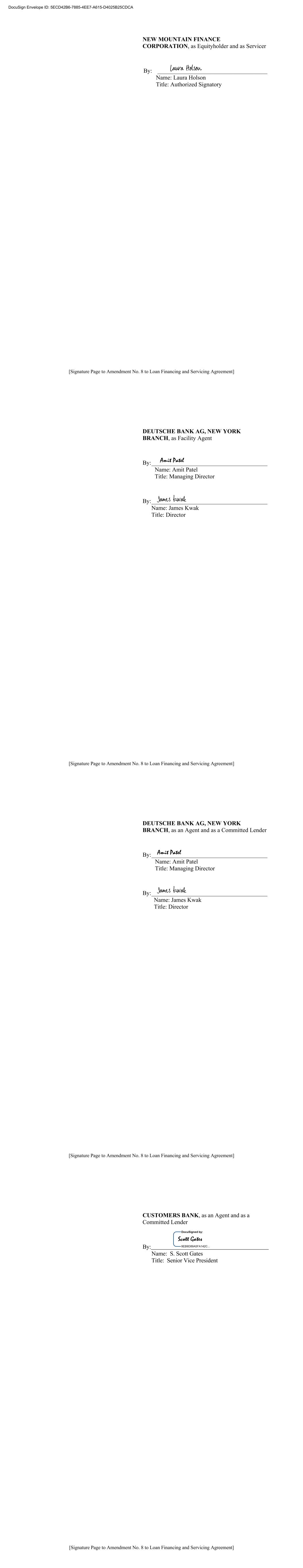 [Signature Page to Amendment No. 8 to Loan Financing and Servicing Agreement] NEW MOUNTAIN FINANCE CORPORATION, as Equityholder and as Servicer By: _____________________________________ Name: Laura Holson Title: Authorized Signatory DocuSign Envelope ID: 5ECD42B6-7885-4EE7-A615-D4025B25CDCA [Signature Page to Amendment No. 8 to Loan Financing and Servicing Agreement] DEUTSCHE BANK AG, NEW YORK BRANCH, as Facility Agent By: _______________________________________ Name: Amit Patel Title: Managing Director By: _______________________________________ Name: James Kwak Title: Director [Signature Page to Amendment No. 8 to Loan Financing and Servicing Agreement] DEUTSCHE BANK AG, NEW YORK BRANCH, as an Agent and as a Committed Lender By: _______________________________________ Name: Amit Patel Title: Managing Director By: _______________________________________ Name: James Kwak Title: Director CUSTOMERS BANK, as an Agent and as a Committed Lender By: Name: S. Scott Gates Title: Senior Vice President [Signature Page to Amendment No. 8 to Loan Financing and Servicing Agreement]