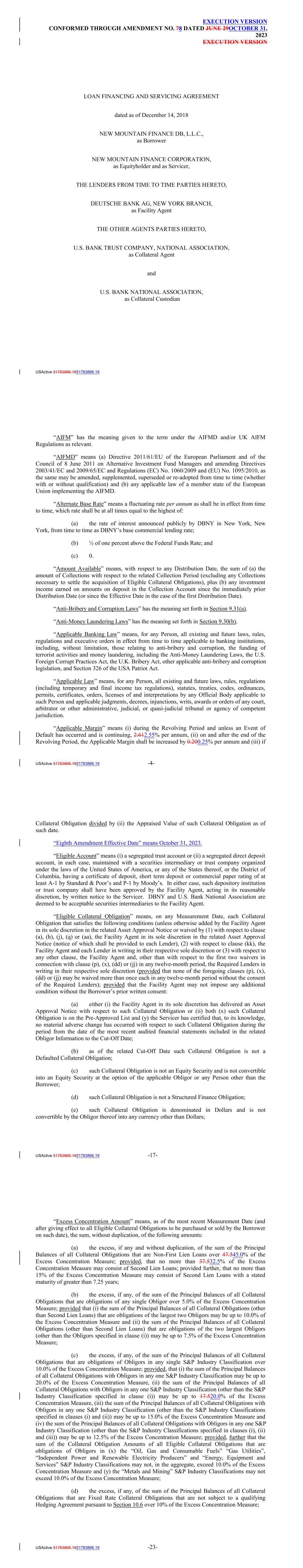 EXECUTION VERSION CONFORMED THROUGH AMENDMENT NO. 78 DATED JUNE 29OCTOBER 31, 2023 EXECUTION VERSION LOAN FINANCING AND SERVICING AGREEMENT dated as of December 14, 2018 NEW MOUNTAIN FINANCE DB, L.L.C., as Borrower NEW MOUNTAIN FINANCE CORPORATION, as Equityholder and as Servicer, THE LENDERS FROM TIME TO TIME PARTIES HERETO, DEUTSCHE BANK AG, NEW YORK BRANCH, as Facility Agent THE OTHER AGENTS PARTIES HERETO, U.S. BANK TRUST COMPANY, NATIONAL ASSOCIATION, as Collateral Agent and U.S. BANK NATIONAL ASSOCIATION, as Collateral Custodian USActive 51783866.1851783866.19 “AIFM” has the meaning given to the term under the AIFMD and/or UK AIFM Regulations as relevant. “AIFMD” means (a) Directive 2011/61/EU of the European Parliament and of the Council of 8 June 2011 on Alternative Investment Fund Managers and amending Directives 2003/41/EC and 2009/65/EC and Regulations (EC) No. 1060/2009 and (EU) No. 1095/2010, as the same may be amended, supplemented, superseded or re-adopted from time to time (whether with or without qualification) and (b) any applicable law of a member state of the European Union implementing the AIFMD. “Alternate Base Rate” means a fluctuating rate per annum as shall be in effect from time to time, which rate shall be at all times equal to the highest of: (a) the rate of interest announced publicly by DBNY in New York, New York, from time to time as DBNY’s base commercial lending rate; (b) ½ of one percent above the Federal Funds Rate; and (c) 0. “Amount Available” means, with respect to any Distribution Date, the sum of (a) the amount of Collections with respect to the related Collection Period (excluding any Collections necessary to settle the acquisition of Eligible Collateral Obligations), plus (b) any investment income earned on amounts on deposit in the Collection Account since the immediately prior Distribution Date (or since the Effective Date in the case of the first Distribution Date). “Anti-Bribery and Corruption Laws” has the meaning set forth in Section 9.31(a). “Anti-Money Laundering Laws” has the meaning set forth in Section 9.30(b). “Applicable Banking Law” means, for any Person, all existing and future laws, rules, regulations and executive orders in effect from time to time applicable to banking institutions, including, without limitation, those relating to anti-bribery and corruption, the funding of terrorist activities and money laundering, including the Anti-Money Laundering Laws, the U.S. Foreign Corrupt Practices Act, the U.K. Bribery Act, other applicable anti-bribery and corruption legislation, and Section 326 of the USA Patriot Act. “Applicable Law” means, for any Person, all existing and future laws, rules, regulations (including temporary and final income tax regulations), statutes, treaties, codes, ordinances, permits, certificates, orders, licenses of and interpretations by any Official Body applicable to such Person and applicable judgments, decrees, injunctions, writs, awards or orders of any court, arbitrator or other administrative, judicial, or quasi-judicial tribunal or agency of competent jurisdiction. “Applicable Margin” means (i) during the Revolving Period and unless an Event of Default has occurred and is continuing, 2.612.55% per annum, (ii) on and after the end of the Revolving Period, the Applicable Margin shall be increased by 0.200.25% per annum and (iii) if USActive 51783866.1851783866.19 -4- Collateral Obligation divided by (ii) the Appraised Value of such Collateral Obligation as of such date. “Eighth Amendment Effective Date” means October 31, 2023. “Eligible Account” means (i) a segregated trust account or (ii) a segregated direct deposit account, in each case, maintained with a securities intermediary or trust company organized under the laws of the United States of America, or any of the States thereof, or the District of Columbia, having a certificate of deposit, short term deposit or commercial paper rating of at least A-1 by Standard & Poor’s and P-1 by Moody’s. In either case, such depository institution or trust company shall have been approved by the Facility Agent, acting in its reasonable discretion, by written notice to the Servicer. DBNY and U.S. Bank National Association are deemed to be acceptable securities intermediaries to the Facility Agent. “Eligible Collateral Obligation” means, on any Measurement Date, each Collateral Obligation that satisfies the following conditions (unless otherwise added by the Facility Agent in its sole discretion in the related Asset Approval Notice or waived by (1) with respect to clause (a), (h), (j), (q) or (aa), the Facility Agent in its sole discretion in the related Asset Approval Notice (notice of which shall be provided to each Lender), (2) with respect to clause (kk), the Facility Agent and each Lender in writing in their respective sole discretion or (3) with respect to any other clause, the Facility Agent and, other than with respect to the first two waivers in connection with clause (p), (x), (dd) or (jj) in any twelve-month period, the Required Lenders in writing in their respective sole discretion (provided that none of the foregoing clauses (p), (x), (dd) or (jj) may be waived more than once each in any twelve-month period without the consent of the Required Lenders); provided that the Facility Agent may not impose any additional condition without the Borrower’s prior written consent: (a) either (i) the Facility Agent in its sole discretion has delivered an Asset Approval Notice with respect to such Collateral Obligation or (ii) both (x) such Collateral Obligation is on the Pre-Approved List and (y) the Servicer has certified that, to its knowledge, no material adverse change has occurred with respect to such Collateral Obligation during the period from the date of the most recent audited financial statements included in the related Obligor Information to the Cut-Off Date; (b) as of the related Cut-Off Date s