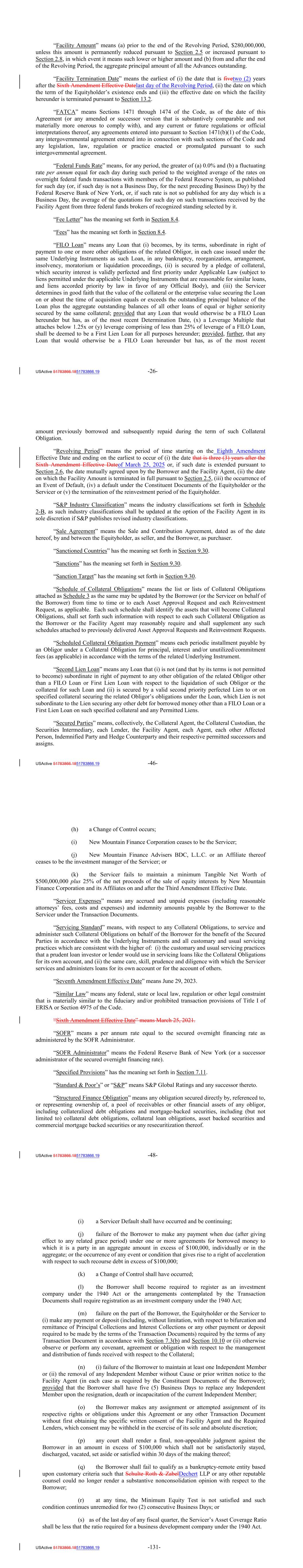 “Facility Amount” means (a) prior to the end of the Revolving Period, $280,000,000, unless this amount is permanently reduced pursuant to Section 2.5 or increased pursuant to Section 2.8, in which event it means such lower or higher amount and (b) from and after the end of the Revolving Period, the aggregate principal amount of all the Advances outstanding. “Facility Termination Date” means the earliest of (i) the date that is fivetwo (2) years after the Sixth Amendment Effective Datelast day of the Revolving Period, (ii) the date on which the term of the Equityholder’s existence ends and (iii) the effective date on which the facility hereunder is terminated pursuant to Section 13.2. “FATCA” means Sections 1471 through 1474 of the Code, as of the date of this Agreement (or any amended or successor version that is substantively comparable and not materially more onerous to comply with), and any current or future regulations or official interpretations thereof, any agreements entered into pursuant to Section 1471(b)(1) of the Code, any intergovernmental agreement entered into in connection with such sections of the Code and any legislation, law, regulation or practice enacted or promulgated pursuant to such intergovernmental agreement. “Federal Funds Rate” means, for any period, the greater of (a) 0.0% and (b) a fluctuating rate per annum equal for each day during such period to the weighted average of the rates on overnight federal funds transactions with members of the Federal Reserve System, as published for such day (or, if such day is not a Business Day, for the next preceding Business Day) by the Federal Reserve Bank of New York, or, if such rate is not so published for any day which is a Business Day, the average of the quotations for such day on such transactions received by the Facility Agent from three federal funds brokers of recognized standing selected by it. “Fee Letter” has the meaning set forth in Section 8.4. “Fees” has the meaning set forth in Section 8.4. “FILO Loan” means any Loan that (i) becomes, by its terms, subordinate in right of payment to one or more other obligations of the related Obligor, in each case issued under the same Underlying Instruments as such Loan, in any bankruptcy, reorganization, arrangement, insolvency, moratorium or liquidation proceedings, (ii) is secured by a pledge of collateral, which security interest is validly perfected and first priority under Applicable Law (subject to liens permitted under the applicable Underlying Instruments that are reasonable for similar loans, and liens accorded priority by law in favor of any Official Body), and (iii) the Servicer determines in good faith that the value of the collateral or the enterprise value securing the Loan on or about the time of acquisition equals or exceeds the outstanding principal balance of the Loan plus the aggregate outstanding balances of all other loans of equal or higher seniority secured by the same collateral; provided that any Loan that would otherwise be a FILO Loan hereunder but has, as of the most recent Determination Date, (x) a Leverage Multiple that attaches below 1.25x or (y) leverage comprising of less than 25% of leverage of a FILO Loan, shall be deemed to be a First Lien Loan for all purposes hereunder; provided, further, that any Loan that would otherwise be a FILO Loan hereunder but has, as of the most recent USActive 51783866.1851783866.19 -26- amount previously borrowed and subsequently repaid during the term of such Collateral Obligation. “Revolving Period” means the period of time starting on the Eighth Amendment Effective Date and ending on the earliest to occur of (i) the date that is three (3) years after the Sixth Amendment Effective Dateof March 25, 2025 or, if such date is extended pursuant to Section 2.6, the date mutually agreed upon by the Borrower and the Facility Agent, (ii) the date on which the Facility Amount is terminated in full pursuant to Section 2.5, (iii) the occurrence of an Event of Default, (iv) a default under the Constituent Documents of the Equityholder or the Servicer or (v) the termination of the reinvestment period of the Equityholder. “S&P Industry Classification” means the industry classifications set forth in Schedule 2-B, as such industry classifications shall be updated at the option of the Facility Agent in its sole discretion if S&P publishes revised industry classifications. “Sale Agreement” means the Sale and Contribution Agreement, dated as of the date hereof, by and between the Equityholder, as seller, and the Borrower, as purchaser. “Sanctioned Countries” has the meaning set forth in Section 9.30. “Sanctions” has the meaning set forth in Section 9.30. “Sanction Target” has the meaning set forth in Section 9.30. “Schedule of Collateral Obligations” means the list or lists of Collateral Obligations attached as Schedule 3 as the same may be updated by the Borrower (or the Servicer on behalf of the Borrower) from time to time or to each Asset Approval Request and each Reinvestment Request, as applicable. Each such schedule shall identify the assets that will become Collateral Obligations, shall set forth such information with respect to each such Collateral Obligation as the Borrower or the Facility Agent may reasonably require and shall supplement any such schedules attached to previously delivered Asset Approval Requests and Reinvestment Requests. “Scheduled Collateral Obligation Payment” means each periodic installment payable by an Obligor under a Collateral Obligation for principal, interest and/or unutilized/commitment fees (as applicable) in accordance with the terms of the related Underlying Instrument. “Second Lien Loan” means any Loan that (i) is not (and that by its terms is not permitted to become) subordinate in right of payment to any other obligation of the related Obligor other than a FILO Loan or First Lien Loan with respect to the liquidatio