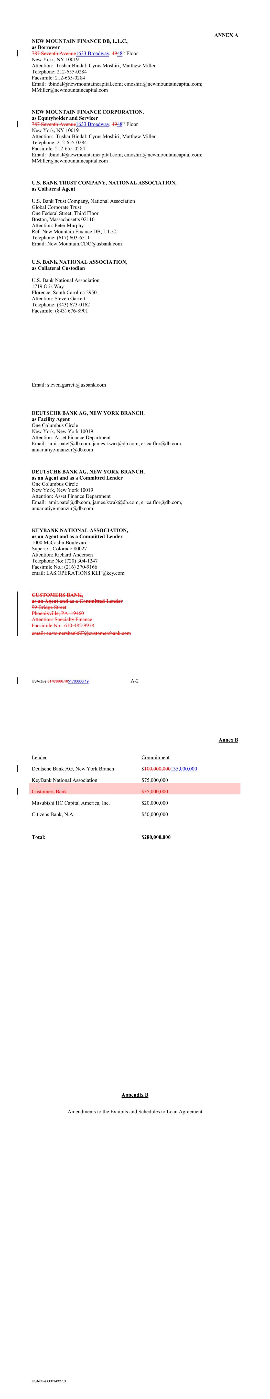 ANNEX A NEW MOUNTAIN FINANCE DB, L.L.C., as Borrower 787 Seventh Avenue1633 Broadway, 4948th Floor New York, NY 10019 Attention: Tushar Bindal; Cyrus Moshiri; Matthew Miller Telephone: 212-655-0284 Facsimile: 212-655-0284 Email: tbindal@newmountaincapital.com; cmoshiri@newmountaincapital.com; MMiller@newmountaincapital.com NEW MOUNTAIN FINANCE CORPORATION, as Equityholder and Servicer 787 Seventh Avenue1633 Broadway, 4948th Floor New York, NY 10019 Attention: Tushar Bindal; Cyrus Moshiri; Matthew Miller Telephone: 212-655-0284 Facsimile: 212-655-0284 Email: tbindal@newmountaincapital.com; cmoshiri@newmountaincapital.com; MMiller@newmountaincapital.com U.S. BANK TRUST COMPANY, NATIONAL ASSOCIATION, as Collateral Agent U.S. Bank Trust Company, National Association Global Corporate Trust One Federal Street, Third Floor Boston, Massachusetts 02110 Attention: Peter Murphy Ref: New Mountain Finance DB, L.L.C. Telephone: (617) 603-6511 Email: New.Mountain.CDO@usbank.com U.S. BANK NATIONAL ASSOCIATION, as Collateral Custodian U.S. Bank National Association 1719 Otis Way Florence, South Carolina 29501 Attention: Steven Garrett Telephone: (843) 673-0162 Facsimile: (843) 676-8901 Email: steven.garrett@usbank.com DEUTSCHE BANK AG, NEW YORK BRANCH, as Facility Agent One Columbus Circle New York, New York 10019 Attention: Asset Finance Department Email: amit.patel@db.com, james.kwak@db.com, erica.flor@db.com, anuar.atiye-manzur@db.com DEUTSCHE BANK AG, NEW YORK BRANCH, as an Agent and as a Committed Lender One Columbus Circle New York, New York 10019 Attention: Asset Finance Department Email: amit.patel@db.com, james.kwak@db.com, erica.flor@db.com, anuar.atiye-manzur@db.com KEYBANK NATIONAL ASSOCIATION, as an Agent and as a Committed Lender 1000 McCaslin Boulevard Superior, Colorado 80027 Attention: Richard Andersen Telephone No: (720) 304-1247 Facsimile No.: (216) 370-9166 email: LAS.OPERATIONS.KEF@key.com CUSTOMERS BANK, as an Agent and as a Committed Lender 99 Bridge Street Phoenixville, PA 19460 Attention: Specialty Finance Facsimile No.: 610-482-9978 email: customersbankSF@customersbank.com USActive 51783866.1851783866.19 A-2 $35,000,000 Deutsche Bank AG, New York Branch Mitsubishi HC Capital America, Inc. $100,000,000135,000,000 $20,000,000 Lender Citizens Bank, N.A. $50,000,000 KeyBank National Association Commitment $75,000,000 Annex B Total: $280,000,000 Customers Bank USActive 60014327.3 Appendix B Amendments to the Exhibits and Schedules to Loan Agreement
