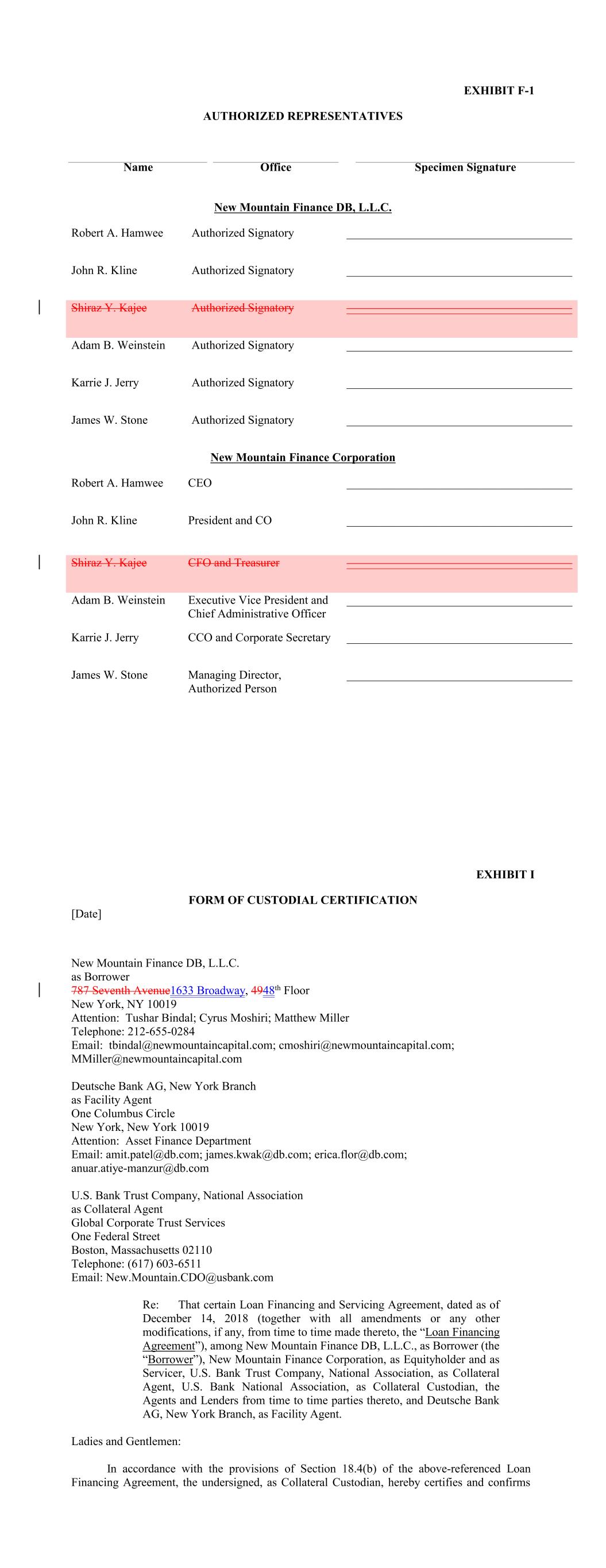 James W. Stone Authorized Signatory Authorized Signatory ______________________________________ ______________________________________ New Mountain Finance DB, L.L.C. New Mountain Finance Corporation Name Robert A. Hamwee Shiraz Y. Kajee CEO ______________________________________ Authorized Signatory John R. Kline ______________________________________ President and CO Robert A. Hamwee ______________________________________ Office Shiraz Y. Kajee Adam B. Weinstein CFO and Treasurer Authorized Signatory ______________________________________ Authorized Signatory EXHIBIT F-1 AUTHORIZED REPRESENTATIVES Adam B. Weinstein ______________________________________ Executive Vice President and Chief Administrative Officer ______________________________________ ______________________________________ Specimen Signature Karrie J. Jerry Karrie J. Jerry CCO and Corporate Secretary ______________________________________ Authorized Signatory James W. Stone ______________________________________ Managing Director, Authorized Person John R. Kline ______________________________________ EXHIBIT I FORM OF CUSTODIAL CERTIFICATION [Date] New Mountain Finance DB, L.L.C. as Borrower 787 Seventh Avenue1633 Broadway, 4948th Floor New York, NY 10019 Attention: Tushar Bindal; Cyrus Moshiri; Matthew Miller Telephone: 212-655-0284 Email: tbindal@newmountaincapital.com; cmoshiri@newmountaincapital.com; MMiller@newmountaincapital.com Deutsche Bank AG, New York Branch as Facility Agent One Columbus Circle New York, New York 10019 Attention: Asset Finance Department Email: amit.patel@db.com; james.kwak@db.com; erica.flor@db.com; anuar.atiye-manzur@db.com U.S. Bank Trust Company, National Association as Collateral Agent Global Corporate Trust Services One Federal Street Boston, Massachusetts 02110 Telephone: (617) 603-6511 Email: New.Mountain.CDO@usbank.com Re: That certain Loan Financing and Servicing Agreement, dated as of December 14, 2018 (together with all amendments or any other modifications, if any, from time to time made thereto, the “Loan Financing Agreement”), among New Mountain Finance DB, L.L.C., as Borrower (the “Borrower”), New Mountain Finance Corporation, as Equityholder and as Servicer, U.S. Bank Trust Company, National Association, as Collateral Agent, U.S. Bank National Association, as Collateral Custodian, the Agents and Lenders from time to time parties thereto, and Deutsche Bank AG, New York Branch, as Facility Agent. Ladies and Gentlemen: In accordance with the provisions of Section 18.4(b) of the above-referenced Loan Financing Agreement, the undersigned, as Collateral Custodian, hereby certifies and confirms