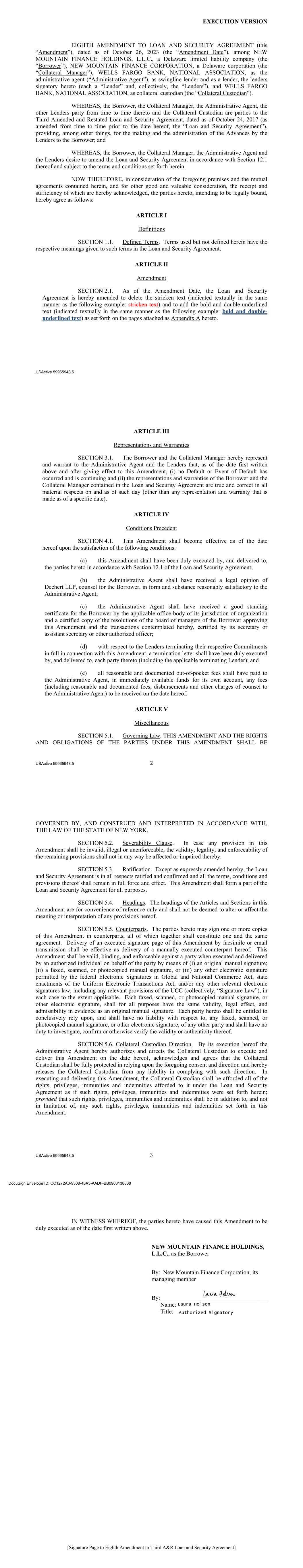 EXECUTION VERSION USActive 59965948.5 EIGHTH AMENDMENT TO LOAN AND SECURITY AGREEMENT (this “Amendment”), dated as of October 26, 2023 (the “Amendment Date”), among NEW MOUNTAIN FINANCE HOLDINGS, L.L.C., a Delaware limited liability company (the “Borrower”), NEW MOUNTAIN FINANCE CORPORATION, a Delaware corporation (the “Collateral Manager”), WELLS FARGO BANK, NATIONAL ASSOCIATION, as the administrative agent (“Administrative Agent”), as swingline lender and as a lender, the lenders signatory hereto (each a “Lender” and, collectively, the “Lenders”), and WELLS FARGO BANK, NATIONAL ASSOCIATION, as collateral custodian (the “Collateral Custodian”). WHEREAS, the Borrower, the Collateral Manager, the Administrative Agent, the other Lenders party from time to time thereto and the Collateral Custodian are parties to the Third Amended and Restated Loan and Security Agreement, dated as of October 24, 2017 (as amended from time to time prior to the date hereof, the “Loan and Security Agreement”), providing, among other things, for the making and the administration of the Advances by the Lenders to the Borrower; and WHEREAS, the Borrower, the Collateral Manager, the Administrative Agent and the Lenders desire to amend the Loan and Security Agreement in accordance with Section 12.1 thereof and subject to the terms and conditions set forth herein. NOW THEREFORE, in consideration of the foregoing premises and the mutual agreements contained herein, and for other good and valuable consideration, the receipt and sufficiency of which are hereby acknowledged, the parties hereto, intending to be legally bound, hereby agree as follows: ARTICLE I Definitions SECTION 1.1. Defined Terms. Terms used but not defined herein have the respective meanings given to such terms in the Loan and Security Agreement. ARTICLE II Amendment SECTION 2.1. As of the Amendment Date, the Loan and Security Agreement is hereby amended to delete the stricken text (indicated textually in the same manner as the following example: stricken text) and to add the bold and double-underlined text (indicated textually in the same manner as the following example: bold and double- underlined text) as set forth on the pages attached as Appendix A hereto. USActive 59965948.5 2 ARTICLE III Representations and Warranties SECTION 3.1. The Borrower and the Collateral Manager hereby represent and warrant to the Administrative Agent and the Lenders that, as of the date first written above and after giving effect to this Amendment, (i) no Default or Event of Default has occurred and is continuing and (ii) the representations and warranties of the Borrower and the Collateral Manager contained in the Loan and Security Agreement are true and correct in all material respects on and as of such day (other than any representation and warranty that is made as of a specific date). ARTICLE IV Conditions Precedent SECTION 4.1. This Amendment shall become effective as of the date hereof upon the satisfaction of the following conditions: (a) this Amendment shall have been duly executed by, and delivered to, the parties hereto in accordance with Section 12.1 of the Loan and Security Agreement; (b) the Administrative Agent shall have received a legal opinion of Dechert LLP, counsel for the Borrower, in form and substance reasonably satisfactory to the Administrative Agent; (c) the Administrative Agent shall have received a good standing certificate for the Borrower by the applicable office body of its jurisdiction of organization and a certified copy of the resolutions of the board of managers of the Borrower approving this Amendment and the transactions contemplated hereby, certified by its secretary or assistant secretary or other authorized officer; (d) with respect to the Lenders terminating their respective Commitments in full in connection with this Amendment, a termination letter shall have been duly executed by, and delivered to, each party thereto (including the applicable terminating Lender); and (e) all reasonable and documented out-of-pocket fees shall have paid to the Administrative Agent, in immediately available funds for its own account, any fees (including reasonable and documented fees, disbursements and other charges of counsel to the Administrative Agent) to be received on the date hereof. ARTICLE V Miscellaneous SECTION 5.1. Governing Law. THIS AMENDMENT AND THE RIGHTS AND OBLIGATIONS OF THE PARTIES UNDER THIS AMENDMENT SHALL BE USActive 59965948.5 3 GOVERNED BY, AND CONSTRUED AND INTERPRETED IN ACCORDANCE WITH, THE LAW OF THE STATE OF NEW YORK. SECTION 5.2. Severability Clause. In case any provision in this Amendment shall be invalid, illegal or unenforceable, the validity, legality, and enforceability of the remaining provisions shall not in any way be affected or impaired thereby. SECTION 5.3. Ratification. Except as expressly amended hereby, the Loan and Security Agreement is in all respects ratified and confirmed and all the terms, conditions and provisions thereof shall remain in full force and effect. This Amendment shall form a part of the Loan and Security Agreement for all purposes. SECTION 5.4. Headings. The headings of the Articles and Sections in this Amendment are for convenience of reference only and shall not be deemed to alter or affect the meaning or interpretation of any provisions hereof. SECTION 5.5. Counterparts. The parties hereto may sign one or more copies of this Amendment in counterparts, all of which together shall constitute one and the same agreement. Delivery of an executed signature page of this Amendment by facsimile or email transmission shall be effective as delivery of a manually executed counterpart hereof. This Amendment shall be valid, binding, and enforceable against a party when executed and delivered by an authorized individual on behalf of the party by means of (i) an original manual signature; (ii) a faxed, scanned, or photocopied manual signature, or (iii) any other e