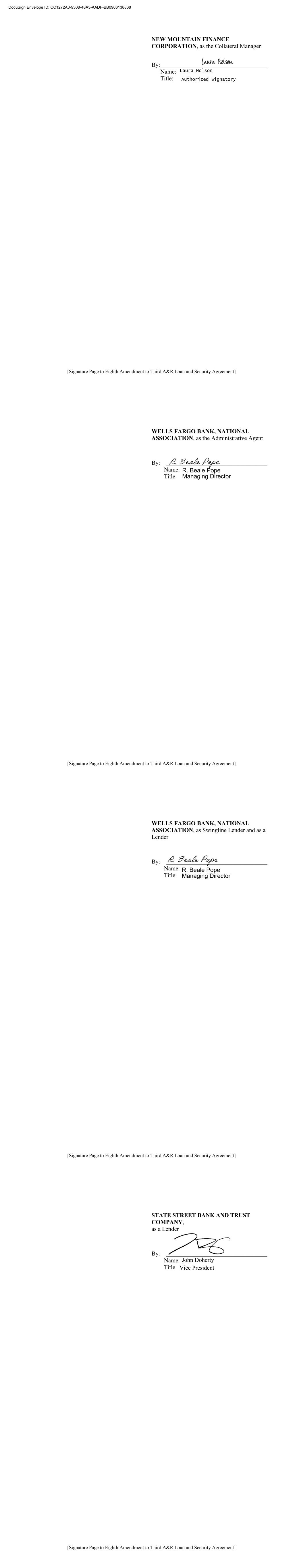 [Signature Page to Eighth Amendment to Third A&R Loan and Security Agreement] NEW MOUNTAIN FINANCE CORPORATION, as the Collateral Manager By:____________________________________ Name: Title: DocuSign Envelope ID: CC1272A0-9308-48A3-AADF-BB0903138868 Authorized Signatory Laura Holson [Signature Page to Eighth Amendment to Third A&R Loan and Security Agreement] WELLS FARGO BANK, NATIONAL ASSOCIATION, as the Administrative Agent By: __________________________________ Name: Title: R. Beale Pope Managing Director [Signature Page to Eighth Amendment to Third A&R Loan and Security Agreement] WELLS FARGO BANK, NATIONAL ASSOCIATION, as Swingline Lender and as a Lender By: __________________________________ Name: Title: R. Beale Pope Managing Director [Signature Page to Eighth Amendment to Third A&R Loan and Security Agreement] STATE STREET BANK AND TRUST COMPANY, as a Lender By: __________________________________ Name: Title: John Doherty Vice President
