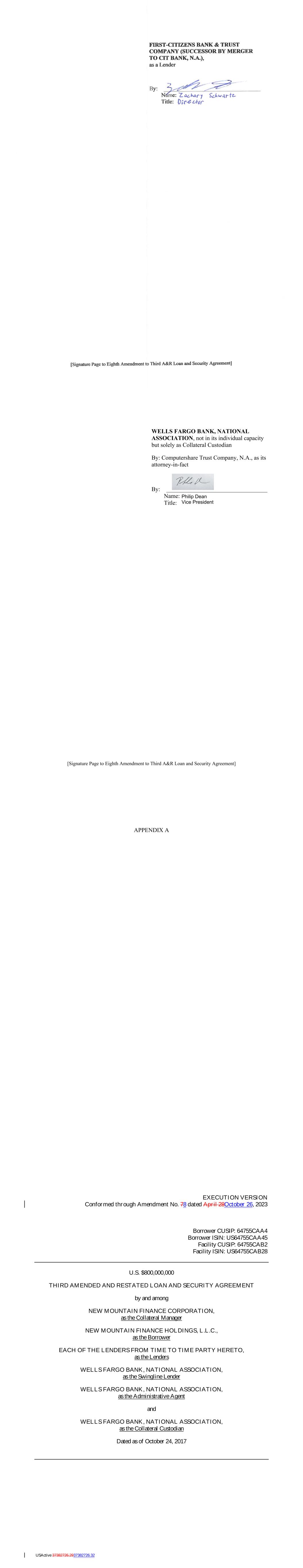 [Signature Page to Eighth Amendment to Third A&R Loan and Security Agreement] WELLS FARGO BANK, NATIONAL ASSOCIATION, not in its individual capacity but solely as Collateral Custodian By: Computershare Trust Company, N.A., as its attorney-in-fact By: __________________________________ Name: Title: APPENDIX A EXECUTION VERSION Conformed through Amendment No. 78 dated April 28October 26, 2023 Borrower CUSIP: 64755CAA4 Borrower ISIN: US64755CAA45 Facility CUSIP: 64755CAB2 Facility ISIN: US64755CAB28 U.S. $800,000,000 THIRD AMENDED AND RESTATED LOAN AND SECURITY AGREEMENT by and among NEW MOUNTAIN FINANCE CORPORATION, as the Collateral Manager NEW MOUNTAIN FINANCE HOLDINGS, L.L.C., as the Borrower EACH OF THE LENDERS FROM TIME TO TIME PARTY HERETO, as the Lenders WELLS FARGO BANK, NATIONAL ASSOCIATION, as the Swingline Lender WELLS FARGO BANK, NATIONAL ASSOCIATION, as the Administrative Agent and WELLS FARGO BANK, NATIONAL ASSOCIATION, as the Collateral Custodian Dated as of October 24, 2017 USActive 37382726.2937382726.32