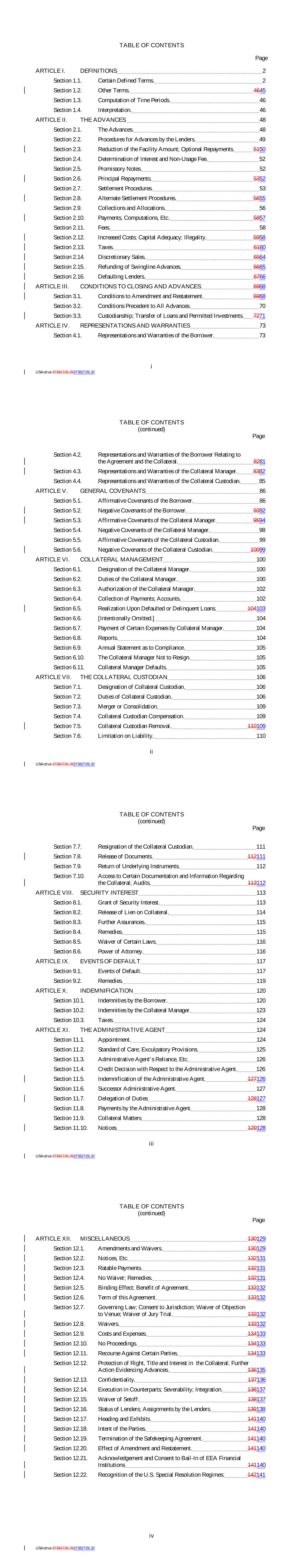 TABLE OF CONTENTS Page ARTICLE I. DEFINITIONS 2 Section 1.1. Certain Defined Terms. 2 Section 1.2. Other Terms. 4645 Section 1.3. Computation of Time Periods. 46 Section 1.4. Interpretation. 46 ARTICLE II. THE ADVANCES 48 Section 2.1. The Advances. 48 Section 2.2. Procedures for Advances by the Lenders. 49 Section 2.3. Reduction of the Facility Amount; Optional Repayments. 5150 Section 2.4. Determination of Interest and Non-Usage Fee. 52 Section 2.5. Promissory Notes. 52 Section 2.6. Principal Repayments. 5352 Section 2.7. Settlement Procedures. 53 Section 2.8. Alternate Settlement Procedures. 5655 Section 2.9. Collections and Allocations. 56 Section 2.10. Payments, Computations, Etc. 5857 Section 2.11. Fees. 58 Section 2.12. Increased Costs; Capital Adequacy; Illegality. 5958 Section 2.13. Taxes. 6160 Section 2.14. Discretionary Sales. 6564 Section 2.15. Refunding of Swingline Advances. 6665 Section 2.16. Defaulting Lenders. 6766 ARTICLE III. CONDITIONS TO CLOSING AND ADVANCES 6968 Section 3.1. Conditions to Amendment and Restatement. 6968 Section 3.2. Conditions Precedent to All Advances. 70 Section 3.3. Custodianship; Transfer of Loans and Permitted Investments. 7271 ARTICLE IV. REPRESENTATIONS AND WARRANTIES 73 Section 4.1. Representations and Warranties of the Borrower. 73 i USActive 37382726.2937382726.32 TABLE OF CONTENTS (continued) Page Section 4.2. Representations and Warranties of the Borrower Relating to the Agreement and the Collateral. 8281 Section 4.3. Representations and Warranties of the Collateral Manager. 8382 Section 4.4. Representations and Warranties of the Collateral Custodian. 85 ARTICLE V. GENERAL COVENANTS 86 Section 5.1. Affirmative Covenants of the Borrower. 86 Section 5.2. Negative Covenants of the Borrower. 9392 Section 5.3. Affirmative Covenants of the Collateral Manager. 9594 Section 5.4. Negative Covenants of the Collateral Manager. 98 Section 5.5. Affirmative Covenants of the Collateral Custodian. 99 Section 5.6. Negative Covenants of the Collateral Custodian. 10099 ARTICLE VI. COLLATERAL MANAGEMENT 100 Section 6.1. Designation of the Collateral Manager. 100 Section 6.2. Duties of the Collateral Manager. 100 Section 6.3. Authorization of the Collateral Manager. 102 Section 6.4. Collection of Payments; Accounts. 102 Section 6.5. Realization Upon Defaulted or Delinquent Loans. 104103 Section 6.6. [Intentionally Omitted.] 104 Section 6.7. Payment of Certain Expenses by Collateral Manager. 104 Section 6.8. Reports. 104 Section 6.9. Annual Statement as to Compliance. 105 Section 6.10. The Collateral Manager Not to Resign. 105 Section 6.11. Collateral Manager Defaults. 105 ARTICLE VII. THE COLLATERAL CUSTODIAN 106 Section 7.1. Designation of Collateral Custodian. 106 Section 7.2. Duties of Collateral Custodian. 106 Section 7.3. Merger or Consolidation. 109 Section 7.4. Collateral Custodian Compensation. 109 Section 7.5. Collateral Custodian Removal. 110109 Section 7.6. Limitation on Liability. 110 ii USActive 37382726.2937382726.32 TABLE OF CONTENTS (continued) Page Section 7.7. Resignation of the Collateral Custodian. 111 Section 7.8. Release of Documents. 112111 Section 7.9. Return of Underlying Instruments. 112 Section 7.10. Access to Certain Documentation and Information Regarding the Collateral; Audits. 113112 ARTICLE VIII. SECURITY INTEREST 113 Section 8.1. Grant of Security Interest. 113 Section 8.2. Release of Lien on Collateral. 114 Section 8.3. Further Assurances. 115 Section 8.4. Remedies. 115 Section 8.5. Waiver of Certain Laws. 116 Section 8.6. Power of Attorney. 116 ARTICLE IX. EVENTS OF DEFAULT 117 Section 9.1. Events of Default. 117 Section 9.2. Remedies. 119 ARTICLE X. INDEMNIFICATION 120 Section 10.1. Indemnities by the Borrower. 120 Section 10.2. Indemnities by the Collateral Manager. 123 Section 10.3. Taxes. 124 ARTICLE XI. THE ADMINISTRATIVE AGENT 124 Section 11.1. Appointment. 124 Section 11.2. Standard of Care; Exculpatory Provisions. 125 Section 11.3. Administrative Agent’s Reliance, Etc. 126 Section 11.4. Credit Decision with Respect to the Administrative Agent. 126 Section 11.5. Indemnification of the Administrative Agent. 127126 Section 11.6. Successor Administrative Agent. 127 Section 11.7. Delegation of Duties 128127 Section 11.8. Payments by the Administrative Agent. 128 Section 11.9. Collateral Matters 128 Section 11.10. Notices 129128 iii USActive 37382726.2937382726.32 TABLE OF CONTENTS (continued) Page ARTICLE XII. MISCELLANEOUS 130129 Section 12.1. Amendments and Waivers. 130129 Section 12.2. Notices, Etc. 132131 Section 12.3. Ratable Payments. 132131 Section 12.4. No Waiver; Remedies. 132131 Section 12.5. Binding Effect; Benefit of Agreement. 133132 Section 12.6. Term of this Agreement. 133132 Section 12.7. Governing Law; Consent to Jurisdiction; Waiver of Objection to Venue; Waiver of Jury Trial. 133132 Section 12.8. Waivers. 133132 Section 12.9. Costs and Expenses. 134133 Section 12.10. No Proceedings. 134133 Section 12.11. Recourse Against Certain Parties. 134133 Section 12.12. Protection of Right, Title and Interest in the Collateral; Further Action Evidencing Advances. 136135 Section 12.13. Confidentiality. 137136 Section 12.14. Execution in Counterparts; Severability; Integration. 138137 Section 12.15. Waiver of Setoff. 138137 Section 12.16. Status of Lenders; Assignments by the Lenders. 139138 Section 12.17. Heading and Exhibits. 141140 Section 12.18. Intent of the Parties. 141140 Section 12.19. Termination of the Safekeeping Agreement. 141140 Section 12.20. Effect of Amendment and Restatement. 141140 Section 12.21. Acknowledgement and Consent to Bail-In of EEA Financial Institutions 141140 Section 12.22. Recognition of the U.S. Special Resolution Regimes: 142141 iv USActive 37382726.2937382726.32