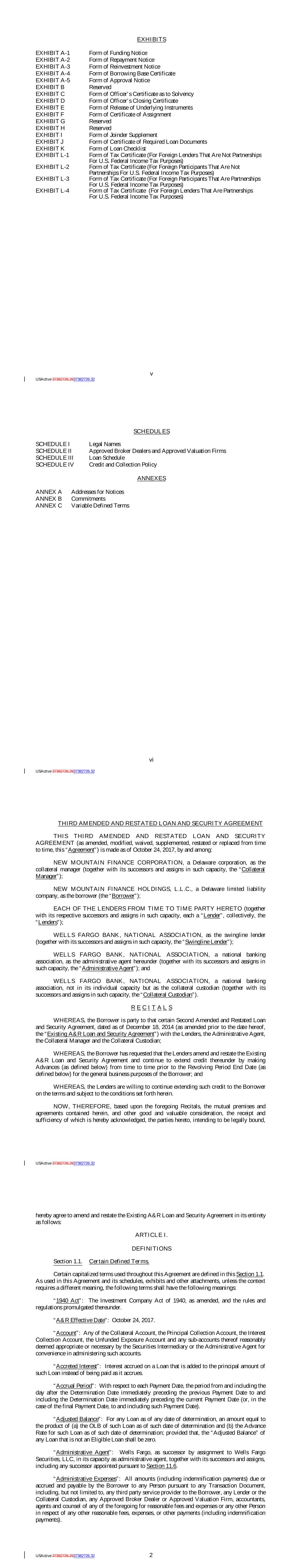 v USActive 37382726.2937382726.32 EXHIBIT L-1 EXHIBIT L-2 EXHIBIT L-3 EXHIBIT L-4 Form of Tax Certificate (For Foreign Lenders That Are Not Partnerships For U.S. Federal Income Tax Purposes) Form of Tax Certificate (For Foreign Participants That Are Not Partnerships For U.S. Federal Income Tax Purposes) Form of Tax Certificate (For Foreign Participants That Are Partnerships For U.S. Federal Income Tax Purposes) Form of Tax Certificate (For Foreign Lenders That Are Partnerships For U.S. Federal Income Tax Purposes) EXHIBITS EXHIBIT A-1 Form of Funding Notice EXHIBIT A-2 Form of Repayment Notice EXHIBIT A-3 Form of Reinvestment Notice EXHIBIT A-4 Form of Borrowing Base Certificate EXHIBIT A-5 Form of Approval Notice EXHIBIT B Reserved EXHIBIT C Form of Officer’s Certificate as to Solvency EXHIBIT D Form of Officer’s Closing Certificate EXHIBIT E Form of Release of Underlying Instruments EXHIBIT F Form of Certificate of Assignment EXHIBIT G Reserved EXHIBIT H Reserved EXHIBIT I Form of Joinder Supplement EXHIBIT J Form of Certificate of Required Loan Documents EXHIBIT K Form of Loan Checklist SCHEDULES SCHEDULE I Legal Names SCHEDULE II Approved Broker Dealers and Approved Valuation Firms SCHEDULE III Loan Schedule SCHEDULE IV Credit and Collection Policy ANNEXES ANNEX A Addresses for Notices ANNEX B Commitments ANNEX C Variable Defined Terms vi USActive 37382726.2937382726.32 THIRD AMENDED AND RESTATED LOAN AND SECURITY AGREEMENT THIS THIRD AMENDED AND RESTATED LOAN AND SECURITY AGREEMENT (as amended, modified, waived, supplemented, restated or replaced from time to time, this “Agreement”) is made as of October 24, 2017, by and among: NEW MOUNTAIN FINANCE CORPORATION, a Delaware corporation, as the collateral manager (together with its successors and assigns in such capacity, the “Collateral Manager”); NEW MOUNTAIN FINANCE HOLDINGS, L.L.C., a Delaware limited liability company, as the borrower (the “Borrower”); EACH OF THE LENDERS FROM TIME TO TIME PARTY HERETO (together with its respective successors and assigns in such capacity, each a “Lender”, collectively, the “Lenders”); WELLS FARGO BANK, NATIONAL ASSOCIATION, as the swingline lender (together with its successors and assigns in such capacity, the “Swingline Lender”); WELLS FARGO BANK, NATIONAL ASSOCIATION, a national banking association, as the administrative agent hereunder (together with its successors and assigns in such capacity, the “Administrative Agent”); and WELLS FARGO BANK, NATIONAL ASSOCIATION, a national banking association, not in its individual capacity but as the collateral custodian (together with its successors and assigns in such capacity, the “Collateral Custodian”). R E C I T A L S WHEREAS, the Borrower is party to that certain Second Amended and Restated Loan and Security Agreement, dated as of December 18, 2014 (as amended prior to the date hereof, the “Existing A&R Loan and Security Agreement”) with the Lenders, the Administrative Agent, the Collateral Manager and the Collateral Custodian; WHEREAS, the Borrower has requested that the Lenders amend and restate the Existing A&R Loan and Security Agreement and continue to extend credit thereunder by making Advances (as defined below) from time to time prior to the Revolving Period End Date (as defined below) for the general business purposes of the Borrower; and WHEREAS, the Lenders are willing to continue extending such credit to the Borrower on the terms and subject to the conditions set forth herein. NOW, THEREFORE, based upon the foregoing Recitals, the mutual premises and agreements contained herein, and other good and valuable consideration, the receipt and sufficiency of which is hereby acknowledged, the parties hereto, intending to be legally bound, USActive 37382726.2937382726.32 hereby agree to amend and restate the Existing A&R Loan and Security Agreement in its entirety as follows: ARTICLE I. DEFINITIONS Section 1.1. Certain Defined Terms. Certain capitalized terms used throughout this Agreement are defined in this Section 1.1. As used in this Agreement and its schedules, exhibits and other attachments, unless the context requires a different meaning, the following terms shall have the following meanings: “1940 Act”: The Investment Company Act of 1940, as amended, and the rules and regulations promulgated thereunder. “A&R Effective Date”: October 24, 2017. “Account”: Any of the Collateral Account, the Principal Collection Account, the Interest Collection Account, the Unfunded Exposure Account and any sub-accounts thereof reasonably deemed appropriate or necessary by the Securities Intermediary or the Administrative Agent for convenience in administering such accounts. “Accreted Interest”: Interest accrued on a Loan that is added to the principal amount of such Loan instead of being paid as it accrues. “Accrual Period”: With respect to each Payment Date, the period from and including the day after the Determination Date immediately preceding the previous Payment Date to and including the Determination Date immediately preceding the current Payment Date (or, in the case of the final Payment Date, to and including such Payment Date). “Adjusted Balance”: For any Loan as of any date of determination, an amount equal to the product of (a) the OLB of such Loan as of such date of determination and (b) the Advance Rate for such Loan as of such date of determination; provided that, the “Adjusted Balance” of any Loan that is not an Eligible Loan shall be zero. “Administrative Agent”: Wells Fargo, as successor by assignment to Wells Fargo Securities, LLC, in its capacity as administrative agent, together with its successors and assigns, including any successor appointed pursuant to Section 11.6. “Administrative Expenses”: All amounts (including indemnification payments) due or accrued and payable by the Borrower to any Person pursuant to any Transaction Document, including, but not limited