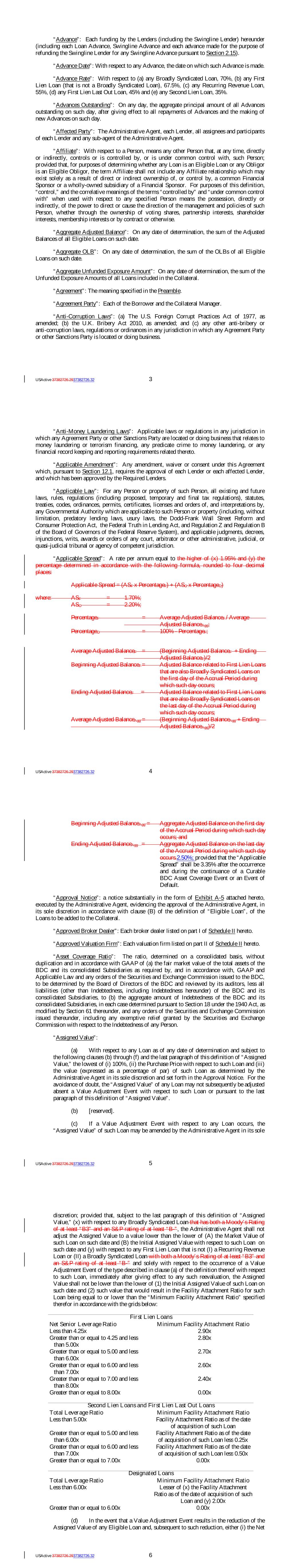 “Advance”: Each funding by the Lenders (including the Swingline Lender) hereunder (including each Loan Advance, Swingline Advance and each advance made for the purpose of refunding the Swingline Lender for any Swingline Advance pursuant to Section 2.15). “Advance Date”: With respect to any Advance, the date on which such Advance is made. “Advance Rate”: With respect to (a) any Broadly Syndicated Loan, 70%, (b) any First Lien Loan (that is not a Broadly Syndicated Loan), 67.5%, (c) any Recurring Revenue Loan, 55%, (d) any First Lien Last Out Loan, 45% and (e) any Second Lien Loan, 35%. “Advances Outstanding”: On any day, the aggregate principal amount of all Advances outstanding on such day, after giving effect to all repayments of Advances and the making of new Advances on such day. “Affected Party”: The Administrative Agent, each Lender, all assignees and participants of each Lender and any sub-agent of the Administrative Agent. “Affiliate”: With respect to a Person, means any other Person that, at any time, directly or indirectly, controls or is controlled by, or is under common control with, such Person; provided that, for purposes of determining whether any Loan is an Eligible Loan or any Obligor is an Eligible Obligor, the term Affiliate shall not include any Affiliate relationship which may exist solely as a result of direct or indirect ownership of, or control by, a common Financial Sponsor or a wholly-owned subsidiary of a Financial Sponsor. For purposes of this definition, “control,” and the correlative meanings of the terms “controlled by” and “under common control with” when used with respect to any specified Person means the possession, directly or indirectly, of the power to direct or cause the direction of the management and policies of such Person, whether through the ownership of voting shares, partnership interests, shareholder interests, membership interests or by contract or otherwise. “Aggregate Adjusted Balance”: On any date of determination, the sum of the Adjusted Balances of all Eligible Loans on such date. “Aggregate OLB”: On any date of determination, the sum of the OLBs of all Eligible Loans on such date. “Aggregate Unfunded Exposure Amount”: On any date of determination, the sum of the Unfunded Exposure Amounts of all Loans included in the Collateral. “Agreement”: The meaning specified in the Preamble. “Agreement Party”: Each of the Borrower and the Collateral Manager. “Anti-Corruption Laws”: (a) The U.S. Foreign Corrupt Practices Act of 1977, as amended; (b) the U.K. Bribery Act 2010, as amended; and (c) any other anti-bribery or anti-corruption laws, regulations or ordinances in any jurisdiction in which any Agreement Party or other Sanctions Party is located or doing business. USActive 37382726.2937382726.32 3 “Anti-Money Laundering Laws”: Applicable laws or regulations in any jurisdiction in which any Agreement Party or other Sanctions Party are located or doing business that relates to money laundering or terrorism financing, any predicate crime to money laundering, or any financial record keeping and reporting requirements related thereto. “Applicable Amendment”: Any amendment, waiver or consent under this Agreement which, pursuant to Section 12.1, requires the approval of each Lender or each affected Lender, and which has been approved by the Required Lenders. “Applicable Law”: For any Person or property of such Person, all existing and future laws, rules, regulations (including proposed, temporary and final tax regulations), statutes, treaties, codes, ordinances, permits, certificates, licenses and orders of, and interpretations by, any Governmental Authority which are applicable to such Person or property (including, without limitation, predatory lending laws, usury laws, the Dodd-Frank Wall Street Reform and Consumer Protection Act, the Federal Truth in Lending Act, and Regulation Z and Regulation B of the Board of Governors of the Federal Reserve System), and applicable judgments, decrees, injunctions, writs, awards or orders of any court, arbitrator or other administrative, judicial, or quasi-judicial tribunal or agency of competent jurisdiction. “Applicable Spread”: A rate per annum equal to the higher of (x) 1.95% and (y) the percentage determined in accordance with the following formula, rounded to four decimal places: Applicable Spread = (ASF x PercentageF) + (ASO x PercentageO) where: ASF = 1.70%; ASO = 2.20%; PercentageF = Average Adjusted BalanceF / Average Adjusted BalanceAgg; PercentageO = 100% - PercentageF; Average Adjusted BalanceF = (Beginning Adjusted BalanceF + Ending Adjusted BalanceF)/2 Beginning Adjusted BalanceF = Adjusted Balance related to First Lien Loans that are also Broadly Syndicated Loans on the first day of the Accrual Period during which such day occurs; Ending Adjusted BalanceF = Adjusted Balance related to First Lien Loans that are also Broadly Syndicated Loans on the last day of the Accrual Period during which such day occurs; Average Adjusted BalanceAgg = (Beginning Adjusted BalanceAgg + Ending Adjusted BalanceAgg)/2 USActive 37382726.2937382726.32 4 Beginning Adjusted BalanceAgg = Aggregate Adjusted Balance on the first day of the Accrual Period during which such day occurs; and Ending Adjusted BalanceAgg = Aggregate Adjusted Balance on the last day of the Accrual Period during which such day occurs.2.50%; provided that the “Applicable Spread” shall be 3.35% after the occurrence and during the continuance of a Curable BDC Asset Coverage Event or an Event of Default. “Approval Notice”: a notice substantially in the form of Exhibit A-5 attached hereto, executed by the Administrative Agent, evidencing the approval of the Administrative Agent, in its sole discretion in accordance with clause (B) of the definition of “Eligible Loan”, of the Loans to be added to the Collateral. “Approved Broker Dealer”: Each broker dealer listed o
