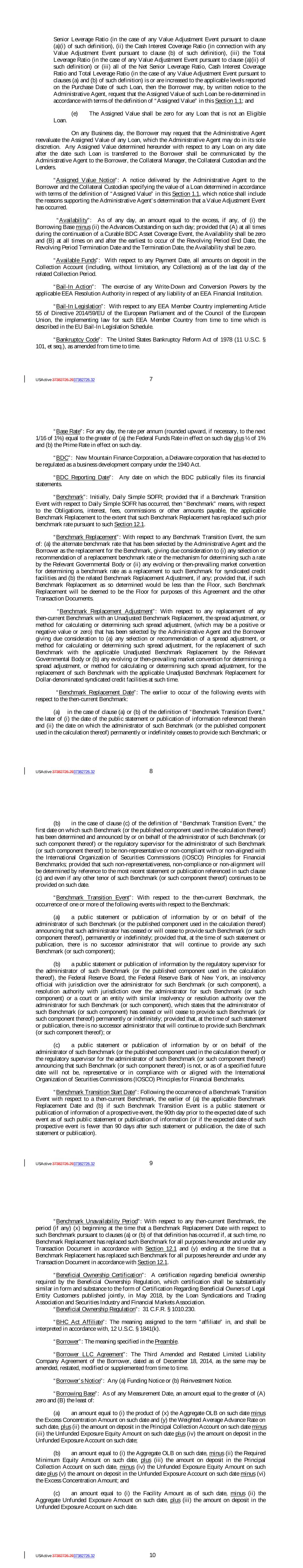 Senior Leverage Ratio (in the case of any Value Adjustment Event pursuant to clause (a)(i) of such definition), (ii) the Cash Interest Coverage Ratio (in connection with any Value Adjustment Event pursuant to clause (b) of such definition), (iii) the Total Leverage Ratio (in the case of any Value Adjustment Event pursuant to clause (a)(ii) of such definition) or (iii) all of the Net Senior Leverage Ratio, Cash Interest Coverage Ratio and Total Leverage Ratio (in the case of any Value Adjustment Event pursuant to clauses (a) and (b) of such definition) is or are increased to the applicable levels reported on the Purchase Date of such Loan, then the Borrower may, by written notice to the Administrative Agent, request that the Assigned Value of such Loan be re-determined in accordance with terms of the definition of “Assigned Value” in this Section 1.1; and (e) The Assigned Value shall be zero for any Loan that is not an Eligible Loan. On any Business day, the Borrower may request that the Administrative Agent reevaluate the Assigned Value of any Loan, which the Administrative Agent may do in its sole discretion. Any Assigned Value determined hereunder with respect to any Loan on any date after the date such Loan is transferred to the Borrower shall be communicated by the Administrative Agent to the Borrower, the Collateral Manager, the Collateral Custodian and the Lenders. “Assigned Value Notice”: A notice delivered by the Administrative Agent to the Borrower and the Collateral Custodian specifying the value of a Loan determined in accordance with terms of the definition of “Assigned Value” in this Section 1.1, which notice shall include the reasons supporting the Administrative Agent’s determination that a Value Adjustment Event has occurred. “Availability”: As of any day, an amount equal to the excess, if any, of (i) the Borrowing Base minus (ii) the Advances Outstanding on such day; provided that (A) at all times during the continuation of a Curable BDC Asset Coverage Event, the Availability shall be zero and (B) at all times on and after the earliest to occur of the Revolving Period End Date, the Revolving Period Termination Date and the Termination Date, the Availability shall be zero. “Available Funds”: With respect to any Payment Date, all amounts on deposit in the Collection Account (including, without limitation, any Collections) as of the last day of the related Collection Period. “Bail-In Action”: The exercise of any Write-Down and Conversion Powers by the applicable EEA Resolution Authority in respect of any liability of an EEA Financial Institution. “Bail-In Legislation”: With respect to any EEA Member Country implementing Article 55 of Directive 2014/59/EU of the European Parliament and of the Council of the European Union, the implementing law for such EEA Member Country from time to time which is described in the EU Bail-In Legislation Schedule. “Bankruptcy Code”: The United States Bankruptcy Reform Act of 1978 (11 U.S.C. § 101, et seq.), as amended from time to time. USActive 37382726.2937382726.32 7 “Base Rate”: For any day, the rate per annum (rounded upward, if necessary, to the next 1/16 of 1%) equal to the greater of (a) the Federal Funds Rate in effect on such day plus ½ of 1% and (b) the Prime Rate in effect on such day. “BDC”: New Mountain Finance Corporation, a Delaware corporation that has elected to be regulated as a business development company under the 1940 Act. “BDC Reporting Date”: Any date on which the BDC publically files its financial statements. “Benchmark”: Initially, Daily Simple SOFR; provided that if a Benchmark Transition Event with respect to Daily Simple SOFR has occurred, then “Benchmark” means, with respect to the Obligations, interest, fees, commissions or other amounts payable, the applicable Benchmark Replacement to the extent that such Benchmark Replacement has replaced such prior benchmark rate pursuant to such Section 12.1. “Benchmark Replacement”: With respect to any Benchmark Transition Event, the sum of: (a) the alternate benchmark rate that has been selected by the Administrative Agent and the Borrower as the replacement for the Benchmark, giving due consideration to (i) any selection or recommendation of a replacement benchmark rate or the mechanism for determining such a rate by the Relevant Governmental Body or (ii) any evolving or then-prevailing market convention for determining a benchmark rate as a replacement to such Benchmark for syndicated credit facilities and (b) the related Benchmark Replacement Adjustment, if any; provided that, if such Benchmark Replacement as so determined would be less than the Floor, such Benchmark Replacement will be deemed to be the Floor for purposes of this Agreement and the other Transaction Documents. “Benchmark Replacement Adjustment”: With respect to any replacement of any then-current Benchmark with an Unadjusted Benchmark Replacement, the spread adjustment, or method for calculating or determining such spread adjustment, (which may be a positive or negative value or zero) that has been selected by the Administrative Agent and the Borrower giving due consideration to (a) any selection or recommendation of a spread adjustment, or method for calculating or determining such spread adjustment, for the replacement of such Benchmark with the applicable Unadjusted Benchmark Replacement by the Relevant Governmental Body or (b) any evolving or then-prevailing market convention for determining a spread adjustment, or method for calculating or determining such spread adjustment, for the replacement of such Benchmark with the applicable Unadjusted Benchmark Replacement for Dollar-denominated syndicated credit facilities at such time. “Benchmark Replacement Date”: The earlier to occur of the following events with respect to the then-current Benchmark: (a) in the case of clause (a) or (b) of the definition of “Benchmark Transition Event