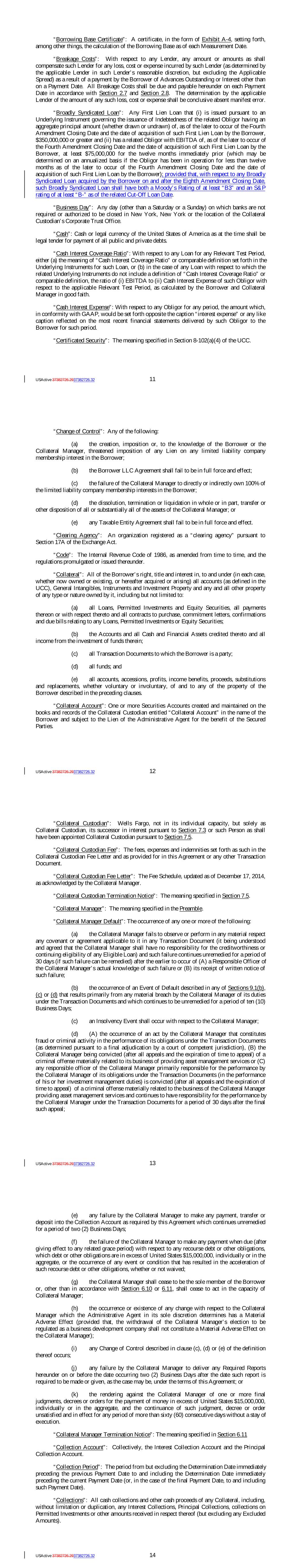 “Borrowing Base Certificate”: A certificate, in the form of Exhibit A-4, setting forth, among other things, the calculation of the Borrowing Base as of each Measurement Date. “Breakage Costs”: With respect to any Lender, any amount or amounts as shall compensate such Lender for any loss, cost or expense incurred by such Lender (as determined by the applicable Lender in such Lender’s reasonable discretion, but excluding the Applicable Spread) as a result of a payment by the Borrower of Advances Outstanding or Interest other than on a Payment Date. All Breakage Costs shall be due and payable hereunder on each Payment Date in accordance with Section 2.7 and Section 2.8. The determination by the applicable Lender of the amount of any such loss, cost or expense shall be conclusive absent manifest error. “Broadly Syndicated Loan”: Any First Lien Loan that (i) is issued pursuant to an Underlying Instrument governing the issuance of Indebtedness of the related Obligor having an aggregate principal amount (whether drawn or undrawn) of, as of the later to occur of the Fourth Amendment Closing Date and the date of acquisition of such First Lien Loan by the Borrower, $350,000,000 or greater and (ii) has a related Obligor with EBITDA of, as of the later to occur of the Fourth Amendment Closing Date and the date of acquisition of such First Lien Loan by the Borrower, at least $75,000,000 for the twelve months immediately prior (which may be determined on an annualized basis if the Obligor has been in operation for less than twelve months as of the later to occur of the Fourth Amendment Closing Date and the date of acquisition of such First Lien Loan by the Borrower); provided that, with respect to any Broadly Syndicated Loan acquired by the Borrower on and after the Eighth Amendment Closing Date, such Broadly Syndicated Loan shall have both a Moody’s Rating of at least “B3” and an S&P rating of at least “B-” as of the related Cut-Off Loan Date. “Business Day”: Any day (other than a Saturday or a Sunday) on which banks are not required or authorized to be closed in New York, New York or the location of the Collateral Custodian’s Corporate Trust Office. “Cash”: Cash or legal currency of the United States of America as at the time shall be legal tender for payment of all public and private debts. “Cash Interest Coverage Ratio”: With respect to any Loan for any Relevant Test Period, either (a) the meaning of “Cash Interest Coverage Ratio” or comparable definition set forth in the Underlying Instruments for such Loan, or (b) in the case of any Loan with respect to which the related Underlying Instruments do not include a definition of “Cash Interest Coverage Ratio” or comparable definition, the ratio of (i) EBITDA to (ii) Cash Interest Expense of such Obligor with respect to the applicable Relevant Test Period, as calculated by the Borrower and Collateral Manager in good faith. “Cash Interest Expense”: With respect to any Obligor for any period, the amount which, in conformity with GAAP, would be set forth opposite the caption “interest expense” or any like caption reflected on the most recent financial statements delivered by such Obligor to the Borrower for such period. “Certificated Security”: The meaning specified in Section 8-102(a)(4) of the UCC. USActive 37382726.2937382726.32 11 “Change of Control”: Any of the following: (a) the creation, imposition or, to the knowledge of the Borrower or the Collateral Manager, threatened imposition of any Lien on any limited liability company membership interest in the Borrower; (b) the Borrower LLC Agreement shall fail to be in full force and effect; (c) the failure of the Collateral Manager to directly or indirectly own 100% of the limited liability company membership interests in the Borrower; (d) the dissolution, termination or liquidation in whole or in part, transfer or other disposition of all or substantially all of the assets of the Collateral Manager; or (e) any Taxable Entity Agreement shall fail to be in full force and effect. “Clearing Agency”: An organization registered as a “clearing agency” pursuant to Section 17A of the Exchange Act. “Code”: The Internal Revenue Code of 1986, as amended from time to time, and the regulations promulgated or issued thereunder. “Collateral”: All of the Borrower’s right, title and interest in, to and under (in each case, whether now owned or existing, or hereafter acquired or arising) all accounts (as defined in the UCC), General Intangibles, Instruments and Investment Property and any and all other property of any type or nature owned by it, including but not limited to: (a) all Loans, Permitted Investments and Equity Securities, all payments thereon or with respect thereto and all contracts to purchase, commitment letters, confirmations and due bills relating to any Loans, Permitted Investments or Equity Securities; (b) the Accounts and all Cash and Financial Assets credited thereto and all income from the investment of funds therein; (c) all Transaction Documents to which the Borrower is a party; (d) all funds; and (e) all accounts, accessions, profits, income benefits, proceeds, substitutions and replacements, whether voluntary or involuntary, of and to any of the property of the Borrower described in the preceding clauses. “Collateral Account”: One or more Securities Accounts created and maintained on the books and records of the Collateral Custodian entitled “Collateral Account” in the name of the Borrower and subject to the Lien of the Administrative Agent for the benefit of the Secured Parties. USActive 37382726.2937382726.32 12 “Collateral Custodian”: Wells Fargo, not in its individual capacity, but solely as Collateral Custodian, its successor in interest pursuant to Section 7.3 or such Person as shall have been appointed Collateral Custodian pursuant to Section 7.5. “Collateral Custodian Fee”: The fees, expenses