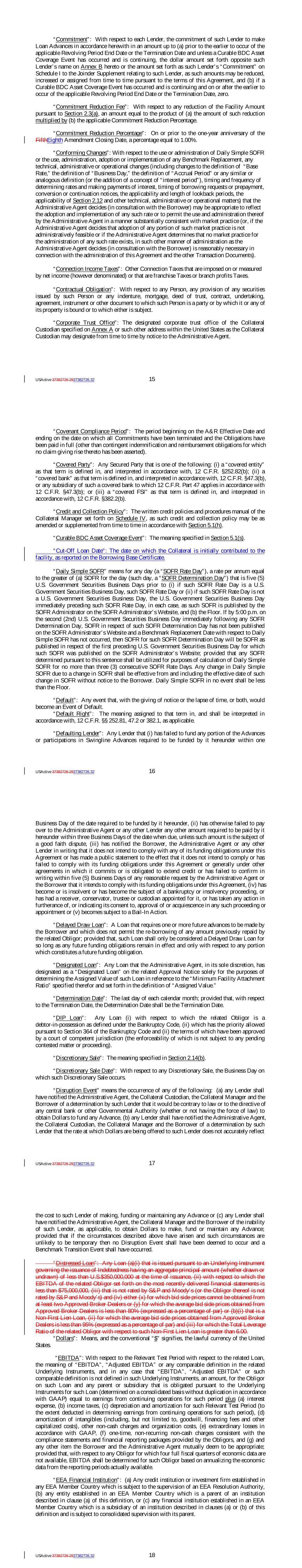“Commitment”: With respect to each Lender, the commitment of such Lender to make Loan Advances in accordance herewith in an amount up to (a) prior to the earlier to occur of the applicable Revolving Period End Date or the Termination Date and unless a Curable BDC Asset Coverage Event has occurred and is continuing, the dollar amount set forth opposite such Lender’s name on Annex B hereto or the amount set forth as such Lender’s “Commitment” on Schedule I to the Joinder Supplement relating to such Lender, as such amounts may be reduced, increased or assigned from time to time pursuant to the terms of this Agreement, and (b) if a Curable BDC Asset Coverage Event has occurred and is continuing and on or after the earlier to occur of the applicable Revolving Period End Date or the Termination Date, zero. “Commitment Reduction Fee”: With respect to any reduction of the Facility Amount pursuant to Section 2.3(a), an amount equal to the product of (a) the amount of such reduction multiplied by (b) the applicable Commitment Reduction Percentage. “Commitment Reduction Percentage”: On or prior to the one-year anniversary of the FifthEighth Amendment Closing Date, a percentage equal to 1.00%. “Conforming Changes”: With respect to the use or administration of Daily Simple SOFR or the use, administration, adoption or implementation of any Benchmark Replacement, any technical, administrative or operational changes (including changes to the definition of “Base Rate,” the definition of “Business Day,” the definition of “Accrual Period” or any similar or analogous definition (or the addition of a concept of “interest period”), timing and frequency of determining rates and making payments of interest, timing of borrowing requests or prepayment, conversion or continuation notices, the applicability and length of lookback periods, the applicability of Section 2.12 and other technical, administrative or operational matters) that the Administrative Agent decides (in consultation with the Borrower) may be appropriate to reflect the adoption and implementation of any such rate or to permit the use and administration thereof by the Administrative Agent in a manner substantially consistent with market practice (or, if the Administrative Agent decides that adoption of any portion of such market practice is not administratively feasible or if the Administrative Agent determines that no market practice for the administration of any such rate exists, in such other manner of administration as the Administrative Agent decides (in consultation with the Borrower) is reasonably necessary in connection with the administration of this Agreement and the other Transaction Documents). “Connection Income Taxes”: Other Connection Taxes that are imposed on or measured by net income (however denominated) or that are franchise Taxes or branch profits Taxes. “Contractual Obligation”: With respect to any Person, any provision of any securities issued by such Person or any indenture, mortgage, deed of trust, contract, undertaking, agreement, instrument or other document to which such Person is a party or by which it or any of its property is bound or to which either is subject. “Corporate Trust Office”: The designated corporate trust office of the Collateral Custodian specified on Annex A or such other address within the United States as the Collateral Custodian may designate from time to time by notice to the Administrative Agent. USActive 37382726.2937382726.32 15 “Covenant Compliance Period”: The period beginning on the A&R Effective Date and ending on the date on which all Commitments have been terminated and the Obligations have been paid in full (other than contingent indemnification and reimbursement obligations for which no claim giving rise thereto has been asserted). “Covered Party”: Any Secured Party that is one of the following: (i) a “covered entity” as that term is defined in, and interpreted in accordance with, 12 C.F.R. §252.82(b); (ii) a “covered bank” as that term is defined in, and interpreted in accordance with, 12 C.F.R. §47.3(b), or any subsidiary of such a covered bank to which 12 C.F.R. Part 47 applies in accordance with 12 C.F.R. §47.3(b); or (iii) a “covered FSI” as that term is defined in, and interpreted in accordance with, 12 C.F.R. §382.2(b). “Credit and Collection Policy”: The written credit policies and procedures manual of the Collateral Manager set forth on Schedule IV, as such credit and collection policy may be as amended or supplemented from time to time in accordance with Section 5.1(h). “Curable BDC Asset Coverage Event”: The meaning specified in Section 5.1(s). “Cut-Off Loan Date”: The date on which the Collateral is initially contributed to the facility, as reported on the Borrowing Base Certificate. “Daily Simple SOFR” means for any day (a “SOFR Rate Day”), a rate per annum equal to the greater of (a) SOFR for the day (such day, a “SOFR Determination Day”) that is five (5) U.S. Government Securities Business Days prior to (i) if such SOFR Rate Day is a U.S. Government Securities Business Day, such SOFR Rate Day or (ii) if such SOFR Rate Day is not a U.S. Government Securities Business Day, the U.S. Government Securities Business Day immediately preceding such SOFR Rate Day, in each case, as such SOFR is published by the SOFR Administrator on the SOFR Administrator’s Website, and (b) the Floor. If by 5:00 p.m. on the second (2nd) U.S. Government Securities Business Day immediately following any SOFR Determination Day, SOFR in respect of such SOFR Determination Day has not been published on the SOFR Administrator’s Website and a Benchmark Replacement Date with respect to Daily Simple SOFR has not occurred, then SOFR for such SOFR Determination Day will be SOFR as published in respect of the first preceding U.S. Government Securities Business Day for which such SOFR was published on the SOFR Ad
