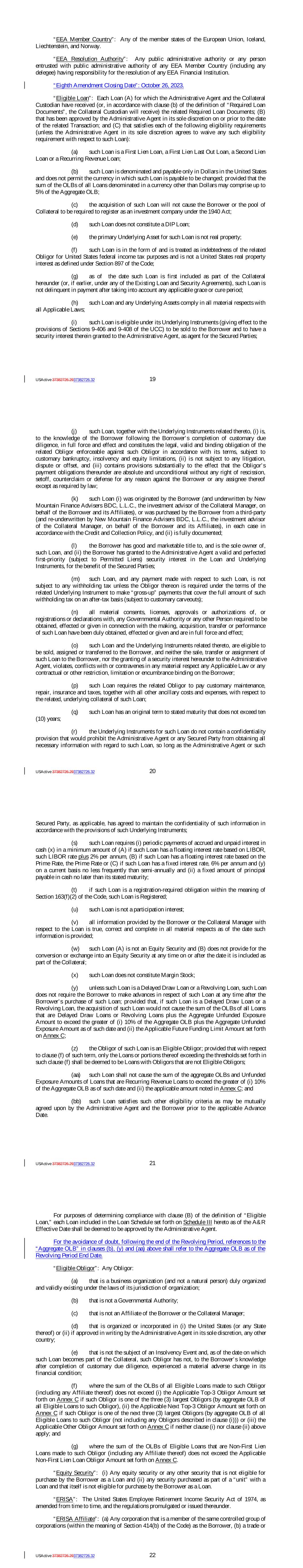 “EEA Member Country”: Any of the member states of the European Union, Iceland, Liechtenstein, and Norway. “EEA Resolution Authority”: Any public administrative authority or any person entrusted with public administrative authority of any EEA Member Country (including any delegee) having responsibility for the resolution of any EEA Financial Institution. “Eighth Amendment Closing Date”: October 26, 2023. “Eligible Loan”: Each Loan (A) for which the Administrative Agent and the Collateral Custodian have received (or, in accordance with clause (b) of the definition of “Required Loan Documents”, the Collateral Custodian will receive) the related Required Loan Documents; (B) that has been approved by the Administrative Agent in its sole discretion on or prior to the date of the related Transaction; and (C) that satisfies each of the following eligibility requirements (unless the Administrative Agent in its sole discretion agrees to waive any such eligibility requirement with respect to such Loan): (a) such Loan is a First Lien Loan, a First Lien Last Out Loan, a Second Lien Loan or a Recurring Revenue Loan; (b) such Loan is denominated and payable only in Dollars in the United States and does not permit the currency in which such Loan is payable to be changed; provided that the sum of the OLBs of all Loans denominated in a currency other than Dollars may comprise up to 5% of the Aggregate OLB; (c) the acquisition of such Loan will not cause the Borrower or the pool of Collateral to be required to register as an investment company under the 1940 Act; (d) such Loan does not constitute a DIP Loan; (e) the primary Underlying Asset for such Loan is not real property; (f) such Loan is in the form of and is treated as indebtedness of the related Obligor for United States federal income tax purposes and is not a United States real property interest as defined under Section 897 of the Code; (g) as of the date such Loan is first included as part of the Collateral hereunder (or, if earlier, under any of the Existing Loan and Security Agreements), such Loan is not delinquent in payment after taking into account any applicable grace or cure period; (h) such Loan and any Underlying Assets comply in all material respects with all Applicable Laws; (i) such Loan is eligible under its Underlying Instruments (giving effect to the provisions of Sections 9-406 and 9-408 of the UCC) to be sold to the Borrower and to have a security interest therein granted to the Administrative Agent, as agent for the Secured Parties; USActive 37382726.2937382726.32 19 (j) such Loan, together with the Underlying Instruments related thereto, (i) is, to the knowledge of the Borrower following the Borrower’s completion of customary due diligence, in full force and effect and constitutes the legal, valid and binding obligation of the related Obligor enforceable against such Obligor in accordance with its terms, subject to customary bankruptcy, insolvency and equity limitations, (ii) is not subject to any litigation, dispute or offset, and (iii) contains provisions substantially to the effect that the Obligor’s payment obligations thereunder are absolute and unconditional without any right of rescission, setoff, counterclaim or defense for any reason against the Borrower or any assignee thereof except as required by law; (k) such Loan (i) was originated by the Borrower (and underwritten by New Mountain Finance Advisers BDC, L.L.C., the investment advisor of the Collateral Manager, on behalf of the Borrower and its Affiliates), or was purchased by the Borrower from a third-party (and re-underwritten by New Mountain Finance Advisers BDC, L.L.C., the investment advisor of the Collateral Manager, on behalf of the Borrower and its Affiliates), in each case in accordance with the Credit and Collection Policy, and (ii) is fully documented; (l) the Borrower has good and marketable title to, and is the sole owner of, such Loan, and (ii) the Borrower has granted to the Administrative Agent a valid and perfected first-priority (subject to Permitted Liens) security interest in the Loan and Underlying Instruments, for the benefit of the Secured Parties; (m) such Loan, and any payment made with respect to such Loan, is not subject to any withholding tax unless the Obligor thereon is required under the terms of the related Underlying Instrument to make “gross-up” payments that cover the full amount of such withholding tax on an after-tax basis (subject to customary carveouts); (n) all material consents, licenses, approvals or authorizations of, or registrations or declarations with, any Governmental Authority or any other Person required to be obtained, effected or given in connection with the making, acquisition, transfer or performance of such Loan have been duly obtained, effected or given and are in full force and effect; (o) such Loan and the Underlying Instruments related thereto, are eligible to be sold, assigned or transferred to the Borrower, and neither the sale, transfer or assignment of such Loan to the Borrower, nor the granting of a security interest hereunder to the Administrative Agent, violates, conflicts with or contravenes in any material respect any Applicable Law or any contractual or other restriction, limitation or encumbrance binding on the Borrower; (p) such Loan requires the related Obligor to pay customary maintenance, repair, insurance and taxes, together with all other ancillary costs and expenses, with respect to the related, underlying collateral of such Loan; (q) such Loan has an original term to stated maturity that does not exceed ten (10) years; (r) the Underlying Instruments for such Loan do not contain a confidentiality provision that would prohibit the Administrative Agent or any Secured Party from obtaining all necessary information with regard to such Loan, so long as the Administrative Agent or such USActive 37382726.2937382726.32 20 Secured Party, as applicable, has agreed to maint