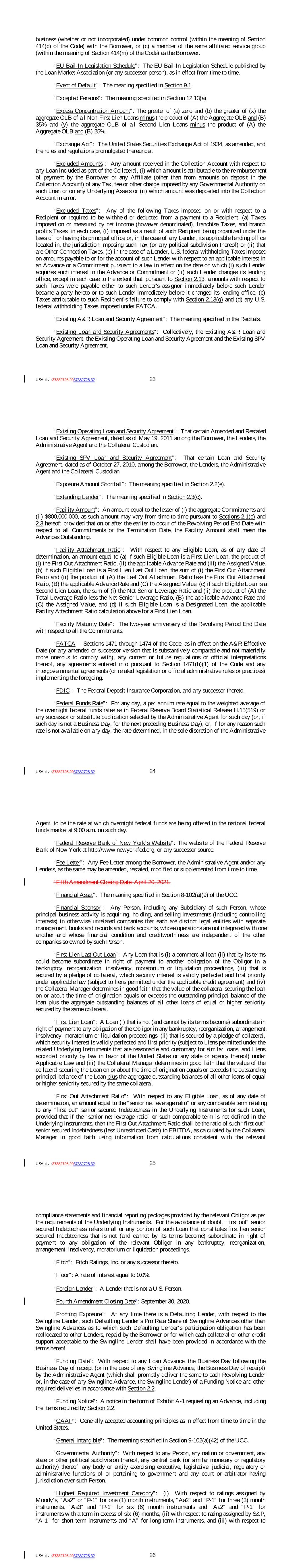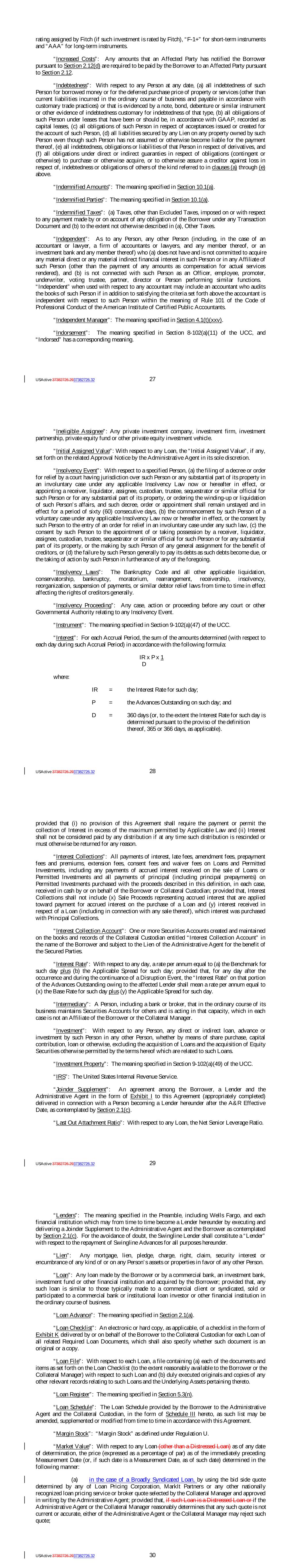 rating assigned by Fitch (if such investment is rated by Fitch), “F-1+” for short-term instruments and “AAA” for long-term instruments. “Increased Costs”: Any amounts that an Affected Party has notified the Borrower pursuant to Section 2.12(d) are required to be paid by the Borrower to an Affected Party pursuant to Section 2.12. “Indebtedness”: With respect to any Person at any date, (a) all indebtedness of such Person for borrowed money or for the deferred purchase price of property or services (other than current liabilities incurred in the ordinary course of business and payable in accordance with customary trade practices) or that is evidenced by a note, bond, debenture or similar instrument or other evidence of indebtedness customary for indebtedness of that type, (b) all obligations of such Person under leases that have been or should be, in accordance with GAAP, recorded as capital leases, (c) all obligations of such Person in respect of acceptances issued or created for the account of such Person, (d) all liabilities secured by any Lien on any property owned by such Person even though such Person has not assumed or otherwise become liable for the payment thereof, (e) all indebtedness, obligations or liabilities of that Person in respect of derivatives, and (f) all obligations under direct or indirect guaranties in respect of obligations (contingent or otherwise) to purchase or otherwise acquire, or to otherwise assure a creditor against loss in respect of, indebtedness or obligations of others of the kind referred to in clauses (a) through (e) above. “Indemnified Amounts”: The meaning specified in Section 10.1(a). “Indemnified Parties”: The meaning specified in Section 10.1(a). “Indemnified Taxes”: (a) Taxes, other than Excluded Taxes, imposed on or with respect to any payment made by or on account of any obligation of the Borrower under any Transaction Document and (b) to the extent not otherwise described in (a), Other Taxes. “Independent”: As to any Person, any other Person (including, in the case of an accountant or lawyer, a firm of accountants or lawyers, and any member thereof, or an investment bank and any member thereof) who (a) does not have and is not committed to acquire any material direct or any material indirect financial interest in such Person or in any Affiliate of such Person (other than the payment of any amounts as compensation for actual services rendered), and (b) is not connected with such Person as an Officer, employee, promoter, underwriter, voting trustee, partner, director or Person performing similar functions. “Independent” when used with respect to any accountant may include an accountant who audits the books of such Person if in addition to satisfying the criteria set forth above the accountant is independent with respect to such Person within the meaning of Rule 101 of the Code of Professional Conduct of the American Institute of Certified Public Accountants. “Independent Manager”: The meaning specified in Section 4.1(t)(xxv). “Indorsement”: The meaning specified in Section 8-102(a)(11) of the UCC, and “Indorsed” has a corresponding meaning. USActive 37382726.2937382726.32 27 USActive 37382726.2937382726.32 28 P IR = the Advances Outstanding on such day; and = “Ineligible Assignee”: Any private investment company, investment firm, investment partnership, private equity fund or other private equity investment vehicle. “Initial Assigned Value”: With respect to any Loan, the “Initial Assigned Value”, if any, set forth on the related Approval Notice by the Administrative Agent in its sole discretion. “Insolvency Event”: With respect to a specified Person, (a) the filing of a decree or order for relief by a court having jurisdiction over such Person or any substantial part of its property in an involuntary case under any applicable Insolvency Law now or hereafter in effect, or appointing a receiver, liquidator, assignee, custodian, trustee, sequestrator or similar official for such Person or for any substantial part of its property, or ordering the winding-up or liquidation of such Person’s affairs, and such decree, order or appointment shall remain unstayed and in effect for a period of sixty (60) consecutive days, (b) the commencement by such Person of a voluntary case under any applicable Insolvency Law now or hereafter in effect, or the consent by such Person to the entry of an order for relief in an involuntary case under any such law, (c) the consent by such Person to the appointment of or taking possession by a receiver, liquidator, assignee, custodian, trustee, sequestrator or similar official for such Person or for any substantial part of its property, or the making by such Person of any general assignment for the benefit of creditors, or (d) the failure by such Person generally to pay its debts as such debts become due, or the taking of action by such Person in furtherance of any of the foregoing. “Insolvency Laws”: The Bankruptcy Code and all other applicable liquidation, conservatorship, bankruptcy, moratorium, rearrangement, receivership, insolvency, reorganization, suspension of payments, or similar debtor relief laws from time to time in effect affecting the rights of creditors generally. “Insolvency Proceeding”: Any case, action or proceeding before any court or other Governmental Authority relating to any Insolvency Event. “Instrument”: The meaning specified in Section 9-102(a)(47) of the UCC. “Interest”: For each Accrual Period, the sum of the amounts determined (with respect to each day during such Accrual Period) in accordance with the following formula: IR x P x 1 D where: D the Interest Rate for such day; = 360 days (or, to the extent the Interest Rate for such day is determined pursuant to the proviso of the definition thereof, 365 or 366 days, as applicable). provided that (i) no provision of this Agreement shall require the payment or permit the c