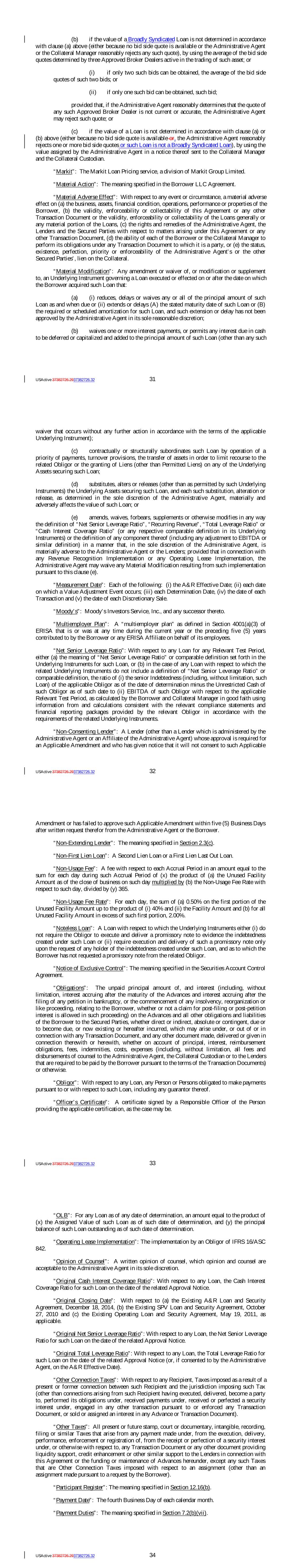 (b) if the value of a Broadly Syndicated Loan is not determined in accordance with clause (a) above (either because no bid side quote is available or the Administrative Agent or the Collateral Manager reasonably rejects any such quote), by using the average of the bid side quotes determined by three Approved Broker Dealers active in the trading of such asset; or (i) if only two such bids can be obtained, the average of the bid side quotes of such two bids; or (ii) if only one such bid can be obtained, such bid; provided that, if the Administrative Agent reasonably determines that the quote of any such Approved Broker Dealer is not current or accurate, the Administrative Agent may reject such quote; or (c) if the value of a Loan is not determined in accordance with clause (a) or (b) above (either because no bid side quote is available or, the Administrative Agent reasonably rejects one or more bid side quotes or such Loan is not a Broadly Syndicated Loan), by using the value assigned by the Administrative Agent in a notice thereof sent to the Collateral Manager and the Collateral Custodian. “Markit”: The Markit Loan Pricing service, a division of Markit Group Limited. “Material Action”: The meaning specified in the Borrower LLC Agreement. “Material Adverse Effect”: With respect to any event or circumstance, a material adverse effect on (a) the business, assets, financial condition, operations, performance or properties of the Borrower, (b) the validity, enforceability or collectability of this Agreement or any other Transaction Document or the validity, enforceability or collectability of the Loans generally or any material portion of the Loans, (c) the rights and remedies of the Administrative Agent, the Lenders and the Secured Parties with respect to matters arising under this Agreement or any other Transaction Document, (d) the ability of each of the Borrower or the Collateral Manager to perform its obligations under any Transaction Document to which it is a party, or (e) the status, existence, perfection, priority or enforceability of the Administrative Agent’s or the other Secured Parties’, lien on the Collateral. “Material Modification”: Any amendment or waiver of, or modification or supplement to, an Underlying Instrument governing a Loan executed or effected on or after the date on which the Borrower acquired such Loan that: (a) (i) reduces, delays or waives any or all of the principal amount of such Loan as and when due or (ii) extends or delays (A) the stated maturity date of such Loan or (B) the required or scheduled amortization for such Loan, and such extension or delay has not been approved by the Administrative Agent in its sole reasonable discretion; (b) waives one or more interest payments, or permits any interest due in cash to be deferred or capitalized and added to the principal amount of such Loan (other than any such USActive 37382726.2937382726.32 31 waiver that occurs without any further action in accordance with the terms of the applicable Underlying Instrument); (c) contractually or structurally subordinates such Loan by operation of a priority of payments, turnover provisions, the transfer of assets in order to limit recourse to the related Obligor or the granting of Liens (other than Permitted Liens) on any of the Underlying Assets securing such Loan; (d) substitutes, alters or releases (other than as permitted by such Underlying Instruments) the Underlying Assets securing such Loan, and each such substitution, alteration or release, as determined in the sole discretion of the Administrative Agent, materially and adversely affects the value of such Loan; or (e) amends, waives, forbears, supplements or otherwise modifies in any way the definition of “Net Senior Leverage Ratio”, “Recurring Revenue”, “Total Leverage Ratio” or “Cash Interest Coverage Ratio” (or any respective comparable definition in its Underlying Instruments) or the definition of any component thereof (including any adjustment to EBITDA or similar definition) in a manner that, in the sole discretion of the Administrative Agent, is materially adverse to the Administrative Agent or the Lenders; provided that in connection with any Revenue Recognition Implementation or any Operating Lease Implementation, the Administrative Agent may waive any Material Modification resulting from such implementation pursuant to this clause (e). “Measurement Date”: Each of the following: (i) the A&R Effective Date; (ii) each date on which a Value Adjustment Event occurs; (iii) each Determination Date, (iv) the date of each Transaction and (v) the date of each Discretionary Sale. “Moody’s”: Moody’s Investors Service, Inc., and any successor thereto. “Multiemployer Plan”: A “multiemployer plan” as defined in Section 4001(a)(3) of ERISA that is or was at any time during the current year or the preceding five (5) years contributed to by the Borrower or any ERISA Affiliate on behalf of its employees. “Net Senior Leverage Ratio”: With respect to any Loan for any Relevant Test Period, either (a) the meaning of “Net Senior Leverage Ratio” or comparable definition set forth in the Underlying Instruments for such Loan, or (b) in the case of any Loan with respect to which the related Underlying Instruments do not include a definition of “Net Senior Leverage Ratio” or comparable definition, the ratio of (i) the senior Indebtedness (including, without limitation, such Loan) of the applicable Obligor as of the date of determination minus the Unrestricted Cash of such Obligor as of such date to (ii) EBITDA of such Obligor with respect to the applicable Relevant Test Period, as calculated by the Borrower and Collateral Manager in good faith using information from and calculations consistent with the relevant compliance statements and financial reporting packages provided by the relevant Obligor in accordance with the requirements of the related Underlying Instruments