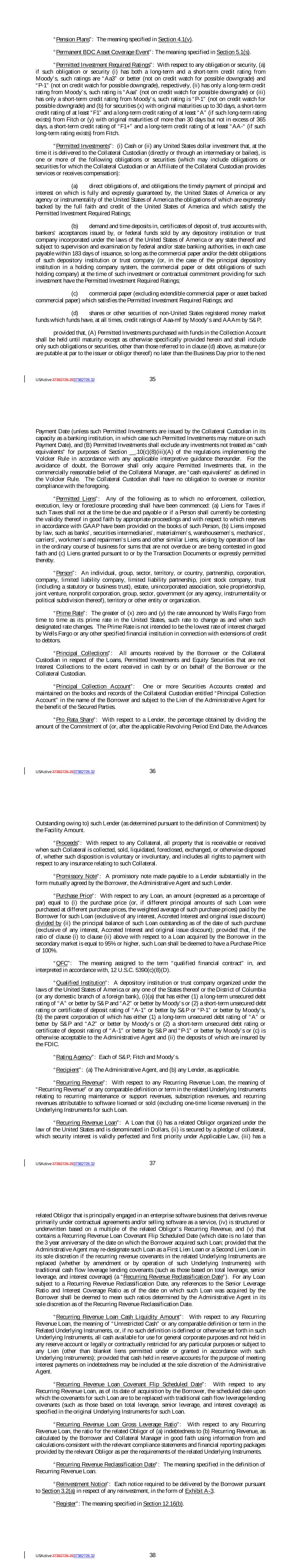 “Pension Plans”: The meaning specified in Section 4.1(v). “Permanent BDC Asset Coverage Event”: The meaning specified in Section 5.1(s). “Permitted Investment Required Ratings”: With respect to any obligation or security, (a) if such obligation or security (i) has both a long-term and a short-term credit rating from Moody’s, such ratings are “Aa3” or better (not on credit watch for possible downgrade) and “P-1” (not on credit watch for possible downgrade), respectively, (ii) has only a long-term credit rating from Moody’s, such rating is “Aaa” (not on credit watch for possible downgrade) or (iii) has only a short-term credit rating from Moody’s, such rating is “P-1” (not on credit watch for possible downgrade) and (b) for securities (x) with original maturities up to 30 days, a short-term credit rating of at least “F1” and a long-term credit rating of at least “A” (if such long-term rating exists) from Fitch or (y) with original maturities of more than 30 days but not in excess of 365 days, a short-term credit rating of “F1+” and a long-term credit rating of at least “AA-“ (if such long-term rating exists) from Fitch. “Permitted Investments”: (i) Cash or (ii) any United States dollar investment that, at the time it is delivered to the Collateral Custodian (directly or through an intermediary or bailee), is one or more of the following obligations or securities (which may include obligations or securities for which the Collateral Custodian or an Affiliate of the Collateral Custodian provides services or receives compensation): (a) direct obligations of, and obligations the timely payment of principal and interest on which is fully and expressly guaranteed by, the United States of America or any agency or instrumentality of the United States of America the obligations of which are expressly backed by the full faith and credit of the United States of America and which satisfy the Permitted Investment Required Ratings; (b) demand and time deposits in, certificates of deposit of, trust accounts with, bankers’ acceptances issued by, or federal funds sold by any depository institution or trust company incorporated under the laws of the United States of America or any state thereof and subject to supervision and examination by federal and/or state banking authorities, in each case payable within 183 days of issuance, so long as the commercial paper and/or the debt obligations of such depository institution or trust company (or, in the case of the principal depository institution in a holding company system, the commercial paper or debt obligations of such holding company) at the time of such investment or contractual commitment providing for such investment have the Permitted Investment Required Ratings; (c) commercial paper (excluding extendible commercial paper or asset backed commercial paper) which satisfies the Permitted Investment Required Ratings; and (d) shares or other securities of non-United States registered money market funds which funds have, at all times, credit ratings of Aaa-mf by Moody’s and AAAm by S&P; provided that, (A) Permitted Investments purchased with funds in the Collection Account shall be held until maturity except as otherwise specifically provided herein and shall include only such obligations or securities, other than those referred to in clause (d) above, as mature (or are putable at par to the issuer or obligor thereof) no later than the Business Day prior to the next USActive 37382726.2937382726.32 35 Payment Date (unless such Permitted Investments are issued by the Collateral Custodian in its capacity as a banking institution, in which case such Permitted Investments may mature on such Payment Date), and (B) Permitted Investments shall exclude any investments not treated as “cash equivalents” for purposes of Section __.10(c)(8)(iii)(A) of the regulations implementing the Volcker Rule in accordance with any applicable interpretive guidance thereunder. For the avoidance of doubt, the Borrower shall only acquire Permitted Investments that, in the commercially reasonable belief of the Collateral Manager, are “cash equivalents” as defined in the Volcker Rule. The Collateral Custodian shall have no obligation to oversee or monitor compliance with the foregoing. “Permitted Liens”: Any of the following as to which no enforcement, collection, execution, levy or foreclosure proceeding shall have been commenced: (a) Liens for Taxes if such Taxes shall not at the time be due and payable or if a Person shall currently be contesting the validity thereof in good faith by appropriate proceedings and with respect to which reserves in accordance with GAAP have been provided on the books of such Person, (b) Liens imposed by law, such as banks’, securities intermediaries’, materialmen’s, warehousemen’s, mechanics’, carriers’, workmen’s and repairmen’s Liens and other similar Liens, arising by operation of law in the ordinary course of business for sums that are not overdue or are being contested in good faith and (c) Liens granted pursuant to or by the Transaction Documents or expressly permitted thereby. “Person”: An individual, group, sector, territory, or country, partnership, corporation, company, limited liability company, limited liability partnership, joint stock company, trust (including a statutory or business trust), estate, unincorporated association, sole proprietorship, joint venture, nonprofit corporation, group, sector, government (or any agency, instrumentality or political subdivision thereof), territory or other entity or organization. “Prime Rate”: The greater of (x) zero and (y) the rate announced by Wells Fargo from time to time as its prime rate in the United States, such rate to change as and when such designated rate changes. The Prime Rate is not intended to be the lowest rate of interest charged by Wells Fargo or any other specified financial institution in conn