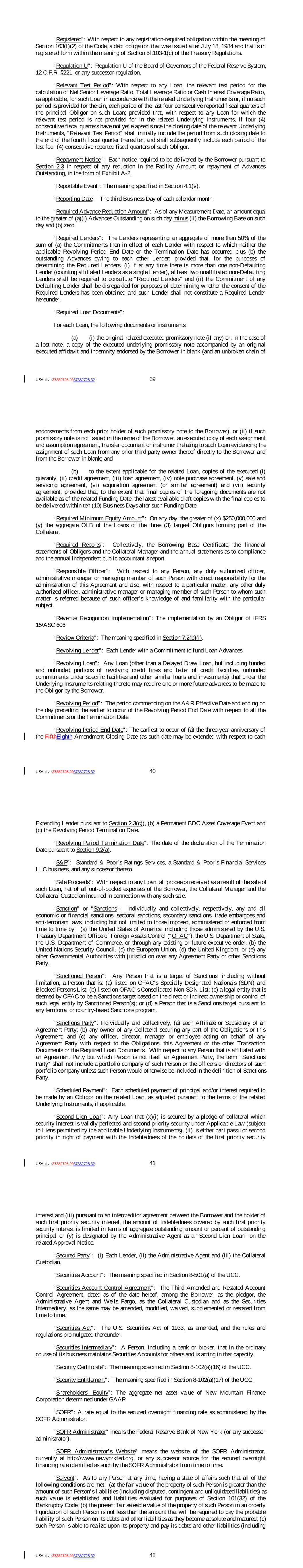 “Registered”: With respect to any registration-required obligation within the meaning of Section 163(f)(2) of the Code, a debt obligation that was issued after July 18, 1984 and that is in registered form within the meaning of Section 5f.103-1(c) of the Treasury Regulations. “Regulation U”: Regulation U of the Board of Governors of the Federal Reserve System, 12 C.F.R. §221, or any successor regulation. “Relevant Test Period”: With respect to any Loan, the relevant test period for the calculation of Net Senior Leverage Ratio, Total Leverage Ratio or Cash Interest Coverage Ratio, as applicable, for such Loan in accordance with the related Underlying Instruments or, if no such period is provided for therein, each period of the last four consecutive reported fiscal quarters of the principal Obligor on such Loan; provided that, with respect to any Loan for which the relevant test period is not provided for in the related Underlying Instruments, if four (4) consecutive fiscal quarters have not yet elapsed since the closing date of the relevant Underlying Instruments, “Relevant Test Period” shall initially include the period from such closing date to the end of the fourth fiscal quarter thereafter, and shall subsequently include each period of the last four (4) consecutive reported fiscal quarters of such Obligor. “Repayment Notice”: Each notice required to be delivered by the Borrower pursuant to Section 2.3 in respect of any reduction in the Facility Amount or repayment of Advances Outstanding, in the form of Exhibit A-2. “Reportable Event”: The meaning specified in Section 4.1(v). “Reporting Date”: The third Business Day of each calendar month. “Required Advance Reduction Amount”: As of any Measurement Date, an amount equal to the greater of (a)(i) Advances Outstanding on such day minus (ii) the Borrowing Base on such day and (b) zero. “Required Lenders”: The Lenders representing an aggregate of more than 50% of the sum of (a) the Commitments then in effect of each Lender with respect to which neither the applicable Revolving Period End Date or the Termination Date has occurred plus (b) the outstanding Advances owing to each other Lender; provided that, for the purposes of determining the Required Lenders, (i) if at any time there is more than one non-Defaulting Lender (counting affiliated Lenders as a single Lender), at least two unaffiliated non-Defaulting Lenders shall be required to constitute “Required Lenders” and (ii) the Commitment of any Defaulting Lender shall be disregarded for purposes of determining whether the consent of the Required Lenders has been obtained and such Lender shall not constitute a Required Lender hereunder. “Required Loan Documents”: For each Loan, the following documents or instruments: (a) (i) the original related executed promissory note (if any) or, in the case of a lost note, a copy of the executed underlying promissory note accompanied by an original executed affidavit and indemnity endorsed by the Borrower in blank (and an unbroken chain of USActive 37382726.2937382726.32 39 endorsements from each prior holder of such promissory note to the Borrower), or (ii) if such promissory note is not issued in the name of the Borrower, an executed copy of each assignment and assumption agreement, transfer document or instrument relating to such Loan evidencing the assignment of such Loan from any prior third party owner thereof directly to the Borrower and from the Borrower in blank; and (b) to the extent applicable for the related Loan, copies of the executed (i) guaranty, (ii) credit agreement, (iii) loan agreement, (iv) note purchase agreement, (v) sale and servicing agreement, (vi) acquisition agreement (or similar agreement) and (vii) security agreement; provided that, to the extent that final copies of the foregoing documents are not available as of the related Funding Date, the latest available draft copies with the final copies to be delivered within ten (10) Business Days after such Funding Date. “Required Minimum Equity Amount”: On any day, the greater of (x) $250,000,000 and (y) the aggregate OLB of the Loans of the three (3) largest Obligors forming part of the Collateral. “Required Reports”: Collectively, the Borrowing Base Certificate, the financial statements of Obligors and the Collateral Manager and the annual statements as to compliance and the annual Independent public accountant’s report. “Responsible Officer”: With respect to any Person, any duly authorized officer, administrative manager or managing member of such Person with direct responsibility for the administration of this Agreement and also, with respect to a particular matter, any other duly authorized officer, administrative manager or managing member of such Person to whom such matter is referred because of such officer’s knowledge of and familiarity with the particular subject. “Revenue Recognition Implementation”: The implementation by an Obligor of IFRS 15/ASC 606. “Review Criteria”: The meaning specified in Section 7.2(b)(i). “Revolving Lender”: Each Lender with a Commitment to fund Loan Advances. “Revolving Loan”: Any Loan (other than a Delayed Draw Loan, but including funded and unfunded portions of revolving credit lines and letter of credit facilities, unfunded commitments under specific facilities and other similar loans and investments) that under the Underlying Instruments relating thereto may require one or more future advances to be made to the Obligor by the Borrower. “Revolving Period”: The period commencing on the A&R Effective Date and ending on the day preceding the earlier to occur of the Revolving Period End Date with respect to all the Commitments or the Termination Date. “Revolving Period End Date”: The earliest to occur of (a) the three-year anniversary of the FifthEighth Amendment Closing Date (as such date may be extended with respect to each USActive 37382726.2937382726.32 4