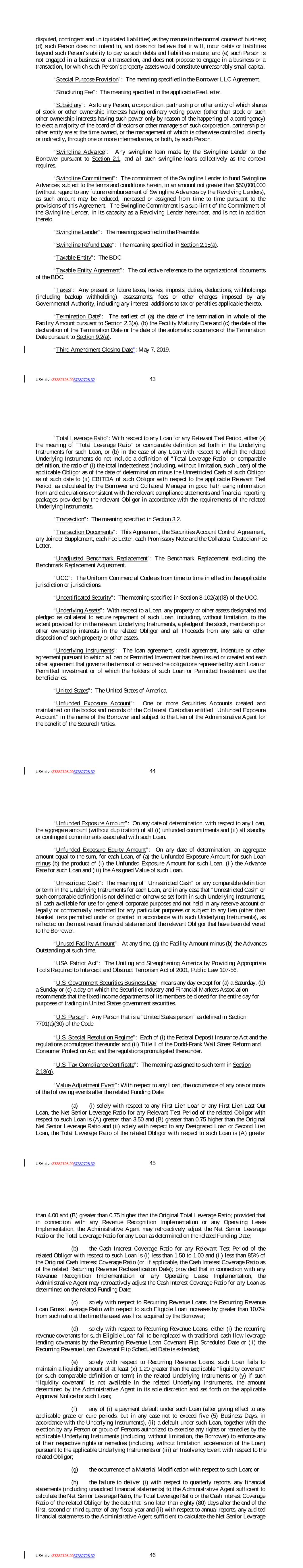 disputed, contingent and unliquidated liabilities) as they mature in the normal course of business; (d) such Person does not intend to, and does not believe that it will, incur debts or liabilities beyond such Person’s ability to pay as such debts and liabilities mature; and (e) such Person is not engaged in a business or a transaction, and does not propose to engage in a business or a transaction, for which such Person’s property assets would constitute unreasonably small capital. “Special Purpose Provision”: The meaning specified in the Borrower LLC Agreement. “Structuring Fee”: The meaning specified in the applicable Fee Letter. “Subsidiary”: As to any Person, a corporation, partnership or other entity of which shares of stock or other ownership interests having ordinary voting power (other than stock or such other ownership interests having such power only by reason of the happening of a contingency) to elect a majority of the board of directors or other managers of such corporation, partnership or other entity are at the time owned, or the management of which is otherwise controlled, directly or indirectly, through one or more intermediaries, or both, by such Person. “Swingline Advance”: Any swingline loan made by the Swingline Lender to the Borrower pursuant to Section 2.1, and all such swingline loans collectively as the context requires. “Swingline Commitment”: The commitment of the Swingline Lender to fund Swingline Advances, subject to the terms and conditions herein, in an amount not greater than $50,000,000 (without regard to any future reimbursement of Swingline Advances by the Revolving Lenders), as such amount may be reduced, increased or assigned from time to time pursuant to the provisions of this Agreement. The Swingline Commitment is a sub-limit of the Commitment of the Swingline Lender, in its capacity as a Revolving Lender hereunder, and is not in addition thereto. “Swingline Lender”: The meaning specified in the Preamble. “Swingline Refund Date”: The meaning specified in Section 2.15(a). “Taxable Entity”: The BDC. “Taxable Entity Agreement”: The collective reference to the organizational documents of the BDC. “Taxes”: Any present or future taxes, levies, imposts, duties, deductions, withholdings (including backup withholding), assessments, fees or other charges imposed by any Governmental Authority, including any interest, additions to tax or penalties applicable thereto. “Termination Date”: The earliest of (a) the date of the termination in whole of the Facility Amount pursuant to Section 2.3(a), (b) the Facility Maturity Date and (c) the date of the declaration of the Termination Date or the date of the automatic occurrence of the Termination Date pursuant to Section 9.2(a). “Third Amendment Closing Date”: May 7, 2019. USActive 37382726.2937382726.32 43 “Total Leverage Ratio”: With respect to any Loan for any Relevant Test Period, either (a) the meaning of “Total Leverage Ratio” or comparable definition set forth in the Underlying Instruments for such Loan, or (b) in the case of any Loan with respect to which the related Underlying Instruments do not include a definition of “Total Leverage Ratio” or comparable definition, the ratio of (i) the total Indebtedness (including, without limitation, such Loan) of the applicable Obligor as of the date of determination minus the Unrestricted Cash of such Obligor as of such date to (ii) EBITDA of such Obligor with respect to the applicable Relevant Test Period, as calculated by the Borrower and Collateral Manager in good faith using information from and calculations consistent with the relevant compliance statements and financial reporting packages provided by the relevant Obligor in accordance with the requirements of the related Underlying Instruments. “Transaction”: The meaning specified in Section 3.2. “Transaction Documents”: This Agreement, the Securities Account Control Agreement, any Joinder Supplement, each Fee Letter, each Promissory Note and the Collateral Custodian Fee Letter. “Unadjusted Benchmark Replacement”: The Benchmark Replacement excluding the Benchmark Replacement Adjustment. “UCC”: The Uniform Commercial Code as from time to time in effect in the applicable jurisdiction or jurisdictions. “Uncertificated Security”: The meaning specified in Section 8-102(a)(l8) of the UCC. “Underlying Assets”: With respect to a Loan, any property or other assets designated and pledged as collateral to secure repayment of such Loan, including, without limitation, to the extent provided for in the relevant Underlying Instruments, a pledge of the stock, membership or other ownership interests in the related Obligor and all Proceeds from any sale or other disposition of such property or other assets. “Underlying Instruments”: The loan agreement, credit agreement, indenture or other agreement pursuant to which a Loan or Permitted Investment has been issued or created and each other agreement that governs the terms of or secures the obligations represented by such Loan or Permitted Investment or of which the holders of such Loan or Permitted Investment are the beneficiaries. “United States”: The United States of America. “Unfunded Exposure Account”: One or more Securities Accounts created and maintained on the books and records of the Collateral Custodian entitled “Unfunded Exposure Account” in the name of the Borrower and subject to the Lien of the Administrative Agent for the benefit of the Secured Parties. USActive 37382726.2937382726.32 44 “Unfunded Exposure Amount”: On any date of determination, with respect to any Loan, the aggregate amount (without duplication) of all (i) unfunded commitments and (ii) all standby or contingent commitments associated with such Loan. “Unfunded Exposure Equity Amount”: On any date of determination, an aggregate amount equal to the sum, for each Loan, of (a) the Unfunded Exposure 