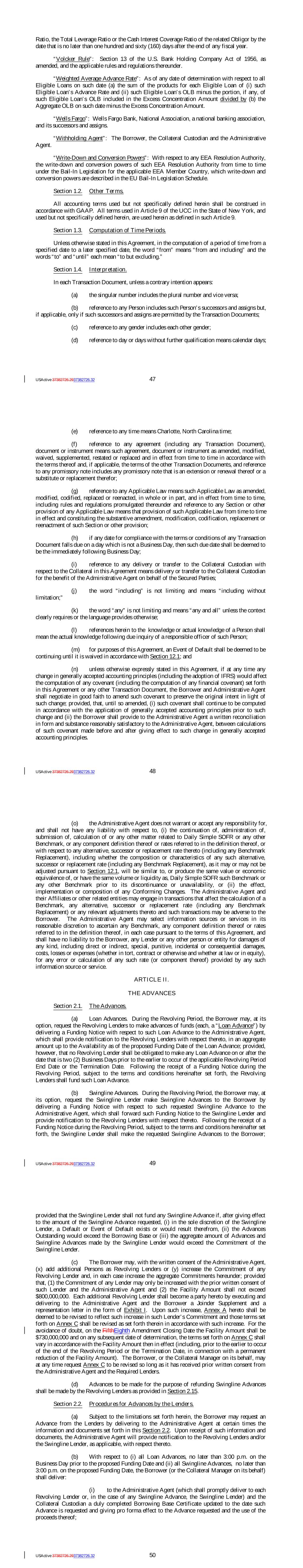 Ratio, the Total Leverage Ratio or the Cash Interest Coverage Ratio of the related Obligor by the date that is no later than one hundred and sixty (160) days after the end of any fiscal year. “Volcker Rule”: Section 13 of the U.S. Bank Holding Company Act of 1956, as amended, and the applicable rules and regulations thereunder. “Weighted Average Advance Rate”: As of any date of determination with respect to all Eligible Loans on such date (a) the sum of the products for each Eligible Loan of (i) such Eligible Loan’s Advance Rate and (ii) such Eligible Loan’s OLB minus the portion, if any, of such Eligible Loan’s OLB included in the Excess Concentration Amount divided by (b) the Aggregate OLB on such date minus the Excess Concentration Amount. “Wells Fargo”: Wells Fargo Bank, National Association, a national banking association, and its successors and assigns. “Withholding Agent”: The Borrower, the Collateral Custodian and the Administrative Agent. “Write-Down and Conversion Powers”: With respect to any EEA Resolution Authority, the write-down and conversion powers of such EEA Resolution Authority from time to time under the Bail-In Legislation for the applicable EEA Member Country, which write-down and conversion powers are described in the EU Bail-In Legislation Schedule. Section 1.2. Other Terms. All accounting terms used but not specifically defined herein shall be construed in accordance with GAAP. All terms used in Article 9 of the UCC in the State of New York, and used but not specifically defined herein, are used herein as defined in such Article 9. Section 1.3. Computation of Time Periods. Unless otherwise stated in this Agreement, in the computation of a period of time from a specified date to a later specified date, the word “from” means “from and including” and the words “to” and “until” each mean “to but excluding.” Section 1.4. Interpretation. In each Transaction Document, unless a contrary intention appears: (a) the singular number includes the plural number and vice versa; (b) reference to any Person includes such Person’s successors and assigns but, if applicable, only if such successors and assigns are permitted by the Transaction Documents; (c) reference to any gender includes each other gender; (d) reference to day or days without further qualification means calendar days; USActive 37382726.2937382726.32 47 (e) reference to any time means Charlotte, North Carolina time; (f) reference to any agreement (including any Transaction Document), document or instrument means such agreement, document or instrument as amended, modified, waived, supplemented, restated or replaced and in effect from time to time in accordance with the terms thereof and, if applicable, the terms of the other Transaction Documents, and reference to any promissory note includes any promissory note that is an extension or renewal thereof or a substitute or replacement therefor; (g) reference to any Applicable Law means such Applicable Law as amended, modified, codified, replaced or reenacted, in whole or in part, and in effect from time to time, including rules and regulations promulgated thereunder and reference to any Section or other provision of any Applicable Law means that provision of such Applicable Law from time to time in effect and constituting the substantive amendment, modification, codification, replacement or reenactment of such Section or other provision; (h) if any date for compliance with the terms or conditions of any Transaction Document falls due on a day which is not a Business Day, then such due date shall be deemed to be the immediately following Business Day; (i) reference to any delivery or transfer to the Collateral Custodian with respect to the Collateral in this Agreement means delivery or transfer to the Collateral Custodian for the benefit of the Administrative Agent on behalf of the Secured Parties; (j) the word “including” is not limiting and means “including without limitation;” (k) the word “any” is not limiting and means “any and all” unless the context clearly requires or the language provides otherwise; (l) references herein to the knowledge or actual knowledge of a Person shall mean the actual knowledge following due inquiry of a responsible officer of such Person; (m) for purposes of this Agreement, an Event of Default shall be deemed to be continuing until it is waived in accordance with Section 12.1; and (n) unless otherwise expressly stated in this Agreement, if at any time any change in generally accepted accounting principles (including the adoption of IFRS) would affect the computation of any covenant (including the computation of any financial covenant) set forth in this Agreement or any other Transaction Document, the Borrower and Administrative Agent shall negotiate in good faith to amend such covenant to preserve the original intent in light of such change; provided, that, until so amended, (i) such covenant shall continue to be computed in accordance with the application of generally accepted accounting principles prior to such change and (ii) the Borrower shall provide to the Administrative Agent a written reconciliation in form and substance reasonably satisfactory to the Administrative Agent, between calculations of such covenant made before and after giving effect to such change in generally accepted accounting principles. USActive 37382726.2937382726.32 48 (o) the Administrative Agent does not warrant or accept any responsibility for, and shall not have any liability with respect to, (i) the continuation of, administration of, submission of, calculation of or any other matter related to Daily Simple SOFR or any other Benchmark, or any component definition thereof or rates referred to in the definition thereof, or with respect to any alternative, successor or replacement rate thereto (including any Benchmark Replacement), including whether the composition or characteristics of any such