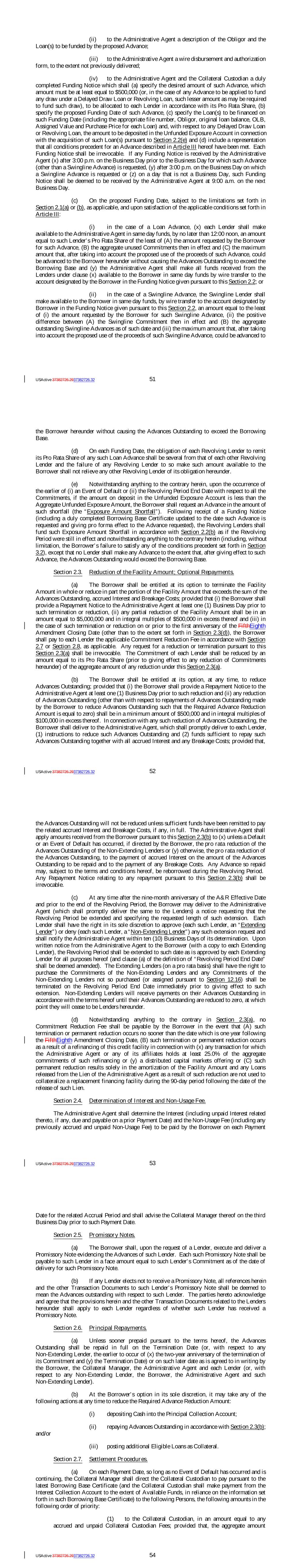(ii) to the Administrative Agent a description of the Obligor and the Loan(s) to be funded by the proposed Advance; (iii) to the Administrative Agent a wire disbursement and authorization form, to the extent not previously delivered; (iv) to the Administrative Agent and the Collateral Custodian a duly completed Funding Notice which shall (a) specify the desired amount of such Advance, which amount must be at least equal to $500,000 (or, in the case of any Advance to be applied to fund any draw under a Delayed Draw Loan or Revolving Loan, such lesser amount as may be required to fund such draw), to be allocated to each Lender in accordance with its Pro Rata Share, (b) specify the proposed Funding Date of such Advance, (c) specify the Loan(s) to be financed on such Funding Date (including the appropriate file number, Obligor, original loan balance, OLB, Assigned Value and Purchase Price for each Loan) and, with respect to any Delayed Draw Loan or Revolving Loan, the amount to be deposited in the Unfunded Exposure Account in connection with the acquisition of such Loan(s) pursuant to Section 2.2(e) and (d) include a representation that all conditions precedent for an Advance described in Article III hereof have been met. Each Funding Notice shall be irrevocable. If any Funding Notice is received by the Administrative Agent (x) after 3:00 p.m. on the Business Day prior to the Business Day for which such Advance (other than a Swingline Advance) is requested, (y) after 3:00 p.m. on the Business Day on which a Swingline Advance is requested or (z) on a day that is not a Business Day, such Funding Notice shall be deemed to be received by the Administrative Agent at 9:00 a.m. on the next Business Day. (c) On the proposed Funding Date, subject to the limitations set forth in Section 2.1(a) or (b), as applicable, and upon satisfaction of the applicable conditions set forth in Article III: (i) in the case of a Loan Advance, (x) each Lender shall make available to the Administrative Agent in same day funds, by no later than 12:00 noon, an amount equal to such Lender’s Pro Rata Share of the least of (A) the amount requested by the Borrower for such Advance, (B) the aggregate unused Commitments then in effect and (C) the maximum amount that, after taking into account the proposed use of the proceeds of such Advance, could be advanced to the Borrower hereunder without causing the Advances Outstanding to exceed the Borrowing Base and (y) the Administrative Agent shall make all funds received from the Lenders under clause (x) available to the Borrower in same day funds by wire transfer to the account designated by the Borrower in the Funding Notice given pursuant to this Section 2.2; or (ii) in the case of a Swingline Advance, the Swingline Lender shall make available to the Borrower in same day funds, by wire transfer to the account designated by Borrower in the Funding Notice given pursuant to this Section 2.2, an amount equal to the least of (i) the amount requested by the Borrower for such Swingline Advance, (ii) the positive difference between (A) the Swingline Commitment then in effect and (B) the aggregate outstanding Swingline Advances as of such date and (iii) the maximum amount that, after taking into account the proposed use of the proceeds of such Swingline Advance, could be advanced to USActive 37382726.2937382726.32 51 the Borrower hereunder without causing the Advances Outstanding to exceed the Borrowing Base. (d) On each Funding Date, the obligation of each Revolving Lender to remit its Pro Rata Share of any such Loan Advance shall be several from that of each other Revolving Lender and the failure of any Revolving Lender to so make such amount available to the Borrower shall not relieve any other Revolving Lender of its obligation hereunder. (e) Notwithstanding anything to the contrary herein, upon the occurrence of the earlier of (i) an Event of Default or (ii) the Revolving Period End Date with respect to all the Commitments, if the amount on deposit in the Unfunded Exposure Account is less than the Aggregate Unfunded Exposure Amount, the Borrower shall request an Advance in the amount of such shortfall (the “Exposure Amount Shortfall”). Following receipt of a Funding Notice (including a duly completed Borrowing Base Certificate updated to the date such Advance is requested and giving pro forma effect to the Advance requested), the Revolving Lenders shall fund such Exposure Amount Shortfall in accordance with Section 2.2(b) as if the Revolving Period were still in effect and notwithstanding anything to the contrary herein (including, without limitation, the Borrower’s failure to satisfy any of the conditions precedent set forth in Section 3.2), except that no Lender shall make any Advance to the extent that, after giving effect to such Advance, the Advances Outstanding would exceed the Borrowing Base. Section 2.3. Reduction of the Facility Amount; Optional Repayments. (a) The Borrower shall be entitled at its option to terminate the Facility Amount in whole or reduce in part the portion of the Facility Amount that exceeds the sum of the Advances Outstanding, accrued Interest and Breakage Costs; provided that (i) the Borrower shall provide a Repayment Notice to the Administrative Agent at least one (1) Business Day prior to such termination or reduction, (ii) any partial reduction of the Facility Amount shall be in an amount equal to $5,000,000 and in integral multiples of $500,000 in excess thereof and (iii) in the case of such termination or reduction on or prior to the first anniversary of the FifthEighth Amendment Closing Date (other than to the extent set forth in Section 2.3(d)), the Borrower shall pay to each Lender the applicable Commitment Reduction Fee in accordance with Section 2.7 or Section 2.8, as applicable. Any request for a reduction or termination pursuant to this Section 2.3(a) shall be irrevocable. The Commitment of each Lender shall be reduced by an amount eq