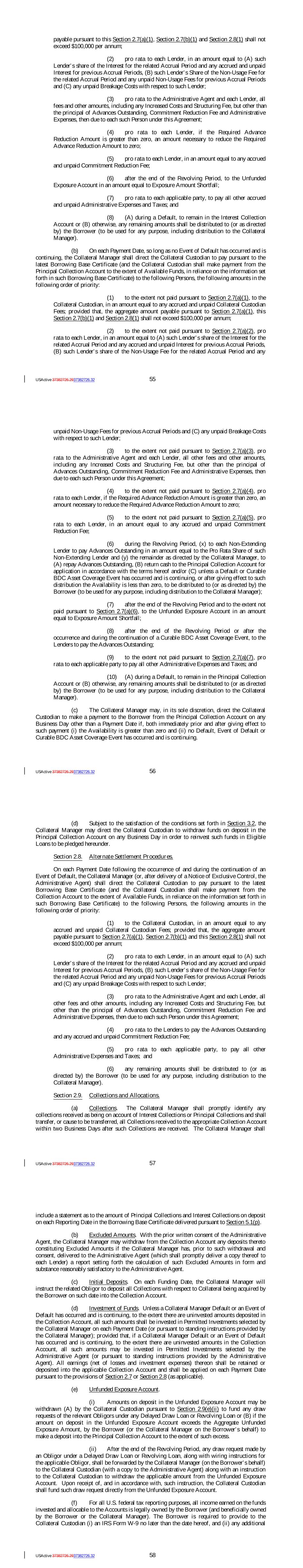 payable pursuant to this Section 2.7(a)(1), Section 2.7(b)(1) and Section 2.8(1) shall not exceed $100,000 per annum; (2) pro rata to each Lender, in an amount equal to (A) such Lender’s share of the Interest for the related Accrual Period and any accrued and unpaid Interest for previous Accrual Periods, (B) such Lender’s Share of the Non-Usage Fee for the related Accrual Period and any unpaid Non-Usage Fees for previous Accrual Periods and (C) any unpaid Breakage Costs with respect to such Lender; (3) pro rata to the Administrative Agent and each Lender, all fees and other amounts, including any Increased Costs and Structuring Fee, but other than the principal of Advances Outstanding, Commitment Reduction Fee and Administrative Expenses, then due to each such Person under this Agreement; (4) pro rata to each Lender, if the Required Advance Reduction Amount is greater than zero, an amount necessary to reduce the Required Advance Reduction Amount to zero; (5) pro rata to each Lender, in an amount equal to any accrued and unpaid Commitment Reduction Fee; (6) after the end of the Revolving Period, to the Unfunded Exposure Account in an amount equal to Exposure Amount Shortfall; (7) pro rata to each applicable party, to pay all other accrued and unpaid Administrative Expenses and Taxes; and (8) (A) during a Default, to remain in the Interest Collection Account or (B) otherwise, any remaining amounts shall be distributed to (or as directed by) the Borrower (to be used for any purpose, including distribution to the Collateral Manager). (b) On each Payment Date, so long as no Event of Default has occurred and is continuing, the Collateral Manager shall direct the Collateral Custodian to pay pursuant to the latest Borrowing Base Certificate (and the Collateral Custodian shall make payment from the Principal Collection Account to the extent of Available Funds, in reliance on the information set forth in such Borrowing Base Certificate) to the following Persons, the following amounts in the following order of priority: (1) to the extent not paid pursuant to Section 2.7(a)(1), to the Collateral Custodian, in an amount equal to any accrued and unpaid Collateral Custodian Fees; provided that, the aggregate amount payable pursuant to Section 2.7(a)(1), this Section 2.7(b)(1) and Section 2.8(1) shall not exceed $100,000 per annum; (2) to the extent not paid pursuant to Section 2.7(a)(2), pro rata to each Lender, in an amount equal to (A) such Lender’s share of the Interest for the related Accrual Period and any accrued and unpaid Interest for previous Accrual Periods, (B) such Lender’s share of the Non-Usage Fee for the related Accrual Period and any USActive 37382726.2937382726.32 55 unpaid Non-Usage Fees for previous Accrual Periods and (C) any unpaid Breakage Costs with respect to such Lender; (3) to the extent not paid pursuant to Section 2.7(a)(3), pro rata to the Administrative Agent and each Lender, all other fees and other amounts, including any Increased Costs and Structuring Fee, but other than the principal of Advances Outstanding, Commitment Reduction Fee and Administrative Expenses, then due to each such Person under this Agreement; (4) to the extent not paid pursuant to Section 2.7(a)(4), pro rata to each Lender, if the Required Advance Reduction Amount is greater than zero, an amount necessary to reduce the Required Advance Reduction Amount to zero; (5) to the extent not paid pursuant to Section 2.7(a)(5), pro rata to each Lender, in an amount equal to any accrued and unpaid Commitment Reduction Fee; (6) during the Revolving Period, (x) to each Non-Extending Lender to pay Advances Outstanding in an amount equal to the Pro Rata Share of such Non-Extending Lender and (y) the remainder as directed by the Collateral Manager, to (A) repay Advances Outstanding, (B) return cash to the Principal Collection Account for application in accordance with the terms hereof and/or (C) unless a Default or Curable BDC Asset Coverage Event has occurred and is continuing, or after giving effect to such distribution the Availability is less than zero, to be distributed to (or as directed by) the Borrower (to be used for any purpose, including distribution to the Collateral Manager); (7) after the end of the Revolving Period and to the extent not paid pursuant to Section 2.7(a)(6), to the Unfunded Exposure Account in an amount equal to Exposure Amount Shortfall; (8) after the end of the Revolving Period or after the occurrence and during the continuation of a Curable BDC Asset Coverage Event, to the Lenders to pay the Advances Outstanding; (9) to the extent not paid pursuant to Section 2.7(a)(7), pro rata to each applicable party to pay all other Administrative Expenses and Taxes; and (10) (A) during a Default, to remain in the Principal Collection Account or (B) otherwise, any remaining amounts shall be distributed to (or as directed by) the Borrower (to be used for any purpose, including distribution to the Collateral Manager). (c) The Collateral Manager may, in its sole discretion, direct the Collateral Custodian to make a payment to the Borrower from the Principal Collection Account on any Business Day other than a Payment Date if, both immediately prior and after giving effect to such payment (i) the Availability is greater than zero and (ii) no Default, Event of Default or Curable BDC Asset Coverage Event has occurred and is continuing. USActive 37382726.2937382726.32 56 (d) Subject to the satisfaction of the conditions set forth in Section 3.2, the Collateral Manager may direct the Collateral Custodian to withdraw funds on deposit in the Principal Collection Account on any Business Day in order to reinvest such funds in Eligible Loans to be pledged hereunder. Section 2.8. Alternate Settlement Procedures. On each Payment Date following the occurrence of and during the continuation of an Event of Default, the Collateral Manager (or, after delivery of a Notice of Exclusive Control, the Administrati