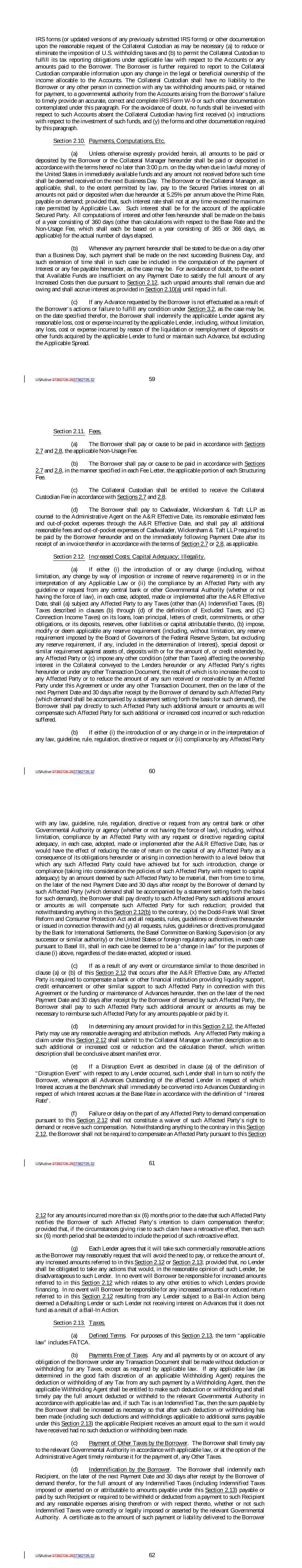 IRS forms (or updated versions of any previously submitted IRS forms) or other documentation upon the reasonable request of the Collateral Custodian as may be necessary (a) to reduce or eliminate the imposition of U.S. withholding taxes and (b) to permit the Collateral Custodian to fulfill its tax reporting obligations under applicable law with respect to the Accounts or any amounts paid to the Borrower. The Borrower is further required to report to the Collateral Custodian comparable information upon any change in the legal or beneficial ownership of the income allocable to the Accounts. The Collateral Custodian shall have no liability to the Borrower or any other person in connection with any tax withholding amounts paid, or retained for payment, to a governmental authority from the Accounts arising from the Borrower’s failure to timely provide an accurate, correct and complete IRS Form W-9 or such other documentation contemplated under this paragraph. For the avoidance of doubt, no funds shall be invested with respect to such Accounts absent the Collateral Custodian having first received (x) instructions with respect to the investment of such funds, and (y) the forms and other documentation required by this paragraph. Section 2.10. Payments, Computations, Etc. (a) Unless otherwise expressly provided herein, all amounts to be paid or deposited by the Borrower or the Collateral Manager hereunder shall be paid or deposited in accordance with the terms hereof no later than 3:00 p.m. on the day when due in lawful money of the United States in immediately available funds and any amount not received before such time shall be deemed received on the next Business Day. The Borrower or the Collateral Manager, as applicable, shall, to the extent permitted by law, pay to the Secured Parties interest on all amounts not paid or deposited when due hereunder at 5.25% per annum above the Prime Rate, payable on demand; provided that, such interest rate shall not at any time exceed the maximum rate permitted by Applicable Law. Such interest shall be for the account of the applicable Secured Party. All computations of interest and other fees hereunder shall be made on the basis of a year consisting of 360 days (other than calculations with respect to the Base Rate and the Non-Usage Fee, which shall each be based on a year consisting of 365 or 366 days, as applicable) for the actual number of days elapsed. (b) Whenever any payment hereunder shall be stated to be due on a day other than a Business Day, such payment shall be made on the next succeeding Business Day, and such extension of time shall in such case be included in the computation of the payment of Interest or any fee payable hereunder, as the case may be. For avoidance of doubt, to the extent that Available Funds are insufficient on any Payment Date to satisfy the full amount of any Increased Costs then due pursuant to Section 2.12, such unpaid amounts shall remain due and owing and shall accrue interest as provided in Section 2.10(a) until repaid in full. (c) If any Advance requested by the Borrower is not effectuated as a result of the Borrower’s actions or failure to fulfill any condition under Section 3.2, as the case may be, on the date specified therefor, the Borrower shall indemnify the applicable Lender against any reasonable loss, cost or expense incurred by the applicable Lender, including, without limitation, any loss, cost or expense incurred by reason of the liquidation or reemployment of deposits or other funds acquired by the applicable Lender to fund or maintain such Advance, but excluding the Applicable Spread. USActive 37382726.2937382726.32 59 Section 2.11. Fees. (a) The Borrower shall pay or cause to be paid in accordance with Sections 2.7 and 2.8, the applicable Non-Usage Fee. (b) The Borrower shall pay or cause to be paid in accordance with Sections 2.7 and 2.8, in the manner specified in each Fee Letter, the applicable portion of each Structuring Fee. (c) The Collateral Custodian shall be entitled to receive the Collateral Custodian Fee in accordance with Sections 2.7 and 2.8. (d) The Borrower shall pay to Cadwalader, Wickersham & Taft LLP as counsel to the Administrative Agent on the A&R Effective Date, its reasonable estimated fees and out-of-pocket expenses through the A&R Effective Date, and shall pay all additional reasonable fees and out-of-pocket expenses of Cadwalader, Wickersham & Taft LLP required to be paid by the Borrower hereunder and on the immediately following Payment Date after its receipt of an invoice therefor in accordance with the terms of Section 2.7 or 2.8, as applicable. Section 2.12. Increased Costs; Capital Adequacy; Illegality. (a) If either (i) the introduction of or any change (including, without limitation, any change by way of imposition or increase of reserve requirements) in or in the interpretation of any Applicable Law or (ii) the compliance by an Affected Party with any guideline or request from any central bank or other Governmental Authority (whether or not having the force of law), in each case, adopted, made or implemented after the A&R Effective Date, shall (a) subject any Affected Party to any Taxes (other than (A) Indemnified Taxes, (B) Taxes described in clauses (b) through (d) of the definition of Excluded Taxes, and (C) Connection Income Taxes) on its loans, loan principal, letters of credit, commitments, or other obligations, or its deposits, reserves, other liabilities or capital attributable thereto, (b) impose, modify or deem applicable any reserve requirement (including, without limitation, any reserve requirement imposed by the Board of Governors of the Federal Reserve System, but excluding any reserve requirement, if any, included in the determination of Interest), special deposit or similar requirement against assets of, deposits with or for the amount of, or credit extended by, any Affected Party or (c) impose any other condition (other than Taxes) affecting the own