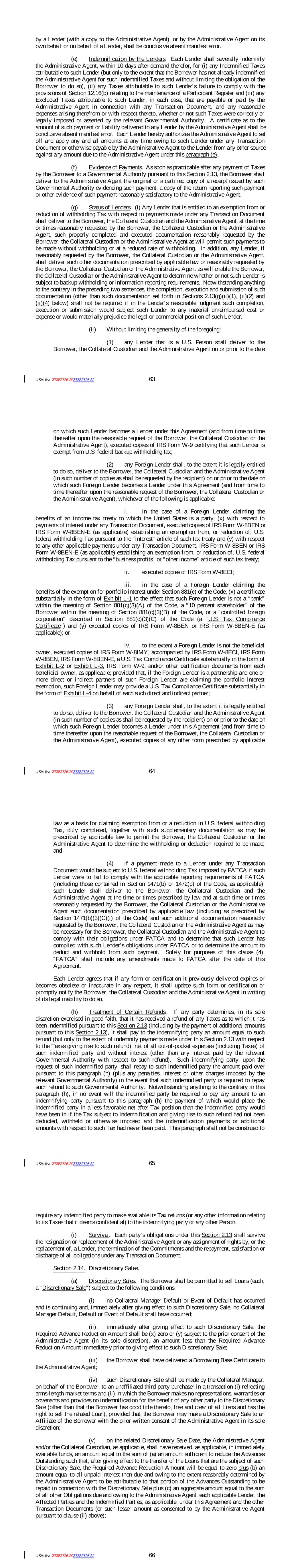 by a Lender (with a copy to the Administrative Agent), or by the Administrative Agent on its own behalf or on behalf of a Lender, shall be conclusive absent manifest error. (e) Indemnification by the Lenders. Each Lender shall severally indemnify the Administrative Agent, within 10 days after demand therefor, for (i) any Indemnified Taxes attributable to such Lender (but only to the extent that the Borrower has not already indemnified the Administrative Agent for such Indemnified Taxes and without limiting the obligation of the Borrower to do so), (ii) any Taxes attributable to such Lender’s failure to comply with the provisions of Section 12.16(b) relating to the maintenance of a Participant Register and (iii) any Excluded Taxes attributable to such Lender, in each case, that are payable or paid by the Administrative Agent in connection with any Transaction Document, and any reasonable expenses arising therefrom or with respect thereto, whether or not such Taxes were correctly or legally imposed or asserted by the relevant Governmental Authority. A certificate as to the amount of such payment or liability delivered to any Lender by the Administrative Agent shall be conclusive absent manifest error. Each Lender hereby authorizes the Administrative Agent to set off and apply any and all amounts at any time owing to such Lender under any Transaction Document or otherwise payable by the Administrative Agent to the Lender from any other source against any amount due to the Administrative Agent under this paragraph (e). (f) Evidence of Payments. As soon as practicable after any payment of Taxes by the Borrower to a Governmental Authority pursuant to this Section 2.13, the Borrower shall deliver to the Administrative Agent the original or a certified copy of a receipt issued by such Governmental Authority evidencing such payment, a copy of the return reporting such payment or other evidence of such payment reasonably satisfactory to the Administrative Agent. (g) Status of Lenders. (i) Any Lender that is entitled to an exemption from or reduction of withholding Tax with respect to payments made under any Transaction Document shall deliver to the Borrower, the Collateral Custodian and the Administrative Agent, at the time or times reasonably requested by the Borrower, the Collateral Custodian or the Administrative Agent, such properly completed and executed documentation reasonably requested by the Borrower, the Collateral Custodian or the Administrative Agent as will permit such payments to be made without withholding or at a reduced rate of withholding. In addition, any Lender, if reasonably requested by the Borrower, the Collateral Custodian or the Administrative Agent, shall deliver such other documentation prescribed by applicable law or reasonably requested by the Borrower, the Collateral Custodian or the Administrative Agent as will enable the Borrower, the Collateral Custodian or the Administrative Agent to determine whether or not such Lender is subject to backup withholding or information reporting requirements. Notwithstanding anything to the contrary in the preceding two sentences, the completion, execution and submission of such documentation (other than such documentation set forth in Sections 2.13(g)(ii)(1), (ii)(2) and (ii)(4) below) shall not be required if in the Lender’s reasonable judgment such completion, execution or submission would subject such Lender to any material unreimbursed cost or expense or would materially prejudice the legal or commercial position of such Lender. (ii) Without limiting the generality of the foregoing: (1) any Lender that is a U.S. Person shall deliver to the Borrower, the Collateral Custodian and the Administrative Agent on or prior to the date USActive 37382726.2937382726.32 63 on which such Lender becomes a Lender under this Agreement (and from time to time thereafter upon the reasonable request of the Borrower, the Collateral Custodian or the Administrative Agent), executed copies of IRS Form W-9 certifying that such Lender is exempt from U.S. federal backup withholding tax; (2) any Foreign Lender shall, to the extent it is legally entitled to do so, deliver to the Borrower, the Collateral Custodian and the Administrative Agent (in such number of copies as shall be requested by the recipient) on or prior to the date on which such Foreign Lender becomes a Lender under this Agreement (and from time to time thereafter upon the reasonable request of the Borrower, the Collateral Custodian or the Administrative Agent), whichever of the following is applicable: i. in the case of a Foreign Lender claiming the benefits of an income tax treaty to which the United States is a party, (x) with respect to payments of interest under any Transaction Document, executed copies of IRS Form W-8BEN or IRS Form W-8BEN-E (as applicable) establishing an exemption from, or reduction of, U.S. federal withholding Tax pursuant to the “interest” article of such tax treaty and (y) with respect to any other applicable payments under any Transaction Document, IRS Form W-8BEN or IRS Form W-8BEN-E (as applicable) establishing an exemption from, or reduction of, U.S. federal withholding Tax pursuant to the “business profits” or “other income” article of such tax treaty; ii. executed copies of IRS Form W-8ECI; iii. in the case of a Foreign Lender claiming the benefits of the exemption for portfolio interest under Section 881(c) of the Code, (x) a certificate substantially in the form of Exhibit L-1 to the effect that such Foreign Lender is not a “bank” within the meaning of Section 881(c)(3)(A) of the Code, a “10 percent shareholder” of the Borrower within the meaning of Section 881(c)(3)(B) of the Code, or a “controlled foreign corporation” described in Section 881(c)(3)(C) of the Code (a “U.S. Tax Compliance Certificate”) and (y) executed copies of IRS Form W-8BEN or IRS Form W-8BEN-E (as applicable); or iv. to the extent a Foreign Lender is not