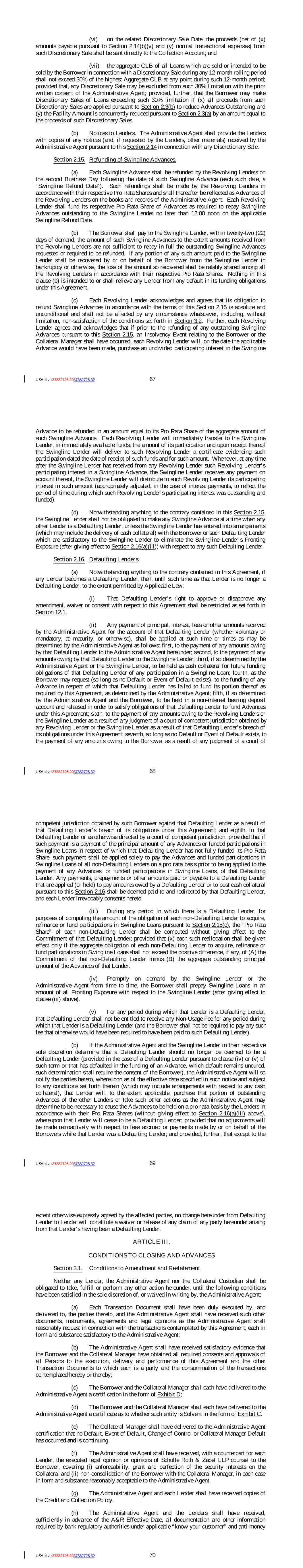 (vi) on the related Discretionary Sale Date, the proceeds (net of (x) amounts payable pursuant to Section 2.14(b)(v) and (y) normal transactional expenses) from such Discretionary Sale shall be sent directly to the Collection Account; and (vii) the aggregate OLB of all Loans which are sold or intended to be sold by the Borrower in connection with a Discretionary Sale during any 12-month rolling period shall not exceed 30% of the highest Aggregate OLB at any point during such 12-month period; provided that, any Discretionary Sale may be excluded from such 30% limitation with the prior written consent of the Administrative Agent; provided, further, that the Borrower may make Discretionary Sales of Loans exceeding such 30% limitation if (x) all proceeds from such Discretionary Sales are applied pursuant to Section 2.3(b) to reduce Advances Outstanding and (y) the Facility Amount is concurrently reduced pursuant to Section 2.3(a) by an amount equal to the proceeds of such Discretionary Sales. (b) Notices to Lenders. The Administrative Agent shall provide the Lenders with copies of any notices (and, if requested by the Lenders, other materials) received by the Administrative Agent pursuant to this Section 2.14 in connection with any Discretionary Sale. Section 2.15. Refunding of Swingline Advances. (a) Each Swingline Advance shall be refunded by the Revolving Lenders on the second Business Day following the date of such Swingline Advance (each such date, a “Swingline Refund Date”). Such refundings shall be made by the Revolving Lenders in accordance with their respective Pro Rata Shares and shall thereafter be reflected as Advances of the Revolving Lenders on the books and records of the Administrative Agent. Each Revolving Lender shall fund its respective Pro Rata Share of Advances as required to repay Swingline Advances outstanding to the Swingline Lender no later than 12:00 noon on the applicable Swingline Refund Date. (b) The Borrower shall pay to the Swingline Lender, within twenty-two (22) days of demand, the amount of such Swingline Advances to the extent amounts received from the Revolving Lenders are not sufficient to repay in full the outstanding Swingline Advances requested or required to be refunded. If any portion of any such amount paid to the Swingline Lender shall be recovered by or on behalf of the Borrower from the Swingline Lender in bankruptcy or otherwise, the loss of the amount so recovered shall be ratably shared among all the Revolving Lenders in accordance with their respective Pro Rata Shares. Nothing in this clause (b) is intended to or shall relieve any Lender from any default in its funding obligations under this Agreement. (c) Each Revolving Lender acknowledges and agrees that its obligation to refund Swingline Advances in accordance with the terms of this Section 2.15 is absolute and unconditional and shall not be affected by any circumstance whatsoever, including, without limitation, non-satisfaction of the conditions set forth in Section 3.2. Further, each Revolving Lender agrees and acknowledges that if prior to the refunding of any outstanding Swingline Advances pursuant to this Section 2.15, an Insolvency Event relating to the Borrower or the Collateral Manager shall have occurred, each Revolving Lender will, on the date the applicable Advance would have been made, purchase an undivided participating interest in the Swingline USActive 37382726.2937382726.32 67 Advance to be refunded in an amount equal to its Pro Rata Share of the aggregate amount of such Swingline Advance. Each Revolving Lender will immediately transfer to the Swingline Lender, in immediately available funds, the amount of its participation and upon receipt thereof the Swingline Lender will deliver to such Revolving Lender a certificate evidencing such participation dated the date of receipt of such funds and for such amount. Whenever, at any time after the Swingline Lender has received from any Revolving Lender such Revolving Lender’s participating interest in a Swingline Advance, the Swingline Lender receives any payment on account thereof, the Swingline Lender will distribute to such Revolving Lender its participating interest in such amount (appropriately adjusted, in the case of interest payments, to reflect the period of time during which such Revolving Lender’s participating interest was outstanding and funded). (d) Notwithstanding anything to the contrary contained in this Section 2.15, the Swingline Lender shall not be obligated to make any Swingline Advance at a time when any other Lender is a Defaulting Lender, unless the Swingline Lender has entered into arrangements (which may include the delivery of cash collateral) with the Borrower or such Defaulting Lender which are satisfactory to the Swingline Lender to eliminate the Swingline Lender’s Fronting Exposure (after giving effect to Section 2.16(a)(iii)) with respect to any such Defaulting Lender. Section 2.16. Defaulting Lenders. (a) Notwithstanding anything to the contrary contained in this Agreement, if any Lender becomes a Defaulting Lender, then, until such time as that Lender is no longer a Defaulting Lender, to the extent permitted by Applicable Law: (i) That Defaulting Lender’s right to approve or disapprove any amendment, waiver or consent with respect to this Agreement shall be restricted as set forth in Section 12.1. (ii) Any payment of principal, interest, fees or other amounts received by the Administrative Agent for the account of that Defaulting Lender (whether voluntary or mandatory, at maturity, or otherwise), shall be applied at such time or times as may be determined by the Administrative Agent as follows: first, to the payment of any amounts owing by that Defaulting Lender to the Administrative Agent hereunder; second, to the payment of any amounts owing by that Defaulting Lender to the Swingline Lender; third, if so determined by the Administrative Agent or the Swingline Lender, to be held as ca