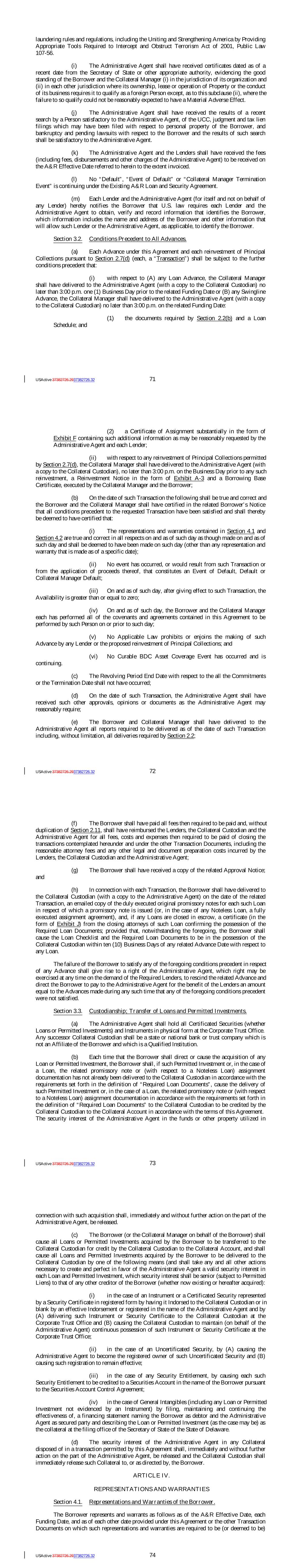 laundering rules and regulations, including the Uniting and Strengthening America by Providing Appropriate Tools Required to Intercept and Obstruct Terrorism Act of 2001, Public Law 107-56. (i) The Administrative Agent shall have received certificates dated as of a recent date from the Secretary of State or other appropriate authority, evidencing the good standing of the Borrower and the Collateral Manager (i) in the jurisdiction of its organization and (ii) in each other jurisdiction where its ownership, lease or operation of Property or the conduct of its business requires it to qualify as a foreign Person except, as to this subclause (ii), where the failure to so qualify could not be reasonably expected to have a Material Adverse Effect. (j) The Administrative Agent shall have received the results of a recent search by a Person satisfactory to the Administrative Agent, of the UCC, judgment and tax lien filings which may have been filed with respect to personal property of the Borrower, and bankruptcy and pending lawsuits with respect to the Borrower and the results of such search shall be satisfactory to the Administrative Agent. (k) The Administrative Agent and the Lenders shall have received the fees (including fees, disbursements and other charges of the Administrative Agent) to be received on the A&R Effective Date referred to herein to the extent invoiced. (l) No “Default”, “Event of Default” or “Collateral Manager Termination Event” is continuing under the Existing A&R Loan and Security Agreement. (m) Each Lender and the Administrative Agent (for itself and not on behalf of any Lender) hereby notifies the Borrower that U.S. law requires each Lender and the Administrative Agent to obtain, verify and record information that identifies the Borrower, which information includes the name and address of the Borrower and other information that will allow such Lender or the Administrative Agent, as applicable, to identify the Borrower. Section 3.2. Conditions Precedent to All Advances. (a) Each Advance under this Agreement and each reinvestment of Principal Collections pursuant to Section 2.7(d) (each, a “Transaction”) shall be subject to the further conditions precedent that: (i) with respect to (A) any Loan Advance, the Collateral Manager shall have delivered to the Administrative Agent (with a copy to the Collateral Custodian) no later than 3:00 p.m. one (1) Business Day prior to the related Funding Date or (B) any Swingline Advance, the Collateral Manager shall have delivered to the Administrative Agent (with a copy to the Collateral Custodian) no later than 3:00 p.m. on the related Funding Date: (1) the documents required by Section 2.2(b) and a Loan Schedule; and USActive 37382726.2937382726.32 71 (2) a Certificate of Assignment substantially in the form of Exhibit F containing such additional information as may be reasonably requested by the Administrative Agent and each Lender; (ii) with respect to any reinvestment of Principal Collections permitted by Section 2.7(d), the Collateral Manager shall have delivered to the Administrative Agent (with a copy to the Collateral Custodian), no later than 3:00 p.m. on the Business Day prior to any such reinvestment, a Reinvestment Notice in the form of Exhibit A-3 and a Borrowing Base Certificate, executed by the Collateral Manager and the Borrower; (b) On the date of such Transaction the following shall be true and correct and the Borrower and the Collateral Manager shall have certified in the related Borrower’s Notice that all conditions precedent to the requested Transaction have been satisfied and shall thereby be deemed to have certified that: (i) The representations and warranties contained in Section 4.1 and Section 4.2 are true and correct in all respects on and as of such day as though made on and as of such day and shall be deemed to have been made on such day (other than any representation and warranty that is made as of a specific date); (ii) No event has occurred, or would result from such Transaction or from the application of proceeds thereof, that constitutes an Event of Default, Default or Collateral Manager Default; (iii) On and as of such day, after giving effect to such Transaction, the Availability is greater than or equal to zero; (iv) On and as of such day, the Borrower and the Collateral Manager each has performed all of the covenants and agreements contained in this Agreement to be performed by such Person on or prior to such day; (v) No Applicable Law prohibits or enjoins the making of such Advance by any Lender or the proposed reinvestment of Principal Collections; and (vi) No Curable BDC Asset Coverage Event has occurred and is continuing. (c) The Revolving Period End Date with respect to the all the Commitments or the Termination Date shall not have occurred; (d) On the date of such Transaction, the Administrative Agent shall have received such other approvals, opinions or documents as the Administrative Agent may reasonably require; (e) The Borrower and Collateral Manager shall have delivered to the Administrative Agent all reports required to be delivered as of the date of such Transaction including, without limitation, all deliveries required by Section 2.2; USActive 37382726.2937382726.32 72 (f) The Borrower shall have paid all fees then required to be paid and, without duplication of Section 2.11, shall have reimbursed the Lenders, the Collateral Custodian and the Administrative Agent for all fees, costs and expenses then required to be paid of closing the transactions contemplated hereunder and under the other Transaction Documents, including the reasonable attorney fees and any other legal and document preparation costs incurred by the Lenders, the Collateral Custodian and the Administrative Agent; (g) The Borrower shall have received a copy of the related Approval Notice; and (h) In connection with each Transaction, the Borrower shall have delivered to the Collateral Custodian (with a c