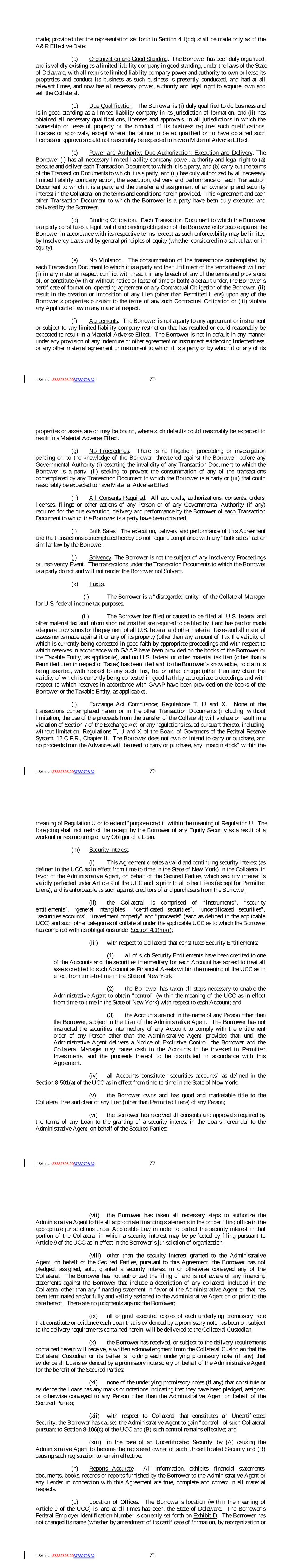 made; provided that the representation set forth in Section 4.1(dd) shall be made only as of the A&R Effective Date: (a) Organization and Good Standing. The Borrower has been duly organized, and is validly existing as a limited liability company in good standing, under the laws of the State of Delaware, with all requisite limited liability company power and authority to own or lease its properties and conduct its business as such business is presently conducted, and had at all relevant times, and now has all necessary power, authority and legal right to acquire, own and sell the Collateral. (b) Due Qualification. The Borrower is (i) duly qualified to do business and is in good standing as a limited liability company in its jurisdiction of formation, and (ii) has obtained all necessary qualifications, licenses and approvals, in all jurisdictions in which the ownership or lease of property or the conduct of its business requires such qualifications, licenses or approvals, except where the failure to be so qualified or to have obtained such licenses or approvals could not reasonably be expected to have a Material Adverse Effect. (c) Power and Authority; Due Authorization; Execution and Delivery. The Borrower (i) has all necessary limited liability company power, authority and legal right to (a) execute and deliver each Transaction Document to which it is a party, and (b) carry out the terms of the Transaction Documents to which it is a party, and (ii) has duly authorized by all necessary limited liability company action, the execution, delivery and performance of each Transaction Document to which it is a party and the transfer and assignment of an ownership and security interest in the Collateral on the terms and conditions herein provided. This Agreement and each other Transaction Document to which the Borrower is a party have been duly executed and delivered by the Borrower. (d) Binding Obligation. Each Transaction Document to which the Borrower is a party constitutes a legal, valid and binding obligation of the Borrower enforceable against the Borrower in accordance with its respective terms, except as such enforceability may be limited by Insolvency Laws and by general principles of equity (whether considered in a suit at law or in equity). (e) No Violation. The consummation of the transactions contemplated by each Transaction Document to which it is a party and the fulfillment of the terms thereof will not (i) in any material respect conflict with, result in any breach of any of the terms and provisions of, or constitute (with or without notice or lapse of time or both) a default under, the Borrower’s certificate of formation, operating agreement or any Contractual Obligation of the Borrower, (ii) result in the creation or imposition of any Lien (other than Permitted Liens) upon any of the Borrower’s properties pursuant to the terms of any such Contractual Obligation or (iii) violate any Applicable Law in any material respect. (f) Agreements. The Borrower is not a party to any agreement or instrument or subject to any limited liability company restriction that has resulted or could reasonably be expected to result in a Material Adverse Effect. The Borrower is not in default in any manner under any provision of any indenture or other agreement or instrument evidencing Indebtedness, or any other material agreement or instrument to which it is a party or by which it or any of its USActive 37382726.2937382726.32 75 properties or assets are or may be bound, where such defaults could reasonably be expected to result in a Material Adverse Effect. (g) No Proceedings. There is no litigation, proceeding or investigation pending or, to the knowledge of the Borrower, threatened against the Borrower, before any Governmental Authority (i) asserting the invalidity of any Transaction Document to which the Borrower is a party, (ii) seeking to prevent the consummation of any of the transactions contemplated by any Transaction Document to which the Borrower is a party or (iii) that could reasonably be expected to have Material Adverse Effect. (h) All Consents Required. All approvals, authorizations, consents, orders, licenses, filings or other actions of any Person or of any Governmental Authority (if any) required for the due execution, delivery and performance by the Borrower of each Transaction Document to which the Borrower is a party have been obtained. (i) Bulk Sales. The execution, delivery and performance of this Agreement and the transactions contemplated hereby do not require compliance with any “bulk sales” act or similar law by the Borrower. (j) Solvency. The Borrower is not the subject of any Insolvency Proceedings or Insolvency Event. The transactions under the Transaction Documents to which the Borrower is a party do not and will not render the Borrower not Solvent. (k) Taxes. (i) The Borrower is a “disregarded entity” of the Collateral Manager for U.S. federal income tax purposes. (ii) The Borrower has filed or caused to be filed all U.S. federal and other material tax and information returns that are required to be filed by it and has paid or made adequate provisions for the payment of all U.S. federal and other material Taxes and all material assessments made against it or any of its property (other than any amount of Tax the validity of which is currently being contested in good faith by appropriate proceedings and with respect to which reserves in accordance with GAAP have been provided on the books of the Borrower or the Taxable Entity, as applicable), and no U.S. federal or other material tax lien (other than a Permitted Lien in respect of Taxes) has been filed and, to the Borrower’s knowledge, no claim is being asserted, with respect to any such Tax, fee or other charge (other than any claim the validity of which is currently being contested in good faith by appropriate proceedings and with respect to which reserves in accordance with GAAP have been provided on the b