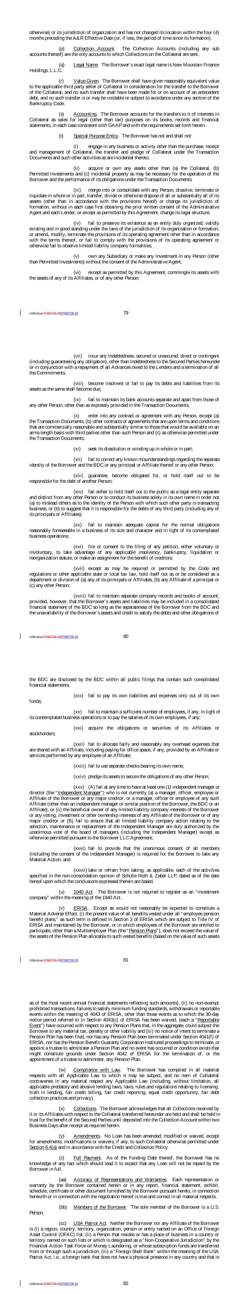 otherwise) or its jurisdiction of organization and has not changed its location within the four (4) months preceding the A&R Effective Date (or, if less, the period of time since its formation). (p) Collection Account. The Collection Accounts (including any sub accounts thereof) are the only accounts to which Collections on the Collateral are sent. (q) Legal Name. The Borrower’s exact legal name is New Mountain Finance Holdings, L.L.C. (r) Value Given. The Borrower shall have given reasonably equivalent value to the applicable third party seller of Collateral in consideration for the transfer to the Borrower of the Collateral, and no such transfer shall have been made for or on account of an antecedent debt, and no such transfer is or may be voidable or subject to avoidance under any section of the Bankruptcy Code. (s) Accounting. The Borrower accounts for the transfers to it of interests in Collateral as sales for legal (other than tax) purposes on its books, records and financial statements, in each case consistent with GAAP and with the requirements set forth herein. (t) Special Purpose Entity. The Borrower has not and shall not: (i) engage in any business or activity other than the purchase, receipt and management of Collateral, the transfer and pledge of Collateral under the Transaction Documents and such other activities as are incidental thereto; (ii) acquire or own any assets other than (a) the Collateral, (b) Permitted Investments and (c) incidental property as may be necessary for the operation of the Borrower and the performance of its obligations under the Transaction Documents; (iii) merge into or consolidate with any Person, dissolve, terminate or liquidate in whole or in part, transfer, divide or otherwise dispose of all or substantially all of its assets (other than in accordance with the provisions hereof) or change its jurisdiction of formation, without in each case first obtaining the prior written consent of the Administrative Agent and each Lender, or except as permitted by this Agreement, change its legal structure; (iv) fail to preserve its existence as an entity duly organized, validly existing and in good standing under the laws of the jurisdiction of its organization or formation, or amend, modify, terminate the provisions of its operating agreement other than in accordance with the terms thereof, or fail to comply with the provisions of its operating agreement or otherwise fail to observe limited liability company formalities; (v) own any Subsidiary or make any Investment in any Person (other than Permitted Investments) without the consent of the Administrative Agent; (vi) except as permitted by this Agreement, commingle its assets with the assets of any of its Affiliates, or of any other Person; USActive 37382726.2937382726.32 79 (vii) incur any Indebtedness, secured or unsecured, direct or contingent (including guaranteeing any obligation), other than Indebtedness to the Secured Parties hereunder or in conjunction with a repayment of all Advances owed to the Lenders and a termination of all the Commitments; (viii) become insolvent or fail to pay its debts and liabilities from its assets as the same shall become due; (ix) fail to maintain its bank accounts separate and apart from those of any other Person, other than as expressly provided in the Transaction Documents; (x) enter into any contract or agreement with any Person, except (a) the Transaction Documents, (b) other contracts or agreements that are upon terms and conditions that are commercially reasonable and substantially similar to those that would be available on an arms-length basis with third parties other than such Person and (c) as otherwise permitted under the Transaction Documents; (xi) seek its dissolution or winding up in whole or in part; (xii) fail to correct any known misunderstandings regarding the separate identity of the Borrower and the BDC or any principal or Affiliate thereof or any other Person; (xiii) guarantee, become obligated for, or hold itself out to be responsible for the debt of another Person; (xiv) fail either to hold itself out to the public as a legal entity separate and distinct from any other Person or to conduct its business solely in its own name in order not (a) to mislead others as to the identity of the Person with which such other party is transacting business, or (b) to suggest that it is responsible for the debts of any third party (including any of its principals or Affiliates); (xv) fail to maintain adequate capital for the normal obligations reasonably foreseeable in a business of its size and character and in light of its contemplated business operations; (xvi) file or consent to the filing of any petition, either voluntary or involuntary, to take advantage of any applicable insolvency, bankruptcy, liquidation or reorganization statute, or make an assignment for the benefit of creditors; (xvii) except as may be required or permitted by the Code and regulations or other applicable state or local tax law, hold itself out as or be considered as a department or division of (a) any of its principals or Affiliates, (b) any Affiliate of a principal or (c) any other Person; (xviii) fail to maintain separate company records and books of account; provided, however, that the Borrower’s assets and liabilities may be included in a consolidated financial statement of the BDC so long as the separateness of the Borrower from the BDC and the unavailability of the Borrower’s assets and credit to satisfy the debts and other obligations of USActive 37382726.2937382726.32 80 the BDC are disclosed by the BDC within all public filings that contain such consolidated financial statements; (xix) fail to pay its own liabilities and expenses only out of its own funds; (xx) fail to maintain a sufficient number of employees, if any, in light of its contemplated business operations or to pay the salaries of its own employees, if any; (xxi) acquire the obligations or securities of i