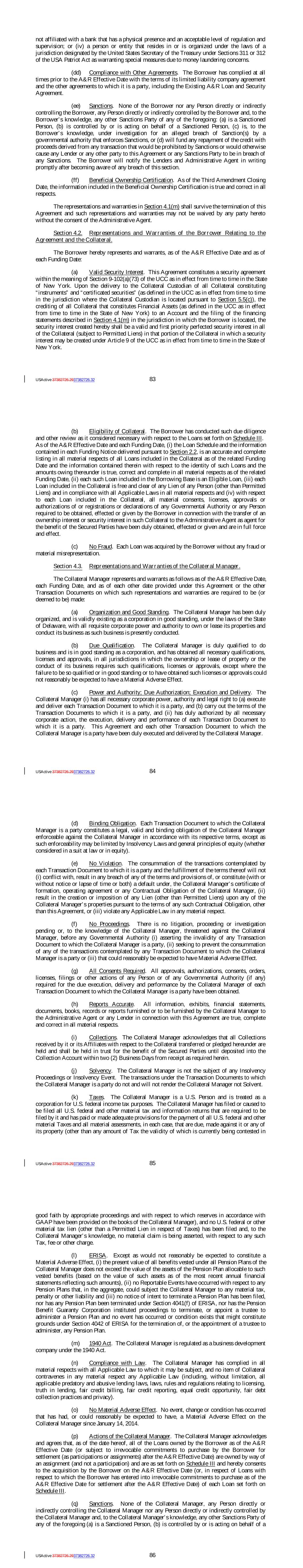 not affiliated with a bank that has a physical presence and an acceptable level of regulation and supervision; or (iv) a person or entity that resides in or is organized under the laws of a jurisdiction designated by the United States Secretary of the Treasury under Sections 311 or 312 of the USA Patriot Act as warranting special measures due to money laundering concerns. (dd) Compliance with Other Agreements. The Borrower has complied at all times prior to the A&R Effective Date with the terms of its limited liability company agreement and the other agreements to which it is a party, including the Existing A&R Loan and Security Agreement. (ee) Sanctions. None of the Borrower nor any Person directly or indirectly controlling the Borrower, any Person directly or indirectly controlled by the Borrower and, to the Borrower’s knowledge, any other Sanctions Party of any of the foregoing: (a) is a Sanctioned Person, (b) is controlled by or is acting on behalf of a Sanctioned Person, (c) is, to the Borrower’s knowledge, under investigation for an alleged breach of Sanction(s) by a governmental authority that enforces Sanctions, or (d) will fund any repayment of the credit with proceeds derived from any transaction that would be prohibited by Sanctions or would otherwise cause any Lender or any other party to this Agreement or any Sanctions Party to be in breach of any Sanctions. The Borrower will notify the Lenders and Administrative Agent in writing promptly after becoming aware of any breach of this section. (ff) Beneficial Ownership Certification. As of the Third Amendment Closing Date, the information included in the Beneficial Ownership Certification is true and correct in all respects. The representations and warranties in Section 4.1(m) shall survive the termination of this Agreement and such representations and warranties may not be waived by any party hereto without the consent of the Administrative Agent. Section 4.2. Representations and Warranties of the Borrower Relating to the Agreement and the Collateral. The Borrower hereby represents and warrants, as of the A&R Effective Date and as of each Funding Date: (a) Valid Security Interest. This Agreement constitutes a security agreement within the meaning of Section 9-102(a)(73) of the UCC as in effect from time to time in the State of New York. Upon the delivery to the Collateral Custodian of all Collateral constituting “instruments” and “certificated securities” (as defined in the UCC as in effect from time to time in the jurisdiction where the Collateral Custodian is located pursuant to Section 5.5(c)), the crediting of all Collateral that constitutes Financial Assets (as defined in the UCC as in effect from time to time in the State of New York) to an Account and the filing of the financing statements described in Section 4.1(m) in the jurisdiction in which the Borrower is located, the security interest created hereby shall be a valid and first priority perfected security interest in all of the Collateral (subject to Permitted Liens) in that portion of the Collateral in which a security interest may be created under Article 9 of the UCC as in effect from time to time in the State of New York. USActive 37382726.2937382726.32 83 (b) Eligibility of Collateral. The Borrower has conducted such due diligence and other review as it considered necessary with respect to the Loans set forth on Schedule III. As of the A&R Effective Date and each Funding Date, (i) the Loan Schedule and the information contained in each Funding Notice delivered pursuant to Section 2.2, is an accurate and complete listing in all material respects of all Loans included in the Collateral as of the related Funding Date and the information contained therein with respect to the identity of such Loans and the amounts owing thereunder is true, correct and complete in all material respects as of the related Funding Date, (ii) each such Loan included in the Borrowing Base is an Eligible Loan, (iii) each Loan included in the Collateral is free and clear of any Lien of any Person (other than Permitted Liens) and in compliance with all Applicable Laws in all material respects and (iv) with respect to each Loan included in the Collateral, all material consents, licenses, approvals or authorizations of or registrations or declarations of any Governmental Authority or any Person required to be obtained, effected or given by the Borrower in connection with the transfer of an ownership interest or security interest in such Collateral to the Administrative Agent as agent for the benefit of the Secured Parties have been duly obtained, effected or given and are in full force and effect. (c) No Fraud. Each Loan was acquired by the Borrower without any fraud or material misrepresentation. Section 4.3. Representations and Warranties of the Collateral Manager. The Collateral Manager represents and warrants as follows as of the A&R Effective Date, each Funding Date, and as of each other date provided under this Agreement or the other Transaction Documents on which such representations and warranties are required to be (or deemed to be) made: (a) Organization and Good Standing. The Collateral Manager has been duly organized, and is validly existing as a corporation in good standing, under the laws of the State of Delaware, with all requisite corporate power and authority to own or lease its properties and conduct its business as such business is presently conducted. (b) Due Qualification. The Collateral Manager is duly qualified to do business and is in good standing as a corporation, and has obtained all necessary qualifications, licenses and approvals, in all jurisdictions in which the ownership or lease of property or the conduct of its business requires such qualifications, licenses or approvals, except where the failure to be so qualified or in good standing or to have obtained such licenses or approvals could not reasonably be expected to have a Material Adverse Effect. 