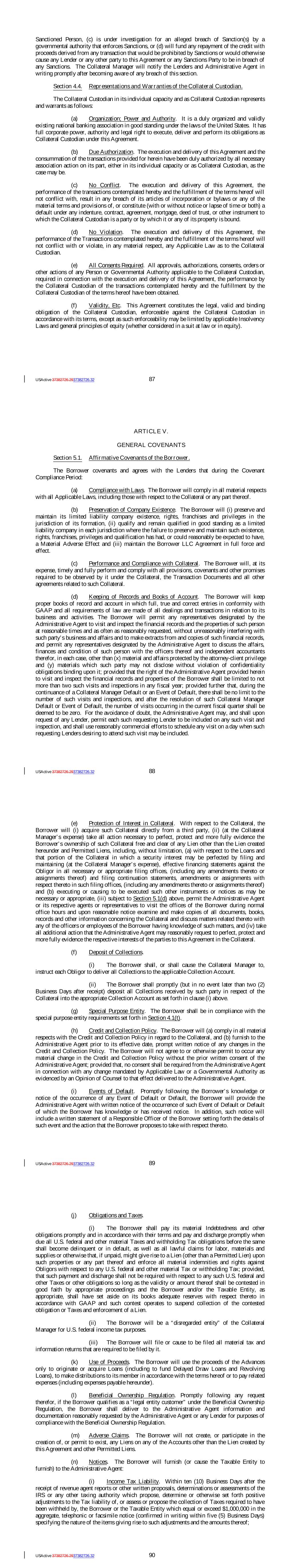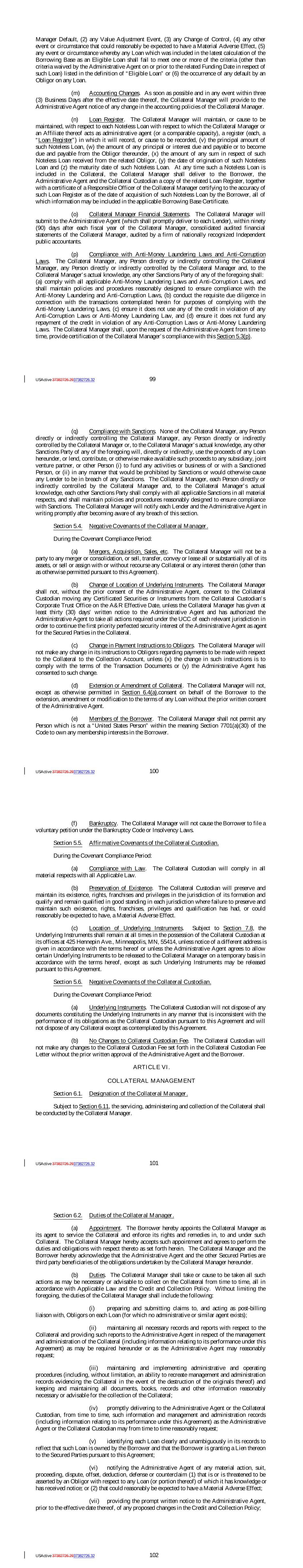 Sanctioned Person, (c) is under investigation for an alleged breach of Sanction(s) by a governmental authority that enforces Sanctions, or (d) will fund any repayment of the credit with proceeds derived from any transaction that would be prohibited by Sanctions or would otherwise cause any Lender or any other party to this Agreement or any Sanctions Party to be in breach of any Sanctions. The Collateral Manager will notify the Lenders and Administrative Agent in writing promptly after becoming aware of any breach of this section. Section 4.4. Representations and Warranties of the Collateral Custodian. The Collateral Custodian in its individual capacity and as Collateral Custodian represents and warrants as follows: (a) Organization; Power and Authority. It is a duly organized and validly existing national banking association in good standing under the laws of the United States. It has full corporate power, authority and legal right to execute, deliver and perform its obligations as Collateral Custodian under this Agreement. (b) Due Authorization. The execution and delivery of this Agreement and the consummation of the transactions provided for herein have been duly authorized by all necessary association action on its part, either in its individual capacity or as Collateral Custodian, as the case may be. (c) No Conflict. The execution and delivery of this Agreement, the performance of the transactions contemplated hereby and the fulfillment of the terms hereof will not conflict with, result in any breach of its articles of incorporation or bylaws or any of the material terms and provisions of, or constitute (with or without notice or lapse of time or both) a default under any indenture, contract, agreement, mortgage, deed of trust, or other instrument to which the Collateral Custodian is a party or by which it or any of its property is bound. (d) No Violation. The execution and delivery of this Agreement, the performance of the Transactions contemplated hereby and the fulfillment of the terms hereof will not conflict with or violate, in any material respect, any Applicable Law as to the Collateral Custodian. (e) All Consents Required. All approvals, authorizations, consents, orders or other actions of any Person or Governmental Authority applicable to the Collateral Custodian, required in connection with the execution and delivery of this Agreement, the performance by the Collateral Custodian of the transactions contemplated hereby and the fulfillment by the Collateral Custodian of the terms hereof have been obtained. (f) Validity, Etc. This Agreement constitutes the legal, valid and binding obligation of the Collateral Custodian, enforceable against the Collateral Custodian in accordance with its terms, except as such enforceability may be limited by applicable Insolvency Laws and general principles of equity (whether considered in a suit at law or in equity). USActive 37382726.2937382726.32 87 ARTICLE V. GENERAL COVENANTS Section 5.1. Affirmative Covenants of the Borrower. The Borrower covenants and agrees with the Lenders that during the Covenant Compliance Period: (a) Compliance with Laws. The Borrower will comply in all material respects with all Applicable Laws, including those with respect to the Collateral or any part thereof. (b) Preservation of Company Existence. The Borrower will (i) preserve and maintain its limited liability company existence, rights, franchises and privileges in the jurisdiction of its formation, (ii) qualify and remain qualified in good standing as a limited liability company in each jurisdiction where the failure to preserve and maintain such existence, rights, franchises, privileges and qualification has had, or could reasonably be expected to have, a Material Adverse Effect and (iii) maintain the Borrower LLC Agreement in full force and effect. (c) Performance and Compliance with Collateral. The Borrower will, at its expense, timely and fully perform and comply with all provisions, covenants and other promises required to be observed by it under the Collateral, the Transaction Documents and all other agreements related to such Collateral. (d) Keeping of Records and Books of Account. The Borrower will keep proper books of record and account in which full, true and correct entries in conformity with GAAP and all requirements of law are made of all dealings and transactions in relation to its business and activities. The Borrower will permit any representatives designated by the Administrative Agent to visit and inspect the financial records and the properties of such person at reasonable times and as often as reasonably requested, without unreasonably interfering with such party’s business and affairs and to make extracts from and copies of such financial records, and permit any representatives designated by the Administrative Agent to discuss the affairs, finances and condition of such person with the officers thereof and independent accountants therefor, in each case, other than (x) material and affairs protected by the attorney-client privilege and (y) materials which such party may not disclose without violation of confidentiality obligations binding upon it; provided that the right of the Administrative Agent provided herein to visit and inspect the financial records and properties of the Borrower shall be limited to not more than two such visits and inspections in any fiscal year; provided further that, during the continuance of a Collateral Manager Default or an Event of Default, there shall be no limit to the number of such visits and inspections, and after the resolution of such Collateral Manager Default or Event of Default, the number of visits occurring in the current fiscal quarter shall be deemed to be zero. For the avoidance of doubt, the Administrative Agent may, and shall upon request of any Lender, permit each such requesting Lender to be included on any such visit and inspection, and shall use reasonably commercial efforts to schedule