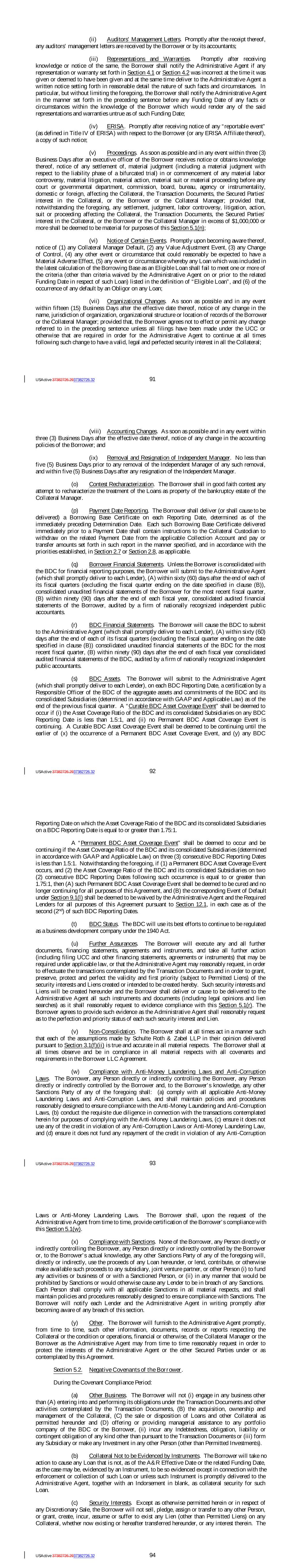 (ii) Auditors’ Management Letters. Promptly after the receipt thereof, any auditors’ management letters are received by the Borrower or by its accountants; (iii) Representations and Warranties. Promptly after receiving knowledge or notice of the same, the Borrower shall notify the Administrative Agent if any representation or warranty set forth in Section 4.1 or Section 4.2 was incorrect at the time it was given or deemed to have been given and at the same time deliver to the Administrative Agent a written notice setting forth in reasonable detail the nature of such facts and circumstances. In particular, but without limiting the foregoing, the Borrower shall notify the Administrative Agent in the manner set forth in the preceding sentence before any Funding Date of any facts or circumstances within the knowledge of the Borrower which would render any of the said representations and warranties untrue as of such Funding Date; (iv) ERISA. Promptly after receiving notice of any “reportable event” (as defined in Title IV of ERISA) with respect to the Borrower (or any ERISA Affiliate thereof), a copy of such notice; (v) Proceedings. As soon as possible and in any event within three (3) Business Days after an executive officer of the Borrower receives notice or obtains knowledge thereof, notice of any settlement of, material judgment (including a material judgment with respect to the liability phase of a bifurcated trial) in or commencement of any material labor controversy, material litigation, material action, material suit or material proceeding before any court or governmental department, commission, board, bureau, agency or instrumentality, domestic or foreign, affecting the Collateral, the Transaction Documents, the Secured Parties’ interest in the Collateral, or the Borrower or the Collateral Manager; provided that, notwithstanding the foregoing, any settlement, judgment, labor controversy, litigation, action, suit or proceeding affecting the Collateral, the Transaction Documents, the Secured Parties’ interest in the Collateral, or the Borrower or the Collateral Manager in excess of $1,000,000 or more shall be deemed to be material for purposes of this Section 5.1(n); (vi) Notice of Certain Events. Promptly upon becoming aware thereof, notice of (1) any Collateral Manager Default, (2) any Value Adjustment Event, (3) any Change of Control, (4) any other event or circumstance that could reasonably be expected to have a Material Adverse Effect, (5) any event or circumstance whereby any Loan which was included in the latest calculation of the Borrowing Base as an Eligible Loan shall fail to meet one or more of the criteria (other than criteria waived by the Administrative Agent on or prior to the related Funding Date in respect of such Loan) listed in the definition of “Eligible Loan”, and (6) of the occurrence of any default by an Obligor on any Loan; (vii) Organizational Changes. As soon as possible and in any event within fifteen (15) Business Days after the effective date thereof, notice of any change in the name, jurisdiction of organization, organizational structure or location of records of the Borrower or the Collateral Manager; provided that, the Borrower agrees not to effect or permit any change referred to in the preceding sentence unless all filings have been made under the UCC or otherwise that are required in order for the Administrative Agent to continue at all times following such change to have a valid, legal and perfected security interest in all the Collateral; USActive 37382726.2937382726.32 91 (viii) Accounting Changes. As soon as possible and in any event within three (3) Business Days after the effective date thereof, notice of any change in the accounting policies of the Borrower; and (ix) Removal and Resignation of Independent Manager. No less than five (5) Business Days prior to any removal of the Independent Manager of any such removal, and within five (5) Business Days after any resignation of the Independent Manager. (o) Contest Recharacterization. The Borrower shall in good faith contest any attempt to recharacterize the treatment of the Loans as property of the bankruptcy estate of the Collateral Manager. (p) Payment Date Reporting. The Borrower shall deliver (or shall cause to be delivered) a Borrowing Base Certificate on each Reporting Date, determined as of the immediately preceding Determination Date. Each such Borrowing Base Certificate delivered immediately prior to a Payment Date shall contain instructions to the Collateral Custodian to withdraw on the related Payment Date from the applicable Collection Account and pay or transfer amounts set forth in such report in the manner specified, and in accordance with the priorities established, in Section 2.7 or Section 2.8, as applicable. (q) Borrower Financial Statements. Unless the Borrower is consolidated with the BDC for financial reporting purposes, the Borrower will submit to the Administrative Agent (which shall promptly deliver to each Lender), (A) within sixty (60) days after the end of each of its fiscal quarters (excluding the fiscal quarter ending on the date specified in clause (B)), consolidated unaudited financial statements of the Borrower for the most recent fiscal quarter, (B) within ninety (90) days after the end of each fiscal year, consolidated audited financial statements of the Borrower, audited by a firm of nationally recognized independent public accountants. (r) BDC Financial Statements. The Borrower will cause the BDC to submit to the Administrative Agent (which shall promptly deliver to each Lender), (A) within sixty (60) days after the end of each of its fiscal quarters (excluding the fiscal quarter ending on the date specified in clause (B)) consolidated unaudited financial statements of the BDC for the most recent fiscal quarter, (B) within ninety (90) days after the end of each fiscal year consolidated audited financial statements of the BDC, audited by a firm o
