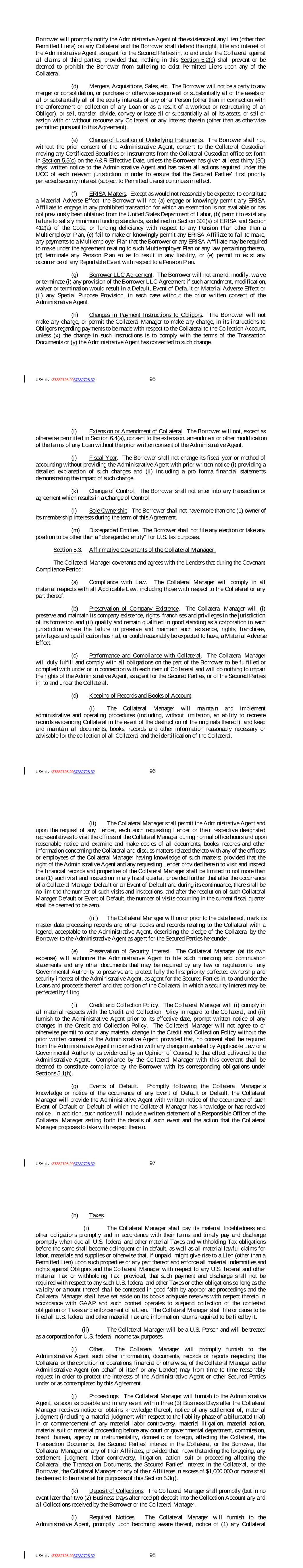 Borrower will promptly notify the Administrative Agent of the existence of any Lien (other than Permitted Liens) on any Collateral and the Borrower shall defend the right, title and interest of the Administrative Agent, as agent for the Secured Parties in, to and under the Collateral against all claims of third parties; provided that, nothing in this Section 5.2(c) shall prevent or be deemed to prohibit the Borrower from suffering to exist Permitted Liens upon any of the Collateral. (d) Mergers, Acquisitions, Sales, etc. The Borrower will not be a party to any merger or consolidation, or purchase or otherwise acquire all or substantially all of the assets or all or substantially all of the equity interests of any other Person (other than in connection with the enforcement or collection of any Loan or as a result of a workout or restructuring of an Obligor), or sell, transfer, divide, convey or lease all or substantially all of its assets, or sell or assign with or without recourse any Collateral or any interest therein (other than as otherwise permitted pursuant to this Agreement). (e) Change of Location of Underlying Instruments. The Borrower shall not, without the prior consent of the Administrative Agent, consent to the Collateral Custodian moving any Certificated Securities or Instruments from the Collateral Custodian office set forth in Section 5.5(c) on the A&R Effective Date, unless the Borrower has given at least thirty (30) days’ written notice to the Administrative Agent and has taken all actions required under the UCC of each relevant jurisdiction in order to ensure that the Secured Parties’ first priority perfected security interest (subject to Permitted Liens) continues in effect. (f) ERISA Matters. Except as would not reasonably be expected to constitute a Material Adverse Effect, the Borrower will not (a) engage or knowingly permit any ERISA Affiliate to engage in any prohibited transaction for which an exemption is not available or has not previously been obtained from the United States Department of Labor, (b) permit to exist any failure to satisfy minimum funding standards, as defined in Section 302(a) of ERISA and Section 412(a) of the Code, or funding deficiency with respect to any Pension Plan other than a Multiemployer Plan, (c) fail to make or knowingly permit any ERISA Affiliate to fail to make, any payments to a Multiemployer Plan that the Borrower or any ERISA Affiliate may be required to make under the agreement relating to such Multiemployer Plan or any law pertaining thereto, (d) terminate any Pension Plan so as to result in any liability, or (e) permit to exist any occurrence of any Reportable Event with respect to a Pension Plan. (g) Borrower LLC Agreement. The Borrower will not amend, modify, waive or terminate (i) any provision of the Borrower LLC Agreement if such amendment, modification, waiver or termination would result in a Default, Event of Default or Material Adverse Effect or (ii) any Special Purpose Provision, in each case without the prior written consent of the Administrative Agent. (h) Changes in Payment Instructions to Obligors. The Borrower will not make any change, or permit the Collateral Manager to make any change, in its instructions to Obligors regarding payments to be made with respect to the Collateral to the Collection Account, unless (x) the change in such instructions is to comply with the terms of the Transaction Documents or (y) the Administrative Agent has consented to such change. USActive 37382726.2937382726.32 95 (i) Extension or Amendment of Collateral. The Borrower will not, except as otherwise permitted in Section 6.4(a), consent to the extension, amendment or other modification of the terms of any Loan without the prior written consent of the Administrative Agent. (j) Fiscal Year. The Borrower shall not change its fiscal year or method of accounting without providing the Administrative Agent with prior written notice (i) providing a detailed explanation of such changes and (ii) including a pro forma financial statements demonstrating the impact of such change. (k) Change of Control. The Borrower shall not enter into any transaction or agreement which results in a Change of Control. (l) Sole Ownership. The Borrower shall not have more than one (1) owner of its membership interests during the term of this Agreement. (m) Disregarded Entities. The Borrower shall not file any election or take any position to be other than a “disregarded entity” for U.S. tax purposes. Section 5.3. Affirmative Covenants of the Collateral Manager. The Collateral Manager covenants and agrees with the Lenders that during the Covenant Compliance Period: (a) Compliance with Law. The Collateral Manager will comply in all material respects with all Applicable Law, including those with respect to the Collateral or any part thereof. (b) Preservation of Company Existence. The Collateral Manager will (i) preserve and maintain its company existence, rights, franchises and privileges in the jurisdiction of its formation and (ii) qualify and remain qualified in good standing as a corporation in each jurisdiction where the failure to preserve and maintain such existence, rights, franchises, privileges and qualification has had, or could reasonably be expected to have, a Material Adverse Effect. (c) Performance and Compliance with Collateral. The Collateral Manager will duly fulfill and comply with all obligations on the part of the Borrower to be fulfilled or complied with under or in connection with each item of Collateral and will do nothing to impair the rights of the Administrative Agent, as agent for the Secured Parties, or of the Secured Parties in, to and under the Collateral. (d) Keeping of Records and Books of Account. (i) The Collateral Manager will maintain and implement administrative and operating procedures (including, without limitation, an ability to recreate records evidencing Collateral in the event of the destruction of the originals