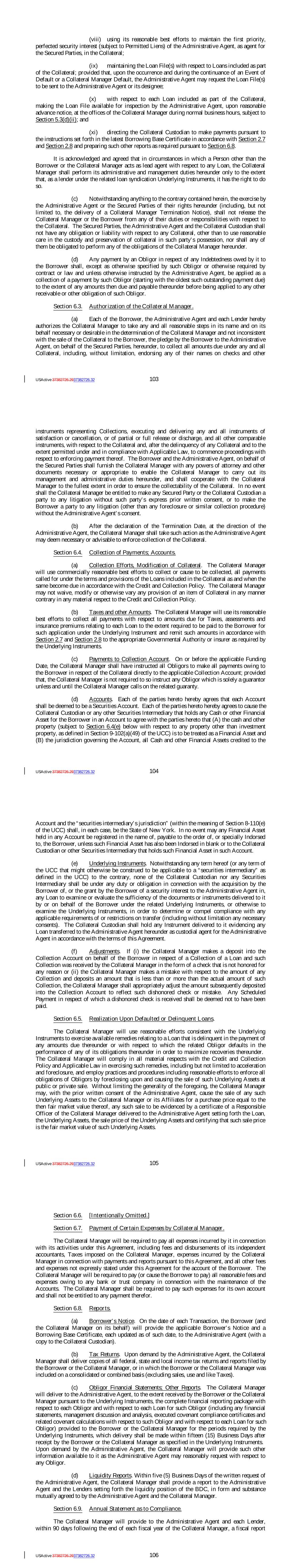 (viii) using its reasonable best efforts to maintain the first priority, perfected security interest (subject to Permitted Liens) of the Administrative Agent, as agent for the Secured Parties, in the Collateral; (ix) maintaining the Loan File(s) with respect to Loans included as part of the Collateral; provided that, upon the occurrence and during the continuance of an Event of Default or a Collateral Manager Default, the Administrative Agent may request the Loan File(s) to be sent to the Administrative Agent or its designee; (x) with respect to each Loan included as part of the Collateral, making the Loan File available for inspection by the Administrative Agent, upon reasonable advance notice, at the offices of the Collateral Manager during normal business hours, subject to Section 5.3(d)(ii); and (xi) directing the Collateral Custodian to make payments pursuant to the instructions set forth in the latest Borrowing Base Certificate in accordance with Section 2.7 and Section 2.8 and preparing such other reports as required pursuant to Section 6.8. It is acknowledged and agreed that in circumstances in which a Person other than the Borrower or the Collateral Manager acts as lead agent with respect to any Loan, the Collateral Manager shall perform its administrative and management duties hereunder only to the extent that, as a lender under the related loan syndication Underlying Instruments, it has the right to do so. (c) Notwithstanding anything to the contrary contained herein, the exercise by the Administrative Agent or the Secured Parties of their rights hereunder (including, but not limited to, the delivery of a Collateral Manager Termination Notice), shall not release the Collateral Manager or the Borrower from any of their duties or responsibilities with respect to the Collateral. The Secured Parties, the Administrative Agent and the Collateral Custodian shall not have any obligation or liability with respect to any Collateral, other than to use reasonable care in the custody and preservation of collateral in such party’s possession, nor shall any of them be obligated to perform any of the obligations of the Collateral Manager hereunder. (d) Any payment by an Obligor in respect of any Indebtedness owed by it to the Borrower shall, except as otherwise specified by such Obligor or otherwise required by contract or law and unless otherwise instructed by the Administrative Agent, be applied as a collection of a payment by such Obligor (starting with the oldest such outstanding payment due) to the extent of any amounts then due and payable thereunder before being applied to any other receivable or other obligation of such Obligor. Section 6.3. Authorization of the Collateral Manager. (a) Each of the Borrower, the Administrative Agent and each Lender hereby authorizes the Collateral Manager to take any and all reasonable steps in its name and on its behalf necessary or desirable in the determination of the Collateral Manager and not inconsistent with the sale of the Collateral to the Borrower, the pledge by the Borrower to the Administrative Agent, on behalf of the Secured Parties, hereunder, to collect all amounts due under any and all Collateral, including, without limitation, endorsing any of their names on checks and other USActive 37382726.2937382726.32 103 instruments representing Collections, executing and delivering any and all instruments of satisfaction or cancellation, or of partial or full release or discharge, and all other comparable instruments, with respect to the Collateral and, after the delinquency of any Collateral and to the extent permitted under and in compliance with Applicable Law, to commence proceedings with respect to enforcing payment thereof. The Borrower and the Administrative Agent, on behalf of the Secured Parties shall furnish the Collateral Manager with any powers of attorney and other documents necessary or appropriate to enable the Collateral Manager to carry out its management and administrative duties hereunder, and shall cooperate with the Collateral Manager to the fullest extent in order to ensure the collectability of the Collateral. In no event shall the Collateral Manager be entitled to make any Secured Party or the Collateral Custodian a party to any litigation without such party’s express prior written consent, or to make the Borrower a party to any litigation (other than any foreclosure or similar collection procedure) without the Administrative Agent’s consent. (b) After the declaration of the Termination Date, at the direction of the Administrative Agent, the Collateral Manager shall take such action as the Administrative Agent may deem necessary or advisable to enforce collection of the Collateral. Section 6.4. Collection of Payments; Accounts. (a) Collection Efforts, Modification of Collateral. The Collateral Manager will use commercially reasonable best efforts to collect or cause to be collected, all payments called for under the terms and provisions of the Loans included in the Collateral as and when the same become due in accordance with the Credit and Collection Policy. The Collateral Manager may not waive, modify or otherwise vary any provision of an item of Collateral in any manner contrary in any material respect to the Credit and Collection Policy. (b) Taxes and other Amounts. The Collateral Manager will use its reasonable best efforts to collect all payments with respect to amounts due for Taxes, assessments and insurance premiums relating to each Loan to the extent required to be paid to the Borrower for such application under the Underlying Instrument and remit such amounts in accordance with Section 2.7 and Section 2.8 to the appropriate Governmental Authority or insurer as required by the Underlying Instruments. (c) Payments to Collection Account. On or before the applicable Funding Date, the Collateral Manager shall have instructed all Obligors to make all payments owing to the Borrower in respect of the Collateral d
