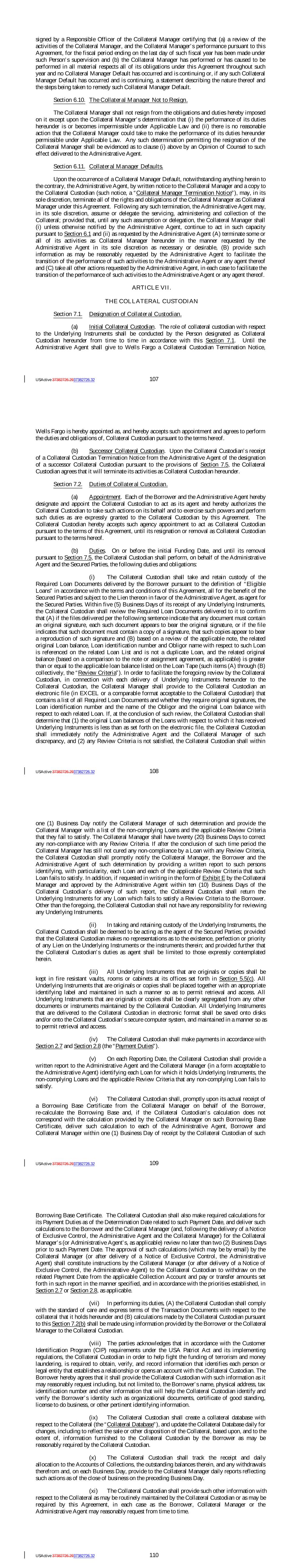 signed by a Responsible Officer of the Collateral Manager certifying that (a) a review of the activities of the Collateral Manager, and the Collateral Manager’s performance pursuant to this Agreement, for the fiscal period ending on the last day of such fiscal year has been made under such Person’s supervision and (b) the Collateral Manager has performed or has caused to be performed in all material respects all of its obligations under this Agreement throughout such year and no Collateral Manager Default has occurred and is continuing or, if any such Collateral Manager Default has occurred and is continuing, a statement describing the nature thereof and the steps being taken to remedy such Collateral Manager Default. Section 6.10. The Collateral Manager Not to Resign. The Collateral Manager shall not resign from the obligations and duties hereby imposed on it except upon the Collateral Manager’s determination that (i) the performance of its duties hereunder is or becomes impermissible under Applicable Law and (ii) there is no reasonable action that the Collateral Manager could take to make the performance of its duties hereunder permissible under Applicable Law. Any such determination permitting the resignation of the Collateral Manager shall be evidenced as to clause (i) above by an Opinion of Counsel to such effect delivered to the Administrative Agent. Section 6.11. Collateral Manager Defaults. Upon the occurrence of a Collateral Manager Default, notwithstanding anything herein to the contrary, the Administrative Agent, by written notice to the Collateral Manager and a copy to the Collateral Custodian (such notice, a “Collateral Manager Termination Notice”), may, in its sole discretion, terminate all of the rights and obligations of the Collateral Manager as Collateral Manager under this Agreement. Following any such termination, the Administrative Agent may, in its sole discretion, assume or delegate the servicing, administering and collection of the Collateral; provided that, until any such assumption or delegation, the Collateral Manager shall (i) unless otherwise notified by the Administrative Agent, continue to act in such capacity pursuant to Section 6.1 and (ii) as requested by the Administrative Agent (A) terminate some or all of its activities as Collateral Manager hereunder in the manner requested by the Administrative Agent in its sole discretion as necessary or desirable, (B) provide such information as may be reasonably requested by the Administrative Agent to facilitate the transition of the performance of such activities to the Administrative Agent or any agent thereof and (C) take all other actions requested by the Administrative Agent, in each case to facilitate the transition of the performance of such activities to the Administrative Agent or any agent thereof. ARTICLE VII. THE COLLATERAL CUSTODIAN Section 7.1. Designation of Collateral Custodian. (a) Initial Collateral Custodian. The role of collateral custodian with respect to the Underlying Instruments shall be conducted by the Person designated as Collateral Custodian hereunder from time to time in accordance with this Section 7.1. Until the Administrative Agent shall give to Wells Fargo a Collateral Custodian Termination Notice, USActive 37382726.2937382726.32 107 Wells Fargo is hereby appointed as, and hereby accepts such appointment and agrees to perform the duties and obligations of, Collateral Custodian pursuant to the terms hereof. (b) Successor Collateral Custodian. Upon the Collateral Custodian’s receipt of a Collateral Custodian Termination Notice from the Administrative Agent of the designation of a successor Collateral Custodian pursuant to the provisions of Section 7.5, the Collateral Custodian agrees that it will terminate its activities as Collateral Custodian hereunder. Section 7.2. Duties of Collateral Custodian. (a) Appointment. Each of the Borrower and the Administrative Agent hereby designate and appoint the Collateral Custodian to act as its agent and hereby authorizes the Collateral Custodian to take such actions on its behalf and to exercise such powers and perform such duties as are expressly granted to the Collateral Custodian by this Agreement. The Collateral Custodian hereby accepts such agency appointment to act as Collateral Custodian pursuant to the terms of this Agreement, until its resignation or removal as Collateral Custodian pursuant to the terms hereof. (b) Duties. On or before the initial Funding Date, and until its removal pursuant to Section 7.5, the Collateral Custodian shall perform, on behalf of the Administrative Agent and the Secured Parties, the following duties and obligations: (i) The Collateral Custodian shall take and retain custody of the Required Loan Documents delivered by the Borrower pursuant to the definition of “Eligible Loans” in accordance with the terms and conditions of this Agreement, all for the benefit of the Secured Parties and subject to the Lien thereon in favor of the Administrative Agent, as agent for the Secured Parties. Within five (5) Business Days of its receipt of any Underlying Instruments, the Collateral Custodian shall review the Required Loan Documents delivered to it to confirm that (A) if the files delivered per the following sentence indicate that any document must contain an original signature, each such document appears to bear the original signature, or if the file indicates that such document must contain a copy of a signature, that such copies appear to bear a reproduction of such signature and (B) based on a review of the applicable note, the related original Loan balance, Loan identification number and Obligor name with respect to such Loan is referenced on the related Loan List and is not a duplicate Loan, and the related original balance (based on a comparison to the note or assignment agreement, as applicable) is greater than or equal to the applicable loan balance listed on the Loan Tape (such items (A) thr