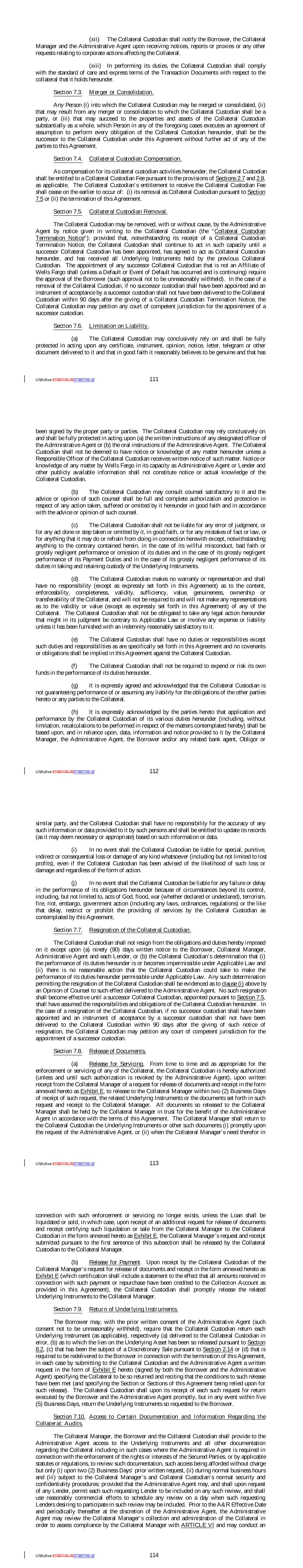 (xii) The Collateral Custodian shall notify the Borrower, the Collateral Manager and the Administrative Agent upon receiving notices, reports or proxies or any other requests relating to corporate actions affecting the Collateral. (xiii) In performing its duties, the Collateral Custodian shall comply with the standard of care and express terms of the Transaction Documents with respect to the collateral that it holds hereunder. Section 7.3. Merger or Consolidation. Any Person (i) into which the Collateral Custodian may be merged or consolidated, (ii) that may result from any merger or consolidation to which the Collateral Custodian shall be a party, or (iii) that may succeed to the properties and assets of the Collateral Custodian substantially as a whole, which Person in any of the foregoing cases executes an agreement of assumption to perform every obligation of the Collateral Custodian hereunder, shall be the successor to the Collateral Custodian under this Agreement without further act of any of the parties to this Agreement. Section 7.4. Collateral Custodian Compensation. As compensation for its collateral custodian activities hereunder, the Collateral Custodian shall be entitled to a Collateral Custodian Fee pursuant to the provisions of Sections 2.7 and 2.8, as applicable. The Collateral Custodian’s entitlement to receive the Collateral Custodian Fee shall cease on the earlier to occur of: (i) its removal as Collateral Custodian pursuant to Section 7.5 or (ii) the termination of this Agreement. Section 7.5. Collateral Custodian Removal. The Collateral Custodian may be removed, with or without cause, by the Administrative Agent by notice given in writing to the Collateral Custodian (the “Collateral Custodian Termination Notice”); provided that, notwithstanding its receipt of a Collateral Custodian Termination Notice, the Collateral Custodian shall continue to act in such capacity until a successor Collateral Custodian has been appointed, has agreed to act as Collateral Custodian hereunder, and has received all Underlying Instruments held by the previous Collateral Custodian. The appointment of any successor Collateral Custodian that is not an Affiliate of Wells Fargo shall (unless a Default or Event of Default has occurred and is continuing) require the approval of the Borrower (such approval not to be unreasonably withheld). In the case of a removal of the Collateral Custodian, if no successor custodian shall have been appointed and an instrument of acceptance by a successor custodian shall not have been delivered to the Collateral Custodian within 90 days after the giving of a Collateral Custodian Termination Notice, the Collateral Custodian may petition any court of competent jurisdiction for the appointment of a successor custodian. Section 7.6. Limitation on Liability. (a) The Collateral Custodian may conclusively rely on and shall be fully protected in acting upon any certificate, instrument, opinion, notice, letter, telegram or other document delivered to it and that in good faith it reasonably believes to be genuine and that has USActive 37382726.2937382726.32 111 been signed by the proper party or parties. The Collateral Custodian may rely conclusively on and shall be fully protected in acting upon (a) the written instructions of any designated officer of the Administrative Agent or (b) the oral instructions of the Administrative Agent. The Collateral Custodian shall not be deemed to have notice or knowledge of any matter hereunder unless a Responsible Officer of the Collateral Custodian receives written notice of such matter. Notice or knowledge of any matter by Wells Fargo in its capacity as Administrative Agent or Lender and other publicly available information shall not constitute notice or actual knowledge of the Collateral Custodian. (b) The Collateral Custodian may consult counsel satisfactory to it and the advice or opinion of such counsel shall be full and complete authorization and protection in respect of any action taken, suffered or omitted by it hereunder in good faith and in accordance with the advice or opinion of such counsel. (c) The Collateral Custodian shall not be liable for any error of judgment, or for any act done or step taken or omitted by it, in good faith, or for any mistakes of fact or law, or for anything that it may do or refrain from doing in connection herewith except, notwithstanding anything to the contrary contained herein, in the case of its willful misconduct, bad faith or grossly negligent performance or omission of its duties and in the case of its grossly negligent performance of its Payment Duties and in the case of its grossly negligent performance of its duties in taking and retaining custody of the Underlying Instruments. (d) The Collateral Custodian makes no warranty or representation and shall have no responsibility (except as expressly set forth in this Agreement) as to the content, enforceability, completeness, validity, sufficiency, value, genuineness, ownership or transferability of the Collateral, and will not be required to and will not make any representations as to the validity or value (except as expressly set forth in this Agreement) of any of the Collateral. The Collateral Custodian shall not be obligated to take any legal action hereunder that might in its judgment be contrary to Applicable Law or involve any expense or liability unless it has been furnished with an indemnity reasonably satisfactory to it. (e) The Collateral Custodian shall have no duties or responsibilities except such duties and responsibilities as are specifically set forth in this Agreement and no covenants or obligations shall be implied in this Agreement against the Collateral Custodian. (f) The Collateral Custodian shall not be required to expend or risk its own funds in the performance of its duties hereunder. (g) It is expressly agreed and acknowledged that the Collateral Custodian is not guaranteeing performance of or assuming any li