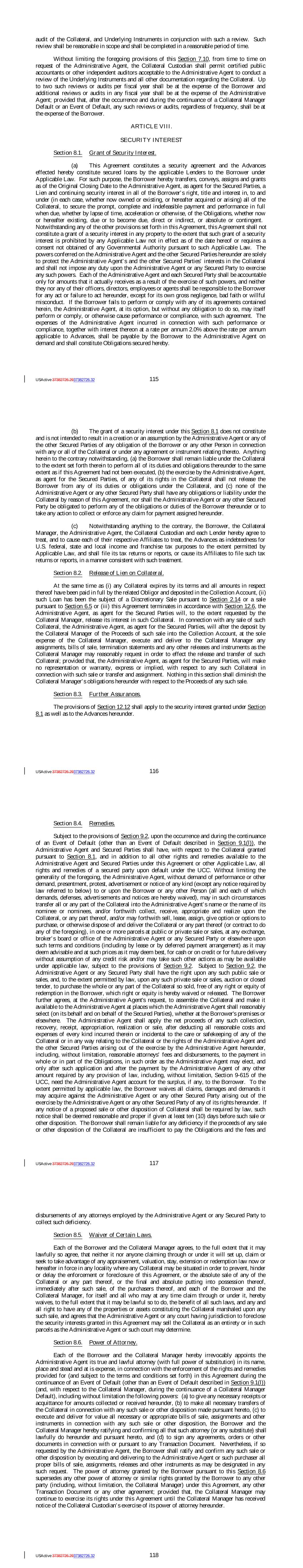 audit of the Collateral, and Underlying Instruments in conjunction with such a review. Such review shall be reasonable in scope and shall be completed in a reasonable period of time. Without limiting the foregoing provisions of this Section 7.10, from time to time on request of the Administrative Agent, the Collateral Custodian shall permit certified public accountants or other independent auditors acceptable to the Administrative Agent to conduct a review of the Underlying Instruments and all other documentation regarding the Collateral. Up to two such reviews or audits per fiscal year shall be at the expense of the Borrower and additional reviews or audits in any fiscal year shall be at the expense of the Administrative Agent; provided that, after the occurrence and during the continuance of a Collateral Manager Default or an Event of Default, any such reviews or audits, regardless of frequency, shall be at the expense of the Borrower. ARTICLE VIII. SECURITY INTEREST Section 8.1. Grant of Security Interest. (a) This Agreement constitutes a security agreement and the Advances effected hereby constitute secured loans by the applicable Lenders to the Borrower under Applicable Law. For such purpose, the Borrower hereby transfers, conveys, assigns and grants as of the Original Closing Date to the Administrative Agent, as agent for the Secured Parties, a Lien and continuing security interest in all of the Borrower’s right, title and interest in, to and under (in each case, whether now owned or existing, or hereafter acquired or arising) all of the Collateral, to secure the prompt, complete and indefeasible payment and performance in full when due, whether by lapse of time, acceleration or otherwise, of the Obligations, whether now or hereafter existing, due or to become due, direct or indirect, or absolute or contingent. Notwithstanding any of the other provisions set forth in this Agreement, this Agreement shall not constitute a grant of a security interest in any property to the extent that such grant of a security interest is prohibited by any Applicable Law not in effect as of the date hereof or requires a consent not obtained of any Governmental Authority pursuant to such Applicable Law. The powers conferred on the Administrative Agent and the other Secured Parties hereunder are solely to protect the Administrative Agent’s and the other Secured Parties’ interests in the Collateral and shall not impose any duty upon the Administrative Agent or any Secured Party to exercise any such powers. Each of the Administrative Agent and each Secured Party shall be accountable only for amounts that it actually receives as a result of the exercise of such powers, and neither they nor any of their officers, directors, employees or agents shall be responsible to the Borrower for any act or failure to act hereunder, except for its own gross negligence, bad faith or willful misconduct. If the Borrower fails to perform or comply with any of its agreements contained herein, the Administrative Agent, at its option, but without any obligation to do so, may itself perform or comply, or otherwise cause performance or compliance, with such agreement. The expenses of the Administrative Agent incurred in connection with such performance or compliance, together with interest thereon at a rate per annum 2.0% above the rate per annum applicable to Advances, shall be payable by the Borrower to the Administrative Agent on demand and shall constitute Obligations secured hereby. USActive 37382726.2937382726.32 115 (b) The grant of a security interest under this Section 8.1 does not constitute and is not intended to result in a creation or an assumption by the Administrative Agent or any of the other Secured Parties of any obligation of the Borrower or any other Person in connection with any or all of the Collateral or under any agreement or instrument relating thereto. Anything herein to the contrary notwithstanding, (a) the Borrower shall remain liable under the Collateral to the extent set forth therein to perform all of its duties and obligations thereunder to the same extent as if this Agreement had not been executed, (b) the exercise by the Administrative Agent, as agent for the Secured Parties, of any of its rights in the Collateral shall not release the Borrower from any of its duties or obligations under the Collateral, and (c) none of the Administrative Agent or any other Secured Party shall have any obligations or liability under the Collateral by reason of this Agreement, nor shall the Administrative Agent or any other Secured Party be obligated to perform any of the obligations or duties of the Borrower thereunder or to take any action to collect or enforce any claim for payment assigned hereunder. (c) Notwithstanding anything to the contrary, the Borrower, the Collateral Manager, the Administrative Agent, the Collateral Custodian and each Lender hereby agree to treat, and to cause each of their respective Affiliates to treat, the Advances as indebtedness for U.S. federal, state and local income and franchise tax purposes to the extent permitted by Applicable Law, and shall file its tax returns or reports, or cause its Affiliates to file such tax returns or reports, in a manner consistent with such treatment. Section 8.2. Release of Lien on Collateral. At the same time as (i) any Collateral expires by its terms and all amounts in respect thereof have been paid in full by the related Obligor and deposited in the Collection Account, (ii) such Loan has been the subject of a Discretionary Sale pursuant to Section 2.14 or a sale pursuant to Section 6.5 or (iii) this Agreement terminates in accordance with Section 12.6, the Administrative Agent, as agent for the Secured Parties will, to the extent requested by the Collateral Manager, release its interest in such Collateral. In connection with any sale of such Collateral, the Administrative Agent, as agent for the Secured Parties, will after the deposit by th