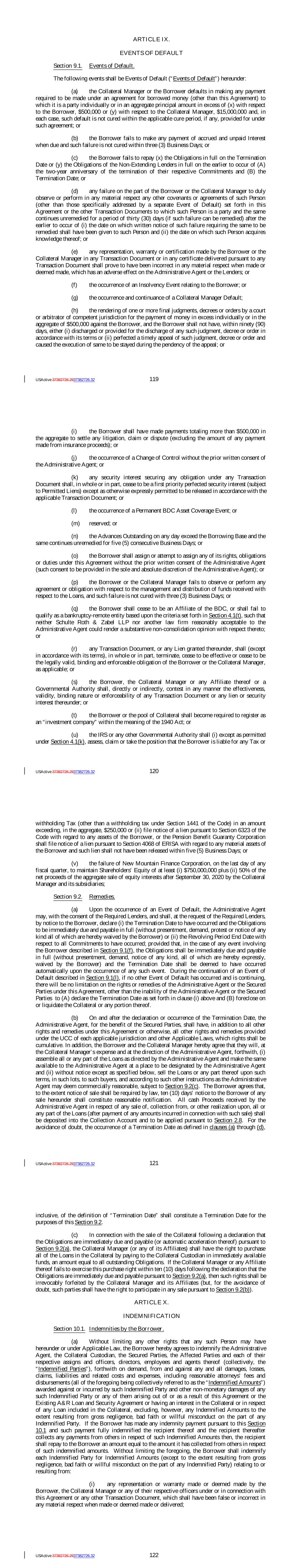 ARTICLE IX. EVENTS OF DEFAULT Section 9.1. Events of Default. The following events shall be Events of Default (“Events of Default”) hereunder: (a) the Collateral Manager or the Borrower defaults in making any payment required to be made under an agreement for borrowed money (other than this Agreement) to which it is a party individually or in an aggregate principal amount in excess of (x) with respect to the Borrower, $500,000 or (y) with respect to the Collateral Manager, $15,000,000 and, in each case, such default is not cured within the applicable cure period, if any, provided for under such agreement; or (b) the Borrower fails to make any payment of accrued and unpaid Interest when due and such failure is not cured within three (3) Business Days; or (c) the Borrower fails to repay (x) the Obligations in full on the Termination Date or (y) the Obligations of the Non-Extending Lenders in full on the earlier to occur of (A) the two-year anniversary of the termination of their respective Commitments and (B) the Termination Date; or (d) any failure on the part of the Borrower or the Collateral Manager to duly observe or perform in any material respect any other covenants or agreements of such Person (other than those specifically addressed by a separate Event of Default) set forth in this Agreement or the other Transaction Documents to which such Person is a party and the same continues unremedied for a period of thirty (30) days (if such failure can be remedied) after the earlier to occur of (i) the date on which written notice of such failure requiring the same to be remedied shall have been given to such Person and (ii) the date on which such Person acquires knowledge thereof; or (e) any representation, warranty or certification made by the Borrower or the Collateral Manager in any Transaction Document or in any certificate delivered pursuant to any Transaction Document shall prove to have been incorrect in any material respect when made or deemed made, which has an adverse effect on the Administrative Agent or the Lenders; or (f) the occurrence of an Insolvency Event relating to the Borrower; or (g) the occurrence and continuance of a Collateral Manager Default; (h) the rendering of one or more final judgments, decrees or orders by a court or arbitrator of competent jurisdiction for the payment of money in excess individually or in the aggregate of $500,000 against the Borrower, and the Borrower shall not have, within ninety (90) days, either (i) discharged or provided for the discharge of any such judgment, decree or order in accordance with its terms or (ii) perfected a timely appeal of such judgment, decree or order and caused the execution of same to be stayed during the pendency of the appeal; or USActive 37382726.2937382726.32 119 (i) the Borrower shall have made payments totaling more than $500,000 in the aggregate to settle any litigation, claim or dispute (excluding the amount of any payment made from insurance proceeds); or (j) the occurrence of a Change of Control without the prior written consent of the Administrative Agent; or (k) any security interest securing any obligation under any Transaction Document shall, in whole or in part, cease to be a first priority perfected security interest (subject to Permitted Liens) except as otherwise expressly permitted to be released in accordance with the applicable Transaction Document; or (l) the occurrence of a Permanent BDC Asset Coverage Event; or (m) reserved; or (n) the Advances Outstanding on any day exceed the Borrowing Base and the same continues unremedied for five (5) consecutive Business Days; or (o) the Borrower shall assign or attempt to assign any of its rights, obligations or duties under this Agreement without the prior written consent of the Administrative Agent (such consent to be provided in the sole and absolute discretion of the Administrative Agent); or (p) the Borrower or the Collateral Manager fails to observe or perform any agreement or obligation with respect to the management and distribution of funds received with respect to the Loans, and such failure is not cured with three (3) Business Days; or (q) the Borrower shall cease to be an Affiliate of the BDC, or shall fail to qualify as a bankruptcy-remote entity based upon the criteria set forth in Section 4.1(t), such that neither Schulte Roth & Zabel LLP nor another law firm reasonably acceptable to the Administrative Agent could render a substantive non-consolidation opinion with respect thereto; or (r) any Transaction Document, or any Lien granted thereunder, shall (except in accordance with its terms), in whole or in part, terminate, cease to be effective or cease to be the legally valid, binding and enforceable obligation of the Borrower or the Collateral Manager, as applicable; or (s) the Borrower, the Collateral Manager or any Affiliate thereof or a Governmental Authority shall, directly or indirectly, contest in any manner the effectiveness, validity, binding nature or enforceability of any Transaction Document or any lien or security interest thereunder; or (t) the Borrower or the pool of Collateral shall become required to register as an “investment company” within the meaning of the 1940 Act; or (u) the IRS or any other Governmental Authority shall (i) except as permitted under Section 4.1(k), assess, claim or take the position that the Borrower is liable for any Tax or USActive 37382726.2937382726.32 120 withholding Tax (other than a withholding tax under Section 1441 of the Code) in an amount exceeding, in the aggregate, $250,000 or (ii) file notice of a lien pursuant to Section 6323 of the Code with regard to any assets of the Borrower, or the Pension Benefit Guaranty Corporation shall file notice of a lien pursuant to Section 4068 of ERISA with regard to any material assets of the Borrower and such lien shall not have been released within five (5) Business Days; or (v) the failure of New Mountain Finance Corporation, on the last da