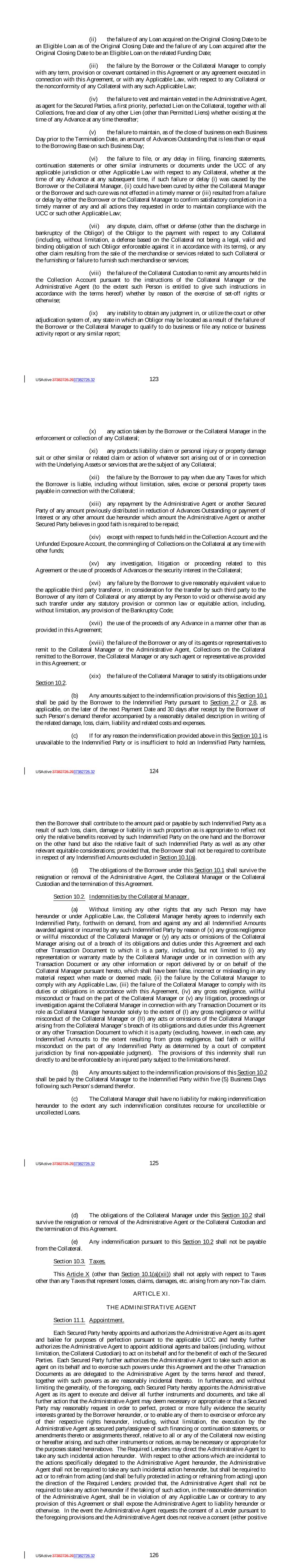 (ii) the failure of any Loan acquired on the Original Closing Date to be an Eligible Loan as of the Original Closing Date and the failure of any Loan acquired after the Original Closing Date to be an Eligible Loan on the related Funding Date; (iii) the failure by the Borrower or the Collateral Manager to comply with any term, provision or covenant contained in this Agreement or any agreement executed in connection with this Agreement, or with any Applicable Law, with respect to any Collateral or the nonconformity of any Collateral with any such Applicable Law; (iv) the failure to vest and maintain vested in the Administrative Agent, as agent for the Secured Parties, a first priority, perfected Lien on the Collateral, together with all Collections, free and clear of any other Lien (other than Permitted Liens) whether existing at the time of any Advance at any time thereafter; (v) the failure to maintain, as of the close of business on each Business Day prior to the Termination Date, an amount of Advances Outstanding that is less than or equal to the Borrowing Base on such Business Day; (vi) the failure to file, or any delay in filing, financing statements, continuation statements or other similar instruments or documents under the UCC of any applicable jurisdiction or other Applicable Law with respect to any Collateral, whether at the time of any Advance at any subsequent time, if such failure or delay (i) was caused by the Borrower or the Collateral Manager, (ii) could have been cured by either the Collateral Manager or the Borrower and such cure was not effected in a timely manner or (iii) resulted from a failure or delay by either the Borrower or the Collateral Manager to confirm satisfactory completion in a timely manner of any and all actions they requested in order to maintain compliance with the UCC or such other Applicable Law; (vii) any dispute, claim, offset or defense (other than the discharge in bankruptcy of the Obligor) of the Obligor to the payment with respect to any Collateral (including, without limitation, a defense based on the Collateral not being a legal, valid and binding obligation of such Obligor enforceable against it in accordance with its terms), or any other claim resulting from the sale of the merchandise or services related to such Collateral or the furnishing or failure to furnish such merchandise or services; (viii) the failure of the Collateral Custodian to remit any amounts held in the Collection Account pursuant to the instructions of the Collateral Manager or the Administrative Agent (to the extent such Person is entitled to give such instructions in accordance with the terms hereof) whether by reason of the exercise of set-off rights or otherwise; (ix) any inability to obtain any judgment in, or utilize the court or other adjudication system of, any state in which an Obligor may be located as a result of the failure of the Borrower or the Collateral Manager to qualify to do business or file any notice or business activity report or any similar report; USActive 37382726.2937382726.32 123 (x) any action taken by the Borrower or the Collateral Manager in the enforcement or collection of any Collateral; (xi) any products liability claim or personal injury or property damage suit or other similar or related claim or action of whatever sort arising out of or in connection with the Underlying Assets or services that are the subject of any Collateral; (xii) the failure by the Borrower to pay when due any Taxes for which the Borrower is liable, including without limitation, sales, excise or personal property taxes payable in connection with the Collateral; (xiii) any repayment by the Administrative Agent or another Secured Party of any amount previously distributed in reduction of Advances Outstanding or payment of Interest or any other amount due hereunder which amount the Administrative Agent or another Secured Party believes in good faith is required to be repaid; (xiv) except with respect to funds held in the Collection Account and the Unfunded Exposure Account, the commingling of Collections on the Collateral at any time with other funds; (xv) any investigation, litigation or proceeding related to this Agreement or the use of proceeds of Advances or the security interest in the Collateral; (xvi) any failure by the Borrower to give reasonably equivalent value to the applicable third party transferor, in consideration for the transfer by such third party to the Borrower of any item of Collateral or any attempt by any Person to void or otherwise avoid any such transfer under any statutory provision or common law or equitable action, including, without limitation, any provision of the Bankruptcy Code; (xvii) the use of the proceeds of any Advance in a manner other than as provided in this Agreement; (xviii) the failure of the Borrower or any of its agents or representatives to remit to the Collateral Manager or the Administrative Agent, Collections on the Collateral remitted to the Borrower, the Collateral Manager or any such agent or representative as provided in this Agreement; or (xix) the failure of the Collateral Manager to satisfy its obligations under Section 10.2. (b) Any amounts subject to the indemnification provisions of this Section 10.1 shall be paid by the Borrower to the Indemnified Party pursuant to Section 2.7 or 2.8, as applicable, on the later of the next Payment Date and 30 days after receipt by the Borrower of such Person’s demand therefor accompanied by a reasonably detailed description in writing of the related damage, loss, claim, liability and related costs and expenses. (c) If for any reason the indemnification provided above in this Section 10.1 is unavailable to the Indemnified Party or is insufficient to hold an Indemnified Party harmless, USActive 37382726.2937382726.32 124 then the Borrower shall contribute to the amount paid or payable by such Indemnified Party as a result of such loss, claim, damage or liability in such prop