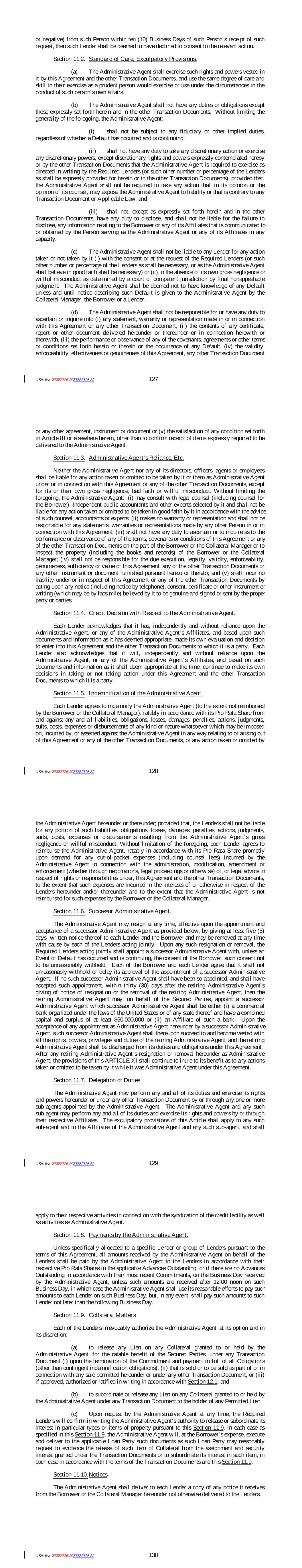 or negative) from such Person within ten (10) Business Days of such Person’s receipt of such request, then such Lender shall be deemed to have declined to consent to the relevant action. Section 11.2. Standard of Care; Exculpatory Provisions. (a) The Administrative Agent shall exercise such rights and powers vested in it by this Agreement and the other Transaction Documents, and use the same degree of care and skill in their exercise as a prudent person would exercise or use under the circumstances in the conduct of such person’s own affairs. (b) The Administrative Agent shall not have any duties or obligations except those expressly set forth herein and in the other Transaction Documents. Without limiting the generality of the foregoing, the Administrative Agent: (i) shall not be subject to any fiduciary or other implied duties, regardless of whether a Default has occurred and is continuing; (ii) shall not have any duty to take any discretionary action or exercise any discretionary powers, except discretionary rights and powers expressly contemplated hereby or by the other Transaction Documents that the Administrative Agent is required to exercise as directed in writing by the Required Lenders (or such other number or percentage of the Lenders as shall be expressly provided for herein or in the other Transaction Documents), provided that, the Administrative Agent shall not be required to take any action that, in its opinion or the opinion of its counsel, may expose the Administrative Agent to liability or that is contrary to any Transaction Document or Applicable Law; and (iii) shall not, except as expressly set forth herein and in the other Transaction Documents, have any duty to disclose, and shall not be liable for the failure to disclose, any information relating to the Borrower or any of its Affiliates that is communicated to or obtained by the Person serving as the Administrative Agent or any of its Affiliates in any capacity. (c) The Administrative Agent shall not be liable to any Lender for any action taken or not taken by it (i) with the consent or at the request of the Required Lenders (or such other number or percentage of the Lenders as shall be necessary, or as the Administrative Agent shall believe in good faith shall be necessary) or (ii) in the absence of its own gross negligence or willful misconduct as determined by a court of competent jurisdiction by final nonappealable judgment. The Administrative Agent shall be deemed not to have knowledge of any Default unless and until notice describing such Default is given to the Administrative Agent by the Collateral Manager, the Borrower or a Lender. (d) The Administrative Agent shall not be responsible for or have any duty to ascertain or inquire into (i) any statement, warranty or representation made in or in connection with this Agreement or any other Transaction Document, (ii) the contents of any certificate, report or other document delivered hereunder or thereunder or in connection herewith or therewith, (iii) the performance or observance of any of the covenants, agreements or other terms or conditions set forth herein or therein or the occurrence of any Default, (iv) the validity, enforceability, effectiveness or genuineness of this Agreement, any other Transaction Document USActive 37382726.2937382726.32 127 or any other agreement, instrument or document or (v) the satisfaction of any condition set forth in Article III or elsewhere herein, other than to confirm receipt of items expressly required to be delivered to the Administrative Agent. Section 11.3. Administrative Agent’s Reliance, Etc. Neither the Administrative Agent nor any of its directors, officers, agents or employees shall be liable for any action taken or omitted to be taken by it or them as Administrative Agent under or in connection with this Agreement or any of the other Transaction Documents, except for its or their own gross negligence, bad faith or willful misconduct. Without limiting the foregoing, the Administrative Agent: (i) may consult with legal counsel (including counsel for the Borrower), Independent public accountants and other experts selected by it and shall not be liable for any action taken or omitted to be taken in good faith by it in accordance with the advice of such counsel, accountants or experts; (ii) makes no warranty or representation and shall not be responsible for any statements, warranties or representations made by any other Person in or in connection with this Agreement; (iii) shall not have any duty to ascertain or to inquire as to the performance or observance of any of the terms, covenants or conditions of this Agreement or any of the other Transaction Documents on the part of the Borrower or the Collateral Manager or to inspect the property (including the books and records) of the Borrower or the Collateral Manager; (iv) shall not be responsible for the due execution, legality, validity, enforceability, genuineness, sufficiency or value of this Agreement, any of the other Transaction Documents or any other instrument or document furnished pursuant hereto or thereto; and (v) shall incur no liability under or in respect of this Agreement or any of the other Transaction Documents by acting upon any notice (including notice by telephone), consent, certificate or other instrument or writing (which may be by facsimile) believed by it to be genuine and signed or sent by the proper party or parties. Section 11.4. Credit Decision with Respect to the Administrative Agent. Each Lender acknowledges that it has, independently and without reliance upon the Administrative Agent, or any of the Administrative Agent’s Affiliates, and based upon such documents and information as it has deemed appropriate, made its own evaluation and decision to enter into this Agreement and the other Transaction Documents to which it is a party. Each Lender also acknowledges that it will, independently and without reliance upon the Administrativ