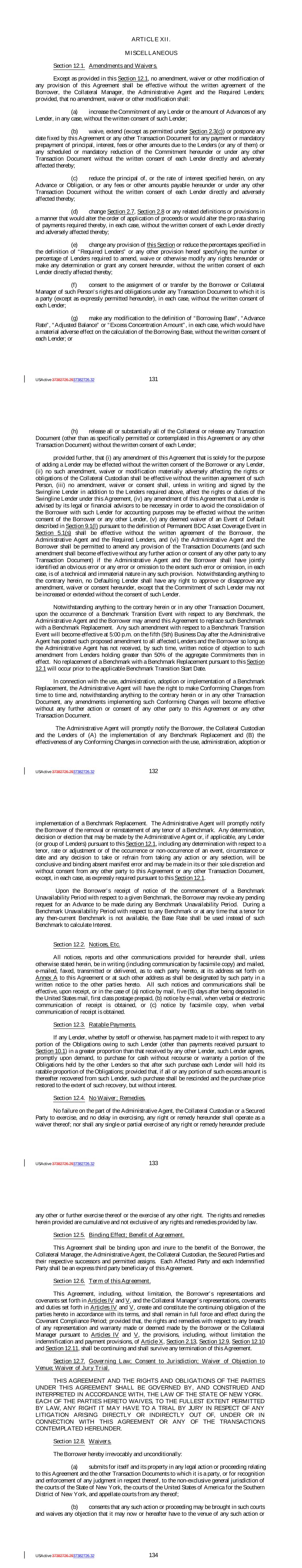 ARTICLE XII. MISCELLANEOUS Section 12.1. Amendments and Waivers. Except as provided in this Section 12.1, no amendment, waiver or other modification of any provision of this Agreement shall be effective without the written agreement of the Borrower, the Collateral Manager, the Administrative Agent and the Required Lenders; provided, that no amendment, waiver or other modification shall: (a) increase the Commitment of any Lender or the amount of Advances of any Lender, in any case, without the written consent of such Lender; (b) waive, extend (except as permitted under Section 2.3(c)) or postpone any date fixed by this Agreement or any other Transaction Document for any payment or mandatory prepayment of principal, interest, fees or other amounts due to the Lenders (or any of them) or any scheduled or mandatory reduction of the Commitment hereunder or under any other Transaction Document without the written consent of each Lender directly and adversely affected thereby; (c) reduce the principal of, or the rate of interest specified herein, on any Advance or Obligation, or any fees or other amounts payable hereunder or under any other Transaction Document without the written consent of each Lender directly and adversely affected thereby; (d) change Section 2.7, Section 2.8 or any related definitions or provisions in a manner that would alter the order of application of proceeds or would alter the pro rata sharing of payments required thereby, in each case, without the written consent of each Lender directly and adversely affected thereby; (e) change any provision of this Section or reduce the percentages specified in the definition of “Required Lenders” or any other provision hereof specifying the number or percentage of Lenders required to amend, waive or otherwise modify any rights hereunder or make any determination or grant any consent hereunder, without the written consent of each Lender directly affected thereby; (f) consent to the assignment of or transfer by the Borrower or Collateral Manager of such Person’s rights and obligations under any Transaction Document to which it is a party (except as expressly permitted hereunder), in each case, without the written consent of each Lender; (g) make any modification to the definition of “Borrowing Base”, “Advance Rate”, “Adjusted Balance” or “Excess Concentration Amount”, in each case, which would have a material adverse effect on the calculation of the Borrowing Base, without the written consent of each Lender; or USActive 37382726.2937382726.32 131 (h) release all or substantially all of the Collateral or release any Transaction Document (other than as specifically permitted or contemplated in this Agreement or any other Transaction Document) without the written consent of each Lender; provided further, that (i) any amendment of this Agreement that is solely for the purpose of adding a Lender may be effected without the written consent of the Borrower or any Lender, (ii) no such amendment, waiver or modification materially adversely affecting the rights or obligations of the Collateral Custodian shall be effective without the written agreement of such Person, (iii) no amendment, waiver or consent shall, unless in writing and signed by the Swingline Lender in addition to the Lenders required above, affect the rights or duties of the Swingline Lender under this Agreement, (iv) any amendment of this Agreement that a Lender is advised by its legal or financial advisors to be necessary in order to avoid the consolidation of the Borrower with such Lender for accounting purposes may be effected without the written consent of the Borrower or any other Lender, (v) any deemed waiver of an Event of Default described in Section 9.1(l) pursuant to the definition of Permanent BDC Asset Coverage Event in Section 5.1(s) shall be effective without the written agreement of the Borrower, the Administrative Agent and the Required Lenders, and (vi) the Administrative Agent and the Borrower shall be permitted to amend any provision of the Transaction Documents (and such amendment shall become effective without any further action or consent of any other party to any Transaction Document) if the Administrative Agent and the Borrower shall have jointly identified an obvious error or any error or omission to the extent such error or omission, in each case, is of a technical and immaterial nature in any such provision. Notwithstanding anything to the contrary herein, no Defaulting Lender shall have any right to approve or disapprove any amendment, waiver or consent hereunder, except that the Commitment of such Lender may not be increased or extended without the consent of such Lender. Notwithstanding anything to the contrary herein or in any other Transaction Document, upon the occurrence of a Benchmark Transition Event with respect to any Benchmark, the Administrative Agent and the Borrower may amend this Agreement to replace such Benchmark with a Benchmark Replacement. Any such amendment with respect to a Benchmark Transition Event will become effective at 5:00 p.m. on the fifth (5th) Business Day after the Administrative Agent has posted such proposed amendment to all affected Lenders and the Borrower so long as the Administrative Agent has not received, by such time, written notice of objection to such amendment from Lenders holding greater than 50% of the aggregate Commitments then in effect. No replacement of a Benchmark with a Benchmark Replacement pursuant to this Section 12.1 will occur prior to the applicable Benchmark Transition Start Date. In connection with the use, administration, adoption or implementation of a Benchmark Replacement, the Administrative Agent will have the right to make Conforming Changes from time to time and, notwithstanding anything to the contrary herein or in any other Transaction Document, any amendments implementing such Conforming Changes will become effective without any further action or consent of an