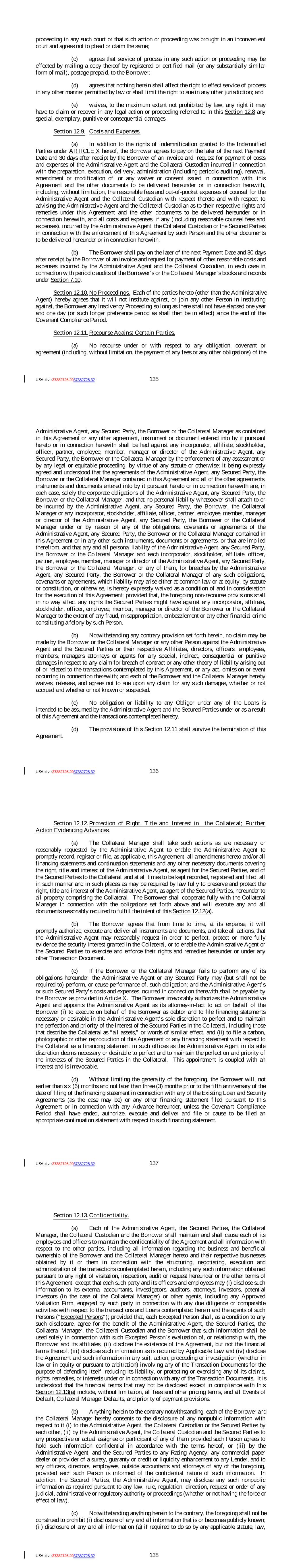 proceeding in any such court or that such action or proceeding was brought in an inconvenient court and agrees not to plead or claim the same; (c) agrees that service of process in any such action or proceeding may be effected by mailing a copy thereof by registered or certified mail (or any substantially similar form of mail), postage prepaid, to the Borrower; (d) agrees that nothing herein shall affect the right to effect service of process in any other manner permitted by law or shall limit the right to sue in any other jurisdiction; and (e) waives, to the maximum extent not prohibited by law, any right it may have to claim or recover in any legal action or proceeding referred to in this Section 12.8 any special, exemplary, punitive or consequential damages. Section 12.9. Costs and Expenses. (a) In addition to the rights of indemnification granted to the Indemnified Parties under ARTICLE X hereof, the Borrower agrees to pay on the later of the next Payment Date and 30 days after receipt by the Borrower of an invoice and request for payment of costs and expenses of the Administrative Agent and the Collateral Custodian incurred in connection with the preparation, execution, delivery, administration (including periodic auditing), renewal, amendment or modification of, or any waiver or consent issued in connection with, this Agreement and the other documents to be delivered hereunder or in connection herewith, including, without limitation, the reasonable fees and out-of-pocket expenses of counsel for the Administrative Agent and the Collateral Custodian with respect thereto and with respect to advising the Administrative Agent and the Collateral Custodian as to their respective rights and remedies under this Agreement and the other documents to be delivered hereunder or in connection herewith, and all costs and expenses, if any (including reasonable counsel fees and expenses), incurred by the Administrative Agent, the Collateral Custodian or the Secured Parties in connection with the enforcement of this Agreement by such Person and the other documents to be delivered hereunder or in connection herewith. (b) The Borrower shall pay on the later of the next Payment Date and 30 days after receipt by the Borrower of an invoice and request for payment of other reasonable costs and expenses incurred by the Administrative Agent and the Collateral Custodian, in each case in connection with periodic audits of the Borrower’s or the Collateral Manager’s books and records under Section 7.10. Section 12.10. No Proceedings. Each of the parties hereto (other than the Administrative Agent) hereby agrees that it will not institute against, or join any other Person in instituting against, the Borrower any Insolvency Proceeding so long as there shall not have elapsed one year and one day (or such longer preference period as shall then be in effect) since the end of the Covenant Compliance Period. Section 12.11. Recourse Against Certain Parties. (a) No recourse under or with respect to any obligation, covenant or agreement (including, without limitation, the payment of any fees or any other obligations) of the USActive 37382726.2937382726.32 135 Administrative Agent, any Secured Party, the Borrower or the Collateral Manager as contained in this Agreement or any other agreement, instrument or document entered into by it pursuant hereto or in connection herewith shall be had against any incorporator, affiliate, stockholder, officer, partner, employee, member, manager or director of the Administrative Agent, any Secured Party, the Borrower or the Collateral Manager by the enforcement of any assessment or by any legal or equitable proceeding, by virtue of any statute or otherwise; it being expressly agreed and understood that the agreements of the Administrative Agent, any Secured Party, the Borrower or the Collateral Manager contained in this Agreement and all of the other agreements, instruments and documents entered into by it pursuant hereto or in connection herewith are, in each case, solely the corporate obligations of the Administrative Agent, any Secured Party, the Borrower or the Collateral Manager, and that no personal liability whatsoever shall attach to or be incurred by the Administrative Agent, any Secured Party, the Borrower, the Collateral Manager or any incorporator, stockholder, affiliate, officer, partner, employee, member, manager or director of the Administrative Agent, any Secured Party, the Borrower or the Collateral Manager under or by reason of any of the obligations, covenants or agreements of the Administrative Agent, any Secured Party, the Borrower or the Collateral Manager contained in this Agreement or in any other such instruments, documents or agreements, or that are implied therefrom, and that any and all personal liability of the Administrative Agent, any Secured Party, the Borrower or the Collateral Manager and each incorporator, stockholder, affiliate, officer, partner, employee, member, manager or director of the Administrative Agent, any Secured Party, the Borrower or the Collateral Manager, or any of them, for breaches by the Administrative Agent, any Secured Party, the Borrower or the Collateral Manager of any such obligations, covenants or agreements, which liability may arise either at common law or at equity, by statute or constitution, or otherwise, is hereby expressly waived as a condition of and in consideration for the execution of this Agreement; provided that, the foregoing non-recourse provisions shall in no way affect any rights the Secured Parties might have against any incorporator, affiliate, stockholder, officer, employee, member, manager or director of the Borrower or the Collateral Manager to the extent of any fraud, misappropriation, embezzlement or any other financial crime constituting a felony by such Person. (b) Notwithstanding any contrary provision set forth herein, no claim may be made by the Borrower or the Collateral Manager or any other Pers