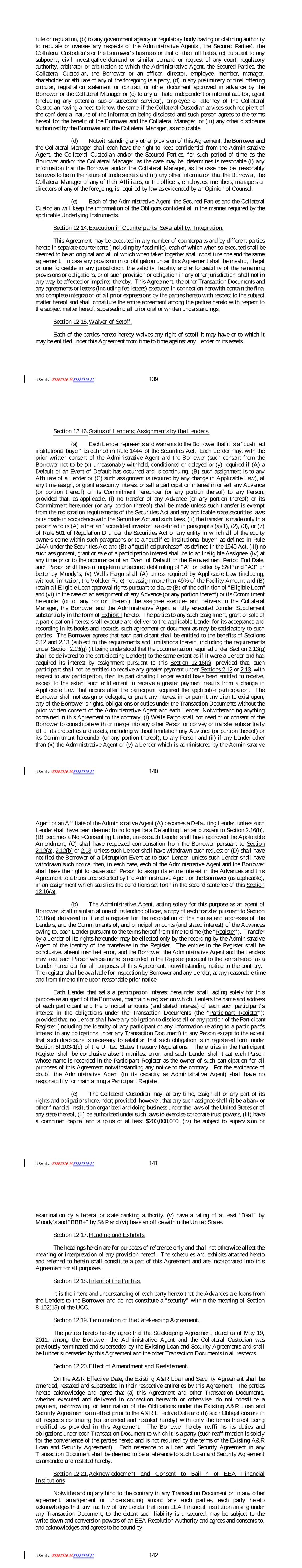 rule or regulation, (b) to any government agency or regulatory body having or claiming authority to regulate or oversee any respects of the Administrative Agents’, the Secured Parties’, the Collateral Custodian’s or the Borrower’s business or that of their affiliates, (c) pursuant to any subpoena, civil investigative demand or similar demand or request of any court, regulatory authority, arbitrator or arbitration to which the Administrative Agent, the Secured Parties, the Collateral Custodian, the Borrower or an officer, director, employee, member, manager, shareholder or affiliate of any of the foregoing is a party, (d) in any preliminary or final offering circular, registration statement or contract or other document approved in advance by the Borrower or the Collateral Manager or (e) to any affiliate, independent or internal auditor, agent (including any potential sub-or-successor servicer), employee or attorney of the Collateral Custodian having a need to know the same, if the Collateral Custodian advises such recipient of the confidential nature of the information being disclosed and such person agrees to the terms hereof for the benefit of the Borrower and the Collateral Manager; or (iii) any other disclosure authorized by the Borrower and the Collateral Manager, as applicable. (d) Notwithstanding any other provision of this Agreement, the Borrower and the Collateral Manager shall each have the right to keep confidential from the Administrative Agent, the Collateral Custodian and/or the Secured Parties, for such period of time as the Borrower and/or the Collateral Manager, as the case may be, determines is reasonable (i) any information that the Borrower and/or the Collateral Manager, as the case may be, reasonably believes to be in the nature of trade secrets and (ii) any other information that the Borrower, the Collateral Manager or any of their Affiliates, or the officers, employees, members, managers or directors of any of the foregoing, is required by law as evidenced by an Opinion of Counsel. (e) Each of the Administrative Agent, the Secured Parties and the Collateral Custodian will keep the information of the Obligors confidential in the manner required by the applicable Underlying Instruments. Section 12.14. Execution in Counterparts; Severability; Integration. This Agreement may be executed in any number of counterparts and by different parties hereto in separate counterparts (including by facsimile), each of which when so executed shall be deemed to be an original and all of which when taken together shall constitute one and the same agreement. In case any provision in or obligation under this Agreement shall be invalid, illegal or unenforceable in any jurisdiction, the validity, legality and enforceability of the remaining provisions or obligations, or of such provision or obligation in any other jurisdiction, shall not in any way be affected or impaired thereby. This Agreement, the other Transaction Documents and any agreements or letters (including fee letters) executed in connection herewith contain the final and complete integration of all prior expressions by the parties hereto with respect to the subject matter hereof and shall constitute the entire agreement among the parties hereto with respect to the subject matter hereof, superseding all prior oral or written understandings. Section 12.15. Waiver of Setoff. Each of the parties hereto hereby waives any right of setoff it may have or to which it may be entitled under this Agreement from time to time against any Lender or its assets. USActive 37382726.2937382726.32 139 Section 12.16. Status of Lenders; Assignments by the Lenders. (a) Each Lender represents and warrants to the Borrower that it is a “qualified institutional buyer” as defined in Rule 144A of the Securities Act. Each Lender may, with the prior written consent of the Administrative Agent and the Borrower (such consent from the Borrower not to be (x) unreasonably withheld, conditioned or delayed or (y) required if (A) a Default or an Event of Default has occurred and is continuing, (B) such assignment is to any Affiliate of a Lender or (C) such assignment is required by any change in Applicable Law), at any time assign, or grant a security interest or sell a participation interest in or sell any Advance (or portion thereof) or its Commitment hereunder (or any portion thereof) to any Person; provided that, as applicable, (i) no transfer of any Advance (or any portion thereof) or its Commitment hereunder (or any portion thereof) shall be made unless such transfer is exempt from the registration requirements of the Securities Act and any applicable state securities laws or is made in accordance with the Securities Act and such laws, (ii) the transfer is made only to a person who is (A) either an “accredited investor” as defined in paragraphs (a)(1), (2), (3), or (7) of Rule 501 of Regulation D under the Securities Act or any entity in which all of the equity owners come within such paragraphs or to a “qualified institutional buyer” as defined in Rule 144A under the Securities Act and (B) a “qualified purchaser” as defined in the 1940 Act, (iii) no such assignment, grant or sale of a participation interest shall be to an Ineligible Assignee, (iv) at any time prior to the occurrence of an Event of Default or the Reinvestment Period End Date, such Person shall have a long-term unsecured debt rating of “A” or better by S&P and “A3” or better by Moody’s, (v) Wells Fargo shall (A) unless required by Applicable Law (including, without limitation, the Volcker Rule) not assign more than 49% of the Facility Amount and (B) retain all Eligible Loan approval rights pursuant to clause (B) of the definition of “Eligible Loan” and (vi) in the case of an assignment of any Advance (or any portion thereof) or its Commitment hereunder (or of any portion thereof) the assignee executes and delivers to the Collateral Manager, the Borrower an