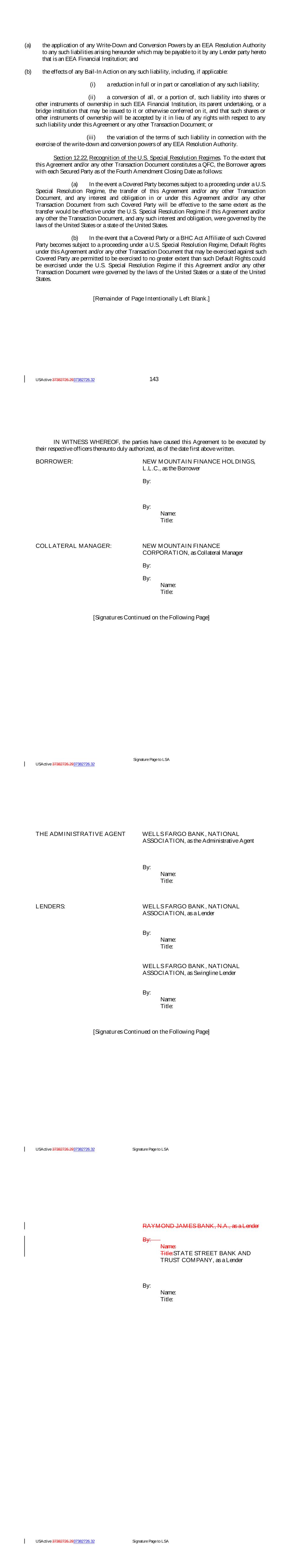 (a) the application of any Write-Down and Conversion Powers by an EEA Resolution Authority to any such liabilities arising hereunder which may be payable to it by any Lender party hereto that is an EEA Financial Institution; and (b) the effects of any Bail-In Action on any such liability, including, if applicable: (i) a reduction in full or in part or cancellation of any such liability; (ii) a conversion of all, or a portion of, such liability into shares or other instruments of ownership in such EEA Financial Institution, its parent undertaking, or a bridge institution that may be issued to it or otherwise conferred on it, and that such shares or other instruments of ownership will be accepted by it in lieu of any rights with respect to any such liability under this Agreement or any other Transaction Document; or (iii) the variation of the terms of such liability in connection with the exercise of the write-down and conversion powers of any EEA Resolution Authority. Section 12.22. Recognition of the U.S. Special Resolution Regimes. To the extent that this Agreement and/or any other Transaction Document constitutes a QFC, the Borrower agrees with each Secured Party as of the Fourth Amendment Closing Date as follows: (a) In the event a Covered Party becomes subject to a proceeding under a U.S. Special Resolution Regime, the transfer of this Agreement and/or any other Transaction Document, and any interest and obligation in or under this Agreement and/or any other Transaction Document from such Covered Party will be effective to the same extent as the transfer would be effective under the U.S. Special Resolution Regime if this Agreement and/or any other the Transaction Document, and any such interest and obligation, were governed by the laws of the United States or a state of the United States. (b) In the event that a Covered Party or a BHC Act Affiliate of such Covered Party becomes subject to a proceeding under a U.S. Special Resolution Regime, Default Rights under this Agreement and/or any other Transaction Document that may be exercised against such Covered Party are permitted to be exercised to no greater extent than such Default Rights could be exercised under the U.S. Special Resolution Regime if this Agreement and/or any other Transaction Document were governed by the laws of the United States or a state of the United States. [Remainder of Page Intentionally Left Blank.] USActive 37382726.2937382726.32 143 IN WITNESS WHEREOF, the parties have caused this Agreement to be executed by their respective officers thereunto duly authorized, as of the date first above written. BORROWER: NEW MOUNTAIN FINANCE HOLDINGS, L.L.C., as the Borrower By: By: Name: Title: COLLATERAL MANAGER: NEW MOUNTAIN FINANCE CORPORATION, as Collateral Manager By: By: Name: Title: [Signatures Continued on the Following Page] Signature Page to LSA USActive 37382726.2937382726.32 THE ADMINISTRATIVE AGENT WELLS FARGO BANK, NATIONAL ASSOCIATION, as the Administrative Agent By: Name: Title: LENDERS: WELLS FARGO BANK, NATIONAL ASSOCIATION, as a Lender By: Name: Title: WELLS FARGO BANK, NATIONAL ASSOCIATION, as Swingline Lender By: Name: Title: [Signatures Continued on the Following Page] USActive 37382726.2937382726.32 Signature Page to LSA RAYMOND JAMES BANK, N.A., as a Lender By: Name: Title:STATE STREET BANK AND TRUST COMPANY, as a Lender By: Name: Title: USActive 37382726.2937382726.32 Signature Page to LSA