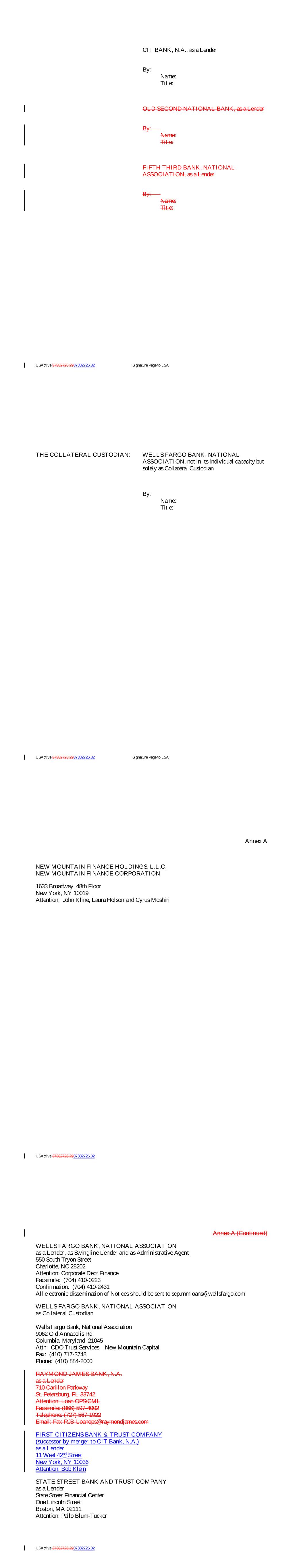 CIT BANK, N.A., as a Lender By: Name: Title: OLD SECOND NATIONAL BANK, as a Lender By: Name: Title: FIFTH THIRD BANK, NATIONAL ASSOCIATION, as a Lender By: Name: Title: USActive 37382726.2937382726.32 Signature Page to LSA THE COLLATERAL CUSTODIAN: WELLS FARGO BANK, NATIONAL ASSOCIATION, not in its individual capacity but solely as Collateral Custodian By: Name: Title: USActive 37382726.2937382726.32 Signature Page to LSA Annex A NEW MOUNTAIN FINANCE HOLDINGS, L.L.C. NEW MOUNTAIN FINANCE CORPORATION 1633 Broadway, 48th Floor New York, NY 10019 Attention: John Kline, Laura Holson and Cyrus Moshiri USActive 37382726.2937382726.32 Annex A (Continued) WELLS FARGO BANK, NATIONAL ASSOCIATION as a Lender, as Swingline Lender and as Administrative Agent 550 South Tryon Street Charlotte, NC 28202 Attention: Corporate Debt Finance Facsimile: (704) 410-0223 Confirmation: (704) 410-2431 All electronic dissemination of Notices should be sent to scp.mmloans@wellsfargo.com WELLS FARGO BANK, NATIONAL ASSOCIATION as Collateral Custodian Wells Fargo Bank, National Association 9062 Old Annapolis Rd. Columbia, Maryland 21045 Attn: CDO Trust Services—New Mountain Capital Fax: (410) 717-3748 Phone: (410) 884-2000 RAYMOND JAMES BANK, N.A. as a Lender 710 Carillon Parkway St. Petersburg, FL 33742 Attention: Loan OPS/CML Facsimile: (866) 597-4002 Telephone: (727) 567-1922 Email: Fax-RJB-Loanops@raymondjames.com FIRST-CITIZENS BANK & TRUST COMPANY (successor by merger to CIT Bank, N.A.) as a Lender 11 West 42nd Street New York, NY 10036 Attention: Bob Klein STATE STREET BANK AND TRUST COMPANY as a Lender State Street Financial Center One Lincoln Street Boston, MA 02111 Attention: Pallo Blum-Tucker USActive 37382726.2937382726.32