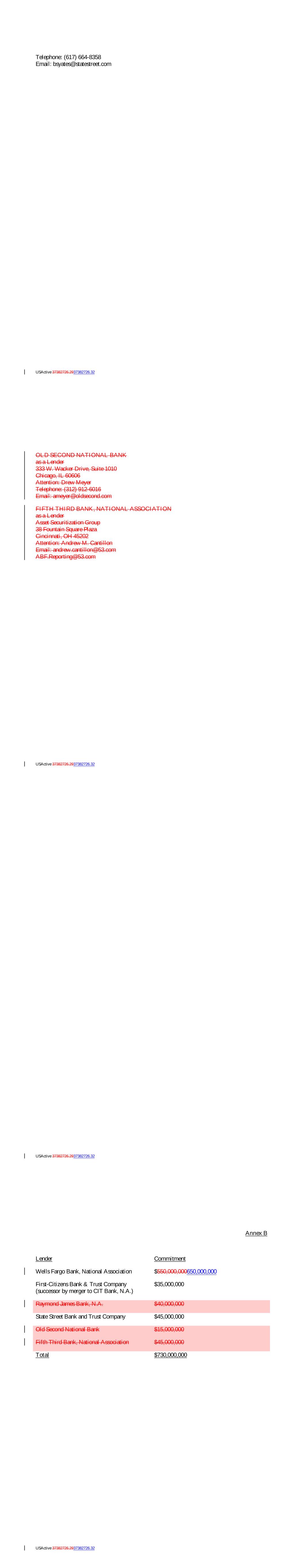 Telephone: (617) 664-8358 Email: bsyates@statestreet.com USActive 37382726.2937382726.32 OLD SECOND NATIONAL BANK as a Lender 333 W. Wacker Drive, Suite 1010 Chicago, IL 60606 Attention: Drew Meyer Telephone: (312) 912-6016 Email: ameyer@oldsecond.com FIFTH THIRD BANK, NATIONAL ASSOCIATION as a Lender Asset Securitization Group 38 Fountain Square Plaza Cincinnati, OH 45202 Attention: Andrew M. Cantillon Email: andrew.cantillon@53.com ABF.Reporting@53.com USActive 37382726.2937382726.32 USActive 37382726.2937382726.32 USActive 37382726.2937382726.32 $40,000,000 Wells Fargo Bank, National Association State Street Bank and Trust Company $550,000,000650,000,000 $45,000,000 Lender Old Second National Bank $15,000,000 First-Citizens Bank & Trust Company (successor by merger to CIT Bank, N.A.) Commitment Fifth Third Bank, National Association $35,000,000 $45,000,000 Annex B Total $730,000,000 Raymond James Bank, N.A.
