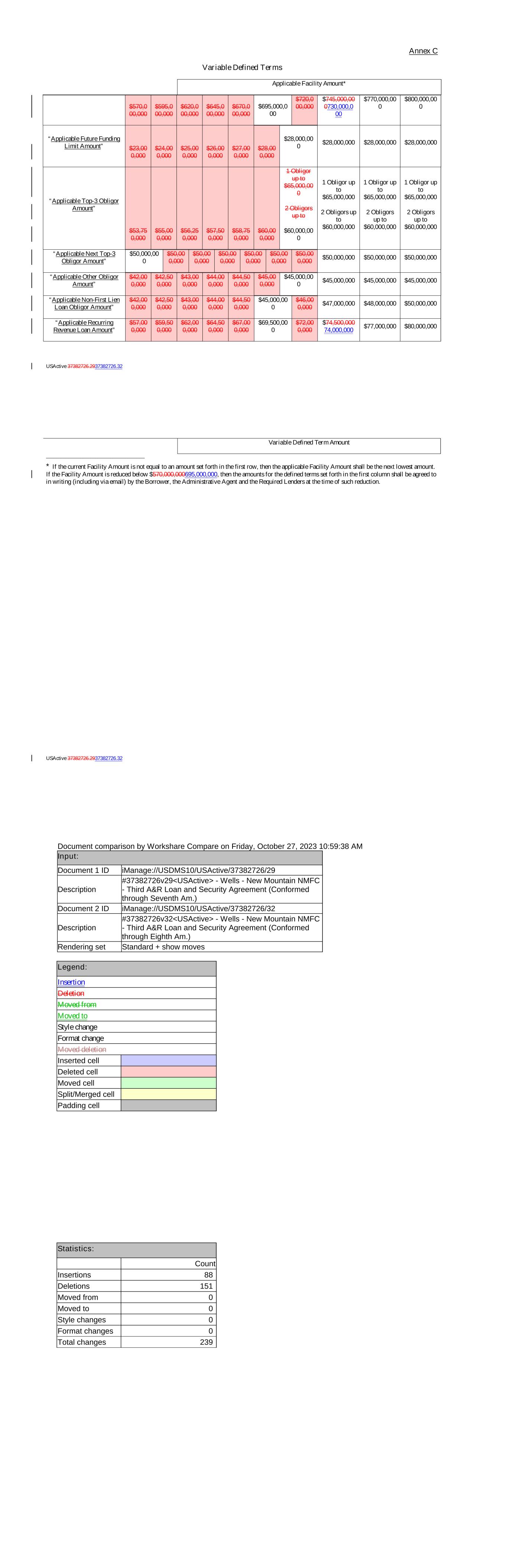 USActive 37382726.2937382726.32 $645,0 00,000 $50,00 0,000 $26,00 0,000 $50,00 0,000 Annex C Variable Defined Terms $50,00 0,000 $27,00 0,000 $50,00 0,000 $670,0 00,000 $50,00 0,000 $28,00 0,000 $50,000,000 $50,000,000 $28,000,00 0 $50,000,000 $695,000,0 00 $28,000,000 “Applicable Other Obligor Amount” $42,00 0,000 $28,000,000 $42,50 0,000 $720,0 00,000 $43,00 0,000 $28,000,000 $44,00 0,000 $44,50 0,000 $45,00 0,000 $745,000,00 0730,000,0 00 $45,000,00 0 “Applicable Top-3 Obligor Amount” $45,000,000 $45,000,000 $53,75 0,000 $45,000,000 $770,000,00 0 $55,00 0,000 “Applicable Non-First Lien Loan Obligor Amount” $570,0 00,000 $42,00 0,000 $56,25 0,000 $42,50 0,000 $800,000,00 0 $43,00 0,000 $57,50 0,000 $44,00 0,000 $44,50 0,000 $58,75 0,000 $45,000,00 0 $46,00 0,000 $60,00 0,000 $47,000,000 $595,0 00,000 $48,000,000 1 Obligor up to $65,000,00 0 2 Obligors up to $60,000,00 0 $50,000,000 “Applicable Future Funding Limit Amount” 1 Obligor up to $65,000,000 2 Obligors up to $60,000,000 “Applicable Recurring Revenue Loan Amount” $57,00 0,000 1 Obligor up to $65,000,000 2 Obligors up to $60,000,000 $59,50 0,000 $23,00 0,000 $62,00 0,000 1 Obligor up to $65,000,000 2 Obligors up to $60,000,000 $64,50 0,000 $620,0 00,000 $67,00 0,000 $69,500,00 0 $24,00 0,000 $72,00 0,000 “Applicable Next Top-3 Obligor Amount” $74,500,000 74,000,000 Applicable Facility Amount* $77,000,000 $50,000,00 0 $80,000,000 $25,00 0,000 $50,00 0,000 USActive 37382726.2937382726.32 Variable Defined Term Amount ________________________________________ * If the current Facility Amount is not equal to an amount set forth in the first row, then the applicable Facility Amount shall be the next lowest amount. If the Facility Amount is reduced below $570,000,000695,000,000, then the amounts for the defined terms set forth in the first column shall be agreed to in writing (including via email) by the Borrower, the Administrative Agent and the Required Lenders at the time of such reduction. Document 1 ID iManage://USDMS10/USActive/37382726/32 Moved from Moved to iManage://USDMS10/USActive/37382726/29 Description Style change #37382726v32<USActive> - Wells - New Mountain NMFC - Third A&R Loan and Security Agreement (Conformed through Eighth Am.) Format change Moved deletion Input: Rendering set Inserted cell Description Standard + show moves Deleted cell #37382726v29<USActive> - Wells - New Mountain NMFC - Third A&R Loan and Security Agreement (Conformed through Seventh Am.) Moved cell Legend: Split/Merged cell Insertion Document comparison by Workshare Compare on Friday, October 27, 2023 10:59:38 AM Padding cell Document 2 ID Deletion Moved from 0 Statistics: Moved to Insertions 0 88 Style changes 0 Format changes Deletions 0 151 Total changes 239 Count