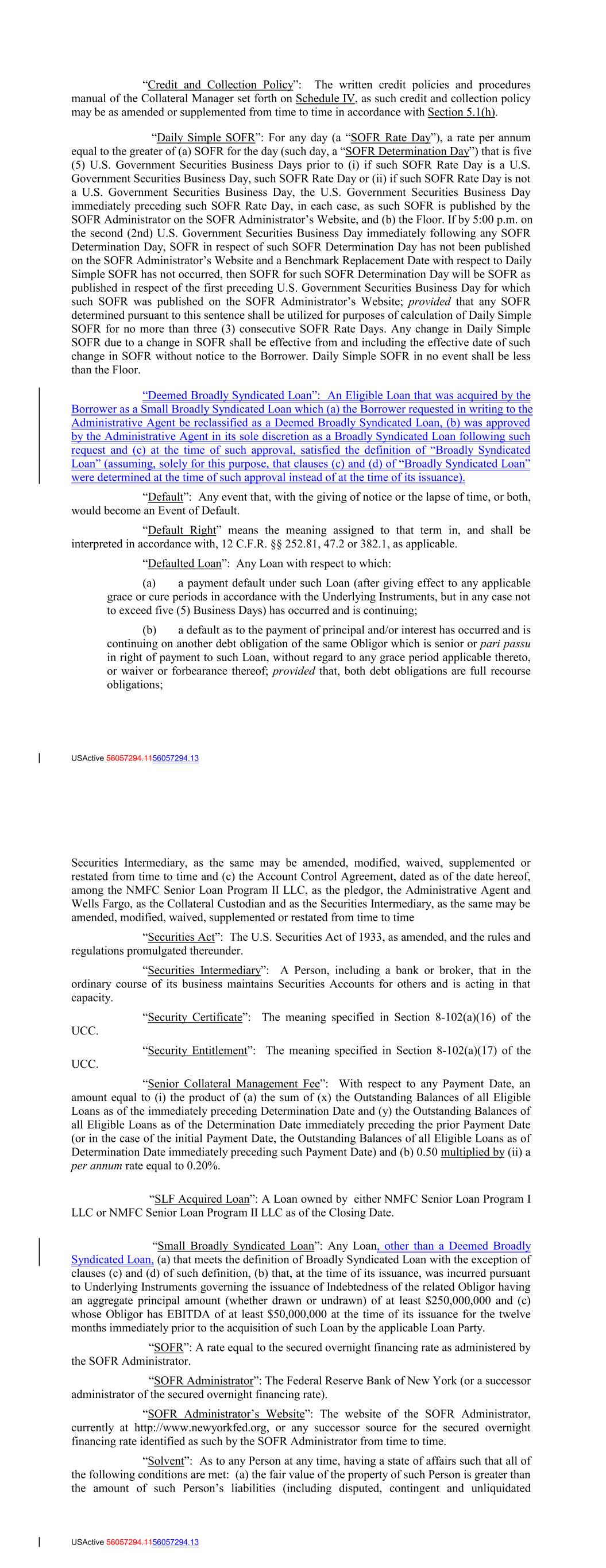 “Credit and Collection Policy”: The written credit policies and procedures manual of the Collateral Manager set forth on Schedule IV, as such credit and collection policy may be as amended or supplemented from time to time in accordance with Section 5.1(h). “Daily Simple SOFR”: For any day (a “SOFR Rate Day”), a rate per annum equal to the greater of (a) SOFR for the day (such day, a “SOFR Determination Day”) that is five (5) U.S. Government Securities Business Days prior to (i) if such SOFR Rate Day is a U.S. Government Securities Business Day, such SOFR Rate Day or (ii) if such SOFR Rate Day is not a U.S. Government Securities Business Day, the U.S. Government Securities Business Day immediately preceding such SOFR Rate Day, in each case, as such SOFR is published by the SOFR Administrator on the SOFR Administrator’s Website, and (b) the Floor. If by 5:00 p.m. on the second (2nd) U.S. Government Securities Business Day immediately following any SOFR Determination Day, SOFR in respect of such SOFR Determination Day has not been published on the SOFR Administrator’s Website and a Benchmark Replacement Date with respect to Daily Simple SOFR has not occurred, then SOFR for such SOFR Determination Day will be SOFR as published in respect of the first preceding U.S. Government Securities Business Day for which such SOFR was published on the SOFR Administrator’s Website; provided that any SOFR determined pursuant to this sentence shall be utilized for purposes of calculation of Daily Simple SOFR for no more than three (3) consecutive SOFR Rate Days. Any change in Daily Simple SOFR due to a change in SOFR shall be effective from and including the effective date of such change in SOFR without notice to the Borrower. Daily Simple SOFR in no event shall be less than the Floor. “Deemed Broadly Syndicated Loan”: An Eligible Loan that was acquired by the Borrower as a Small Broadly Syndicated Loan which (a) the Borrower requested in writing to the Administrative Agent be reclassified as a Deemed Broadly Syndicated Loan, (b) was approved by the Administrative Agent in its sole discretion as a Broadly Syndicated Loan following such request and (c) at the time of such approval, satisfied the definition of “Broadly Syndicated Loan” (assuming, solely for this purpose, that clauses (c) and (d) of “Broadly Syndicated Loan” were determined at the time of such approval instead of at the time of its issuance). “Default”: Any event that, with the giving of notice or the lapse of time, or both, would become an Event of Default. “Default Right” means the meaning assigned to that term in, and shall be interpreted in accordance with, 12 C.F.R. §§ 252.81, 47.2 or 382.1, as applicable. “Defaulted Loan”: Any Loan with respect to which: (a) a payment default under such Loan (after giving effect to any applicable grace or cure periods in accordance with the Underlying Instruments, but in any case not to exceed five (5) Business Days) has occurred and is continuing; (b) a default as to the payment of principal and/or interest has occurred and is continuing on another debt obligation of the same Obligor which is senior or pari passu in right of payment to such Loan, without regard to any grace period applicable thereto, or waiver or forbearance thereof; provided that, both debt obligations are full recourse obligations; USActive 56057294.1156057294.13 Securities Intermediary, as the same may be amended, modified, waived, supplemented or restated from time to time and (c) the Account Control Agreement, dated as of the date hereof, among the NMFC Senior Loan Program II LLC, as the pledgor, the Administrative Agent and Wells Fargo, as the Collateral Custodian and as the Securities Intermediary, as the same may be amended, modified, waived, supplemented or restated from time to time “Securities Act”: The U.S. Securities Act of 1933, as amended, and the rules and regulations promulgated thereunder. “Securities Intermediary”: A Person, including a bank or broker, that in the ordinary course of its business maintains Securities Accounts for others and is acting in that capacity. “Security Certificate”: The meaning specified in Section 8-102(a)(16) of the UCC. “Security Entitlement”: The meaning specified in Section 8-102(a)(17) of the UCC. “Senior Collateral Management Fee”: With respect to any Payment Date, an amount equal to (i) the product of (a) the sum of (x) the Outstanding Balances of all Eligible Loans as of the immediately preceding Determination Date and (y) the Outstanding Balances of all Eligible Loans as of the Determination Date immediately preceding the prior Payment Date (or in the case of the initial Payment Date, the Outstanding Balances of all Eligible Loans as of Determination Date immediately preceding such Payment Date) and (b) 0.50 multiplied by (ii) a per annum rate equal to 0.20%. “SLF Acquired Loan”: A Loan owned by either NMFC Senior Loan Program I LLC or NMFC Senior Loan Program II LLC as of the Closing Date. “Small Broadly Syndicated Loan”: Any Loan, other than a Deemed Broadly Syndicated Loan, (a) that meets the definition of Broadly Syndicated Loan with the exception of clauses (c) and (d) of such definition, (b) that, at the time of its issuance, was incurred pursuant to Underlying Instruments governing the issuance of Indebtedness of the related Obligor having an aggregate principal amount (whether drawn or undrawn) of at least $250,000,000 and (c) whose Obligor has EBITDA of at least $50,000,000 at the time of its issuance for the twelve months immediately prior to the acquisition of such Loan by the applicable Loan Party. “SOFR”: A rate equal to the secured overnight financing rate as administered by the SOFR Administrator. “SOFR Administrator”: The Federal Reserve Bank of New York (or a successor administrator of the secured overnight financing rate). “SOFR Administrator’s Website”: The website of the SO