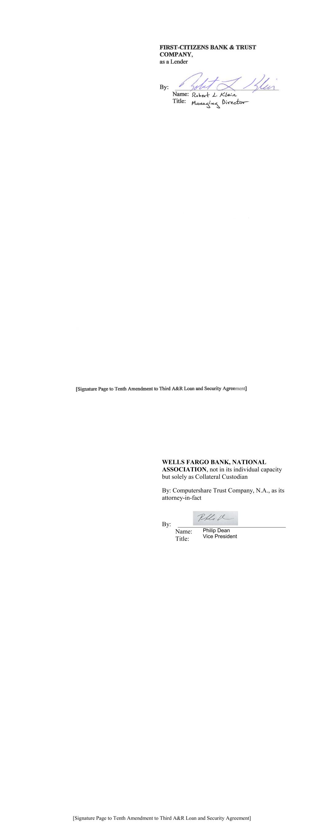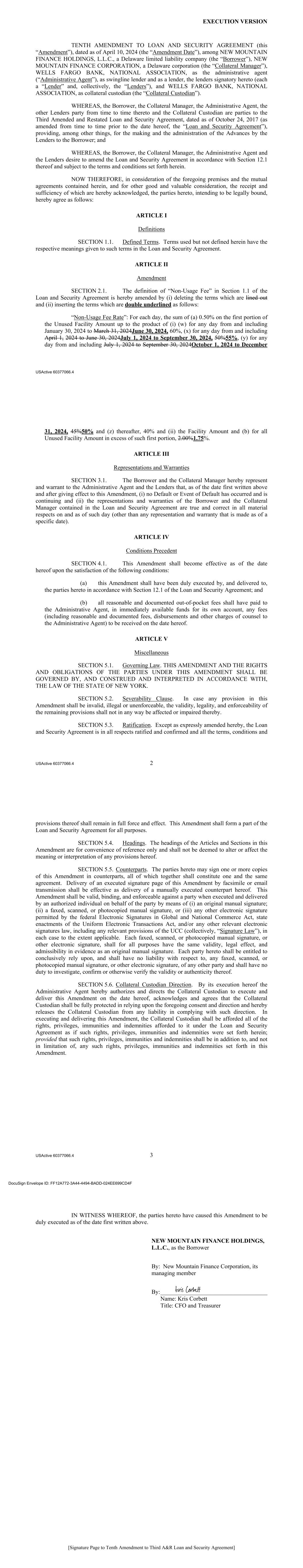 EXECUTION VERSION USActive 60377066.4 TENTH AMENDMENT TO LOAN AND SECURITY AGREEMENT (this “Amendment”), dated as of April 10, 2024 (the “Amendment Date”), among NEW MOUNTAIN FINANCE HOLDINGS, L.L.C., a Delaware limited liability company (the “Borrower”), NEW MOUNTAIN FINANCE CORPORATION, a Delaware corporation (the “Collateral Manager”), WELLS FARGO BANK, NATIONAL ASSOCIATION, as the administrative agent (“Administrative Agent”), as swingline lender and as a lender, the lenders signatory hereto (each a “Lender” and, collectively, the “Lenders”), and WELLS FARGO BANK, NATIONAL ASSOCIATION, as collateral custodian (the “Collateral Custodian”). WHEREAS, the Borrower, the Collateral Manager, the Administrative Agent, the other Lenders party from time to time thereto and the Collateral Custodian are parties to the Third Amended and Restated Loan and Security Agreement, dated as of October 24, 2017 (as amended from time to time prior to the date hereof, the “Loan and Security Agreement”), providing, among other things, for the making and the administration of the Advances by the Lenders to the Borrower; and WHEREAS, the Borrower, the Collateral Manager, the Administrative Agent and the Lenders desire to amend the Loan and Security Agreement in accordance with Section 12.1 thereof and subject to the terms and conditions set forth herein. NOW THEREFORE, in consideration of the foregoing premises and the mutual agreements contained herein, and for other good and valuable consideration, the receipt and sufficiency of which are hereby acknowledged, the parties hereto, intending to be legally bound, hereby agree as follows: ARTICLE I Definitions SECTION 1.1. Defined Terms. Terms used but not defined herein have the respective meanings given to such terms in the Loan and Security Agreement. ARTICLE II Amendment SECTION 2.1. The definition of “Non-Usage Fee” in Section 1.1 of the Loan and Security Agreement is hereby amended by (i) deleting the terms which are lined out and (ii) inserting the terms which are double underlined as follows: “Non-Usage Fee Rate”: For each day, the sum of (a) 0.50% on the first portion of the Unused Facility Amount up to the product of (i) (w) for any day from and including January 30, 2024 to March 31, 2024June 30, 2024, 60%, (x) for any day from and including April 1, 2024 to June 30, 2024July 1, 2024 to September 30, 2024, 50%55%, (y) for any day from and including July 1, 2024 to September 30, 2024October 1, 2024 to December USActive 60377066.4 2 31, 2024, 45%50% and (z) thereafter, 40% and (ii) the Facility Amount and (b) for all Unused Facility Amount in excess of such first portion, 2.00%1.75%. ARTICLE III Representations and Warranties SECTION 3.1. The Borrower and the Collateral Manager hereby represent and warrant to the Administrative Agent and the Lenders that, as of the date first written above and after giving effect to this Amendment, (i) no Default or Event of Default has occurred and is continuing and (ii) the representations and warranties of the Borrower and the Collateral Manager contained in the Loan and Security Agreement are true and correct in all material respects on and as of such day (other than any representation and warranty that is made as of a specific date). ARTICLE IV Conditions Precedent SECTION 4.1. This Amendment shall become effective as of the date hereof upon the satisfaction of the following conditions: (a) this Amendment shall have been duly executed by, and delivered to, the parties hereto in accordance with Section 12.1 of the Loan and Security Agreement; and (b) all reasonable and documented out-of-pocket fees shall have paid to the Administrative Agent, in immediately available funds for its own account, any fees (including reasonable and documented fees, disbursements and other charges of counsel to the Administrative Agent) to be received on the date hereof. ARTICLE V Miscellaneous SECTION 5.1. Governing Law. THIS AMENDMENT AND THE RIGHTS AND OBLIGATIONS OF THE PARTIES UNDER THIS AMENDMENT SHALL BE GOVERNED BY, AND CONSTRUED AND INTERPRETED IN ACCORDANCE WITH, THE LAW OF THE STATE OF NEW YORK. SECTION 5.2. Severability Clause. In case any provision in this Amendment shall be invalid, illegal or unenforceable, the validity, legality, and enforceability of the remaining provisions shall not in any way be affected or impaired thereby. SECTION 5.3. Ratification. Except as expressly amended hereby, the Loan and Security Agreement is in all respects ratified and confirmed and all the terms, conditions and USActive 60377066.4 3 provisions thereof shall remain in full force and effect. This Amendment shall form a part of the Loan and Security Agreement for all purposes. SECTION 5.4. Headings. The headings of the Articles and Sections in this Amendment are for convenience of reference only and shall not be deemed to alter or affect the meaning or interpretation of any provisions hereof. SECTION 5.5. Counterparts. The parties hereto may sign one or more copies of this Amendment in counterparts, all of which together shall constitute one and the same agreement. Delivery of an executed signature page of this Amendment by facsimile or email transmission shall be effective as delivery of a manually executed counterpart hereof. This Amendment shall be valid, binding, and enforceable against a party when executed and delivered by an authorized individual on behalf of the party by means of (i) an original manual signature; (ii) a faxed, scanned, or photocopied manual signature, or (iii) any other electronic signature permitted by the federal Electronic Signatures in Global and National Commerce Act, state enactments of the Uniform Electronic Transactions Act, and/or any other relevant electronic signatures law, including any relevant provisions of the UCC (collectively, “Signature Law”), in each case to the extent applicable. Each faxed, scanned, or photocopied manual signature, or other electro